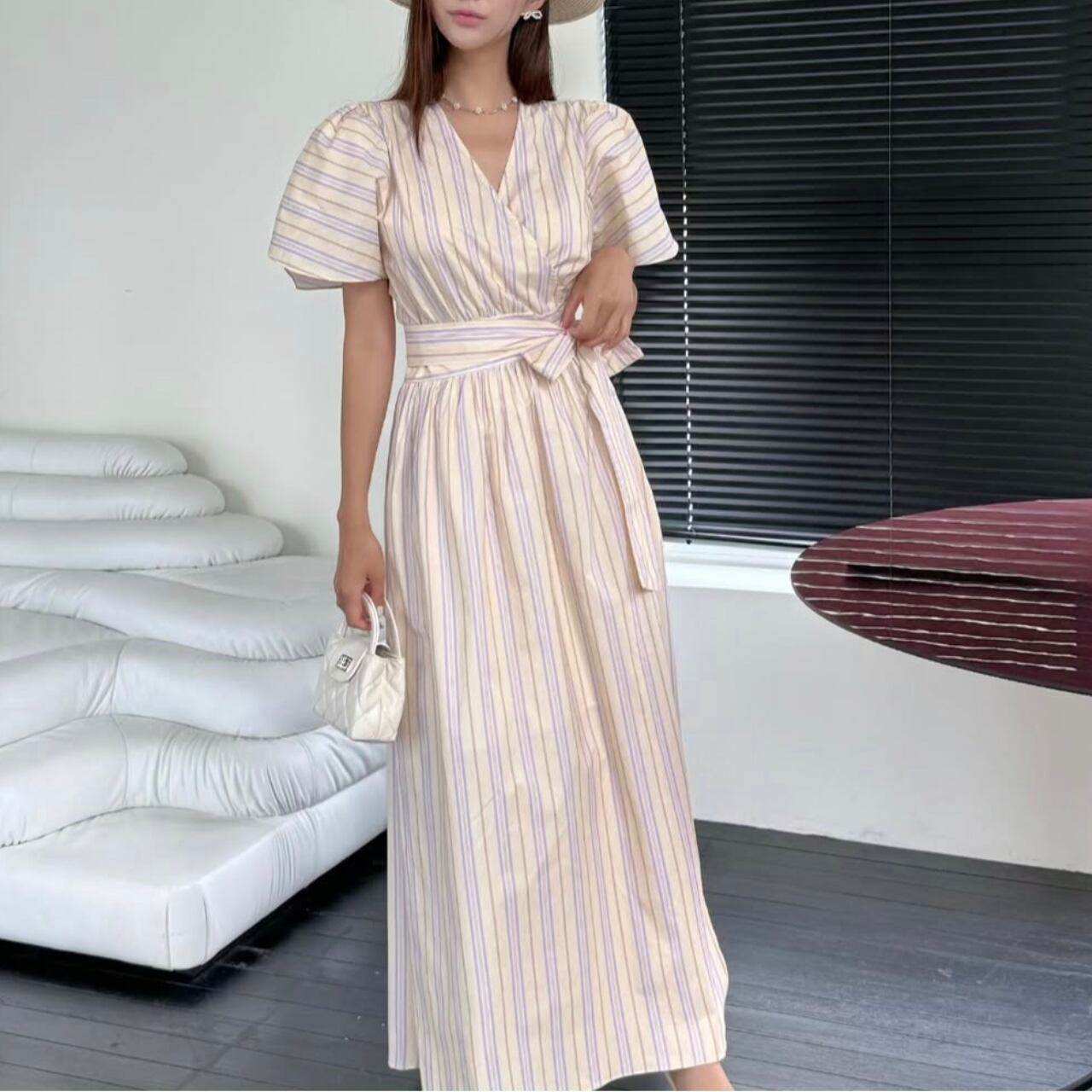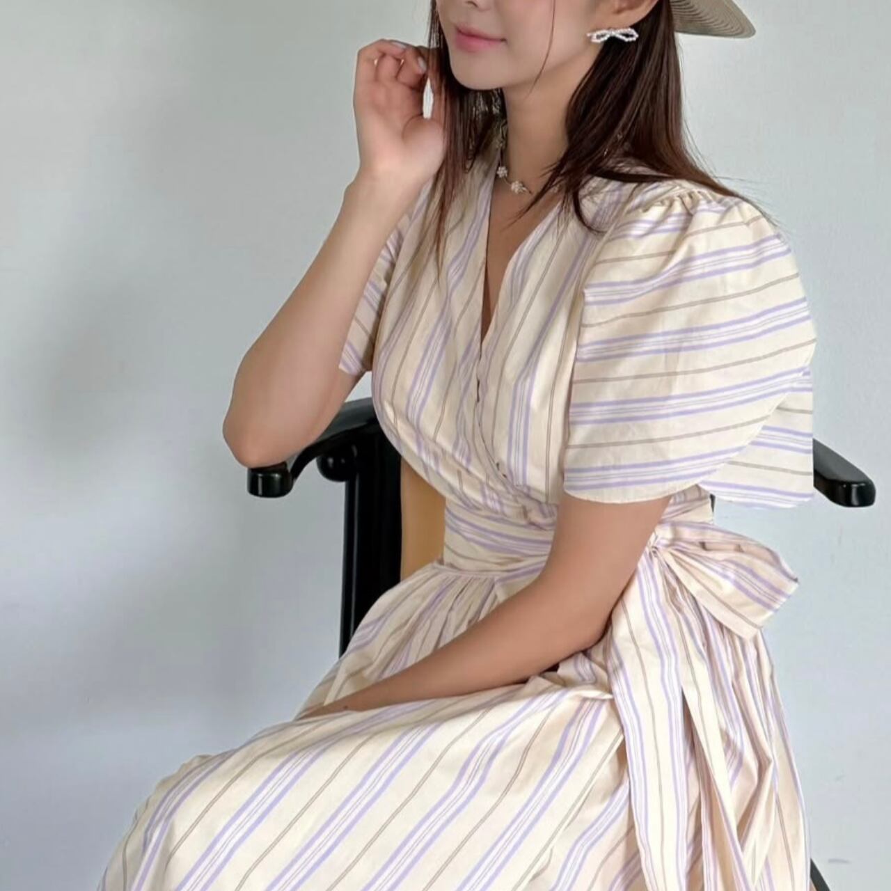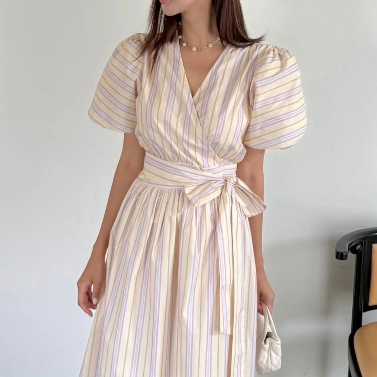 縦ストライプが美しいスタイルアップ効果を発揮し、Vネックデザインがデコルテを上品に魅せます。ウエストのリボンベルトで自然な体型カバーができ、どんな体型の方にも美しいシルエットを実現。