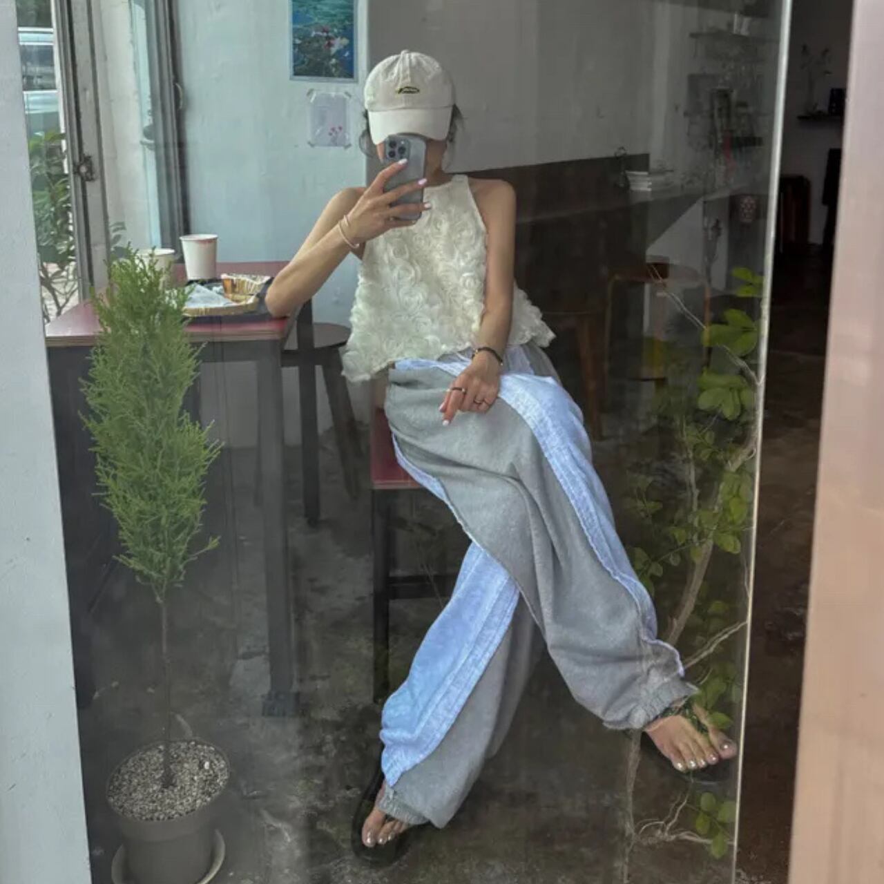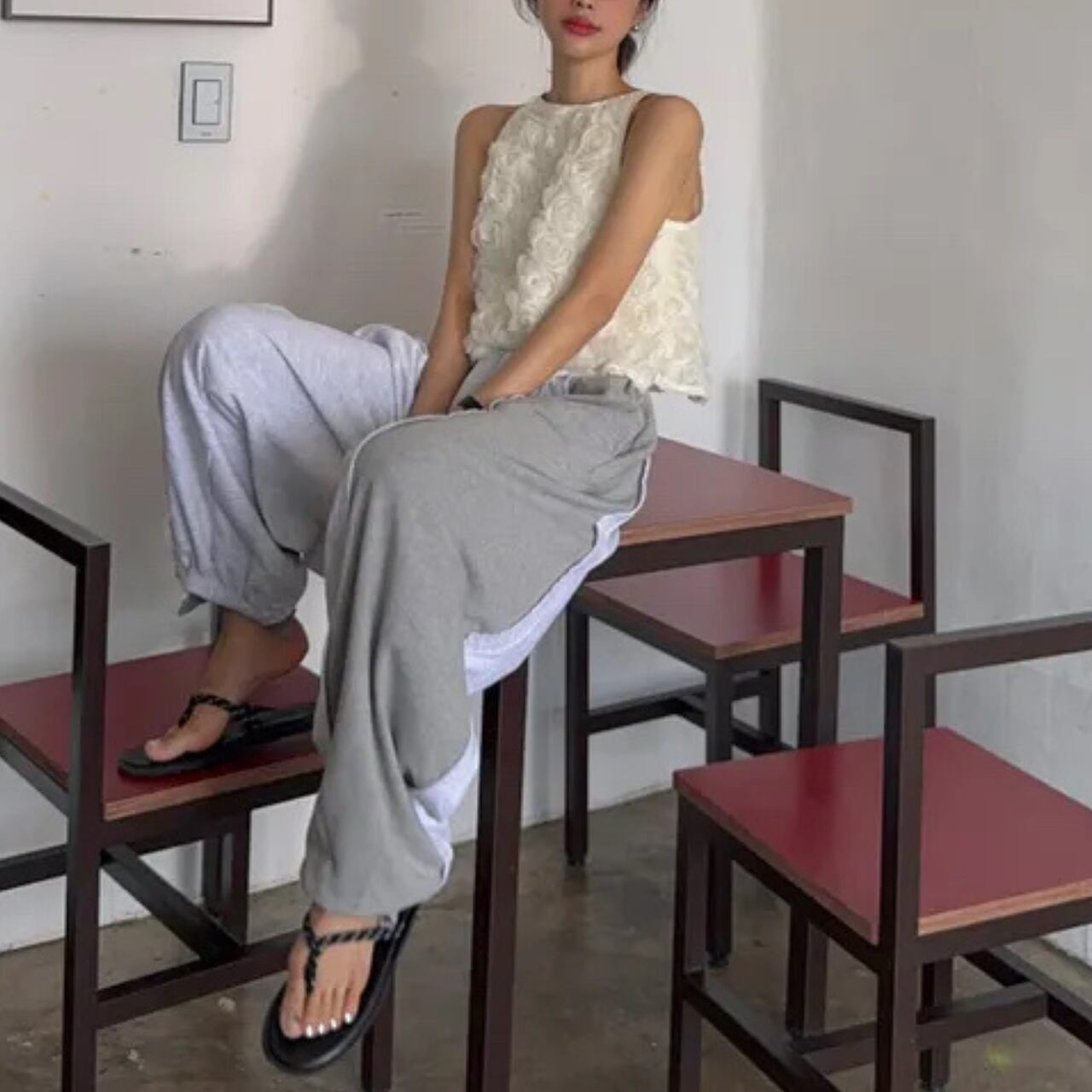 立体ローズモチーフが特徴の上品で華やかなトップスです。首元の可愛らしいリボンデザインが後ろ姿まで美しく彩り、すっきりとしたノースリーブカットで腕のラインを美しく見せてくれます。軽やかで上品な透け感のある素材が、女性らしい繊細さを表現します。