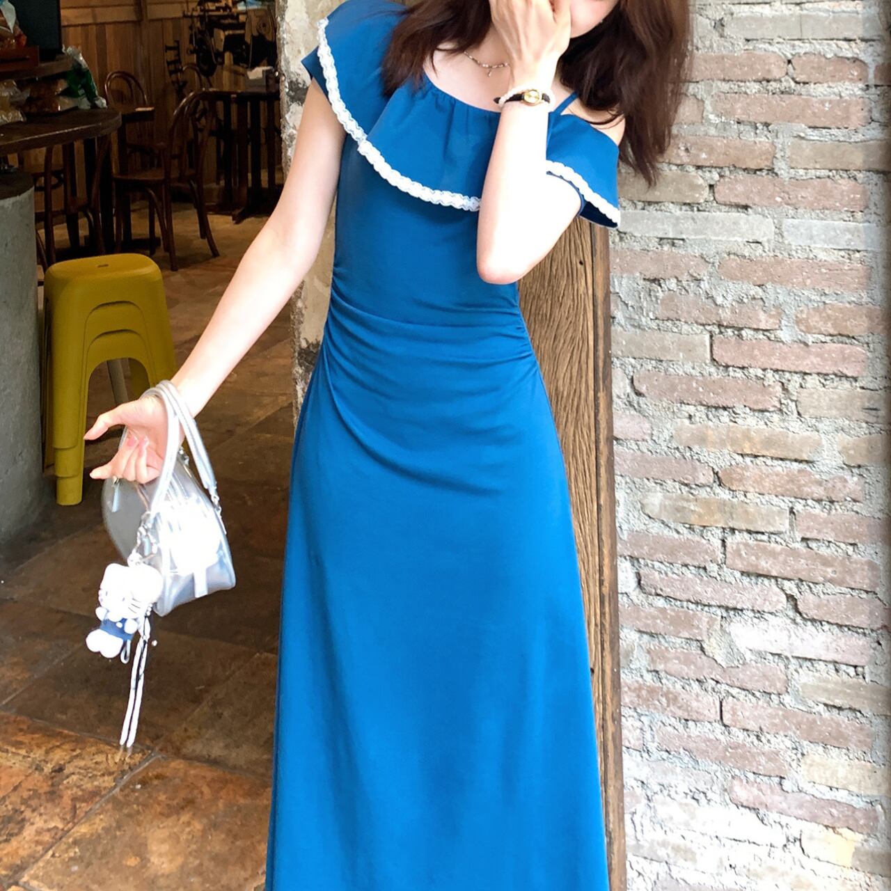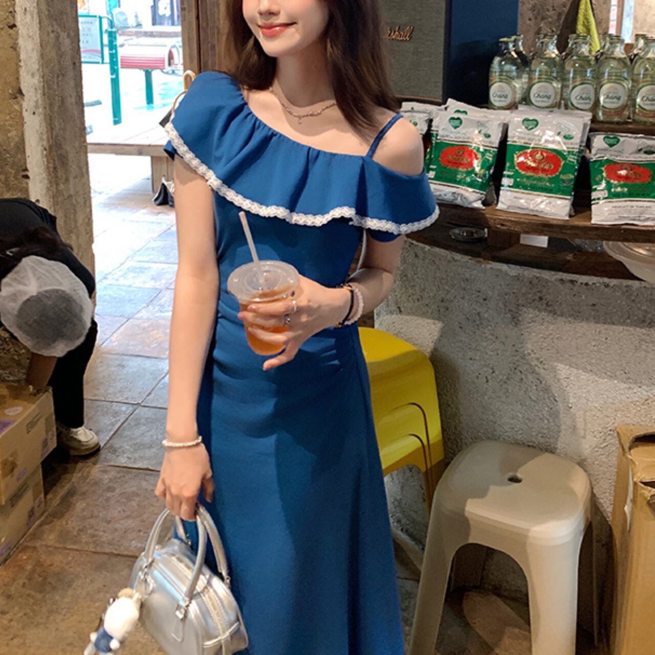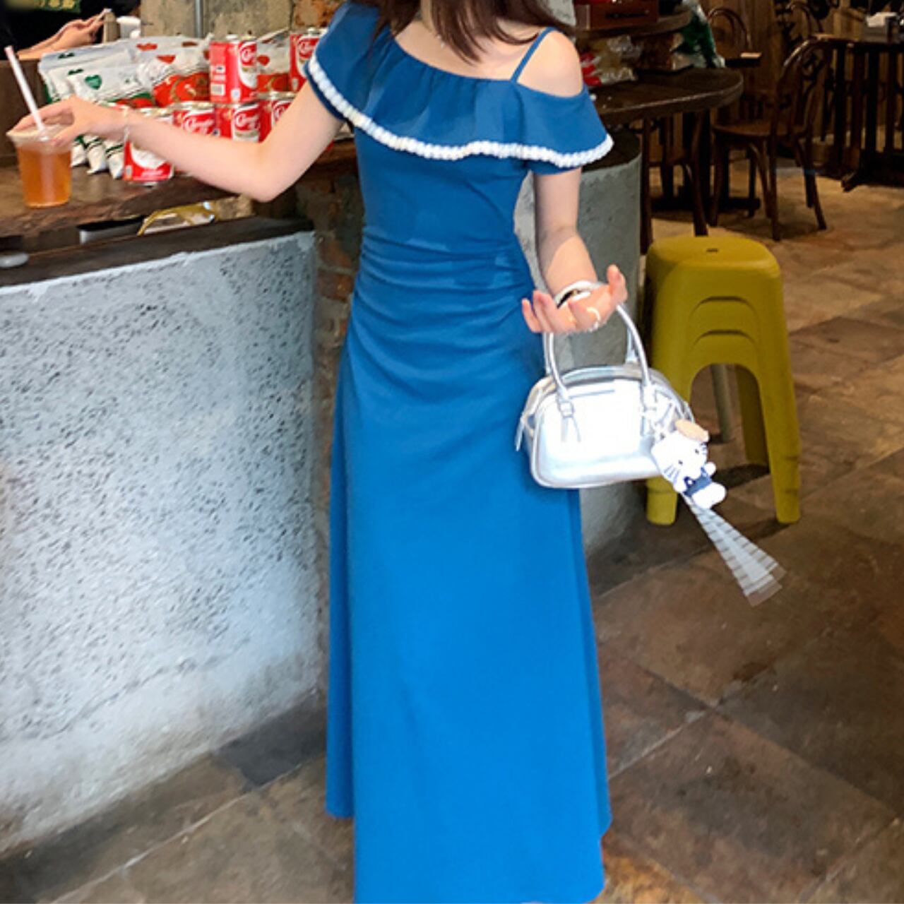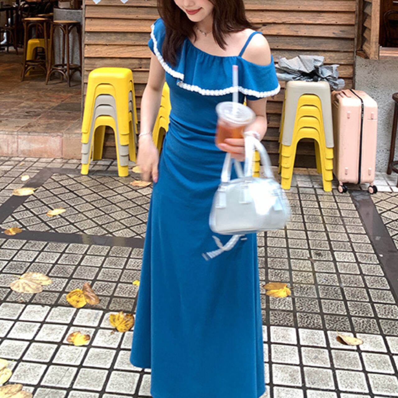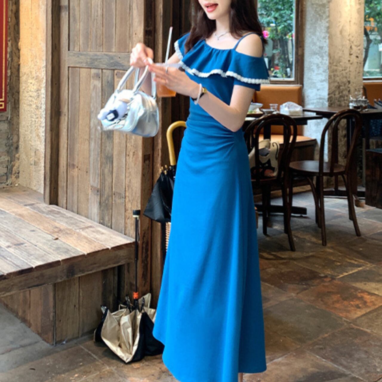 オフショルダーデザインのロングワンピース。胸元のフリルと白いパイピングが可愛らしいアクセントとなり、夏らしい爽やかさと女性らしさを両立した一枚です。