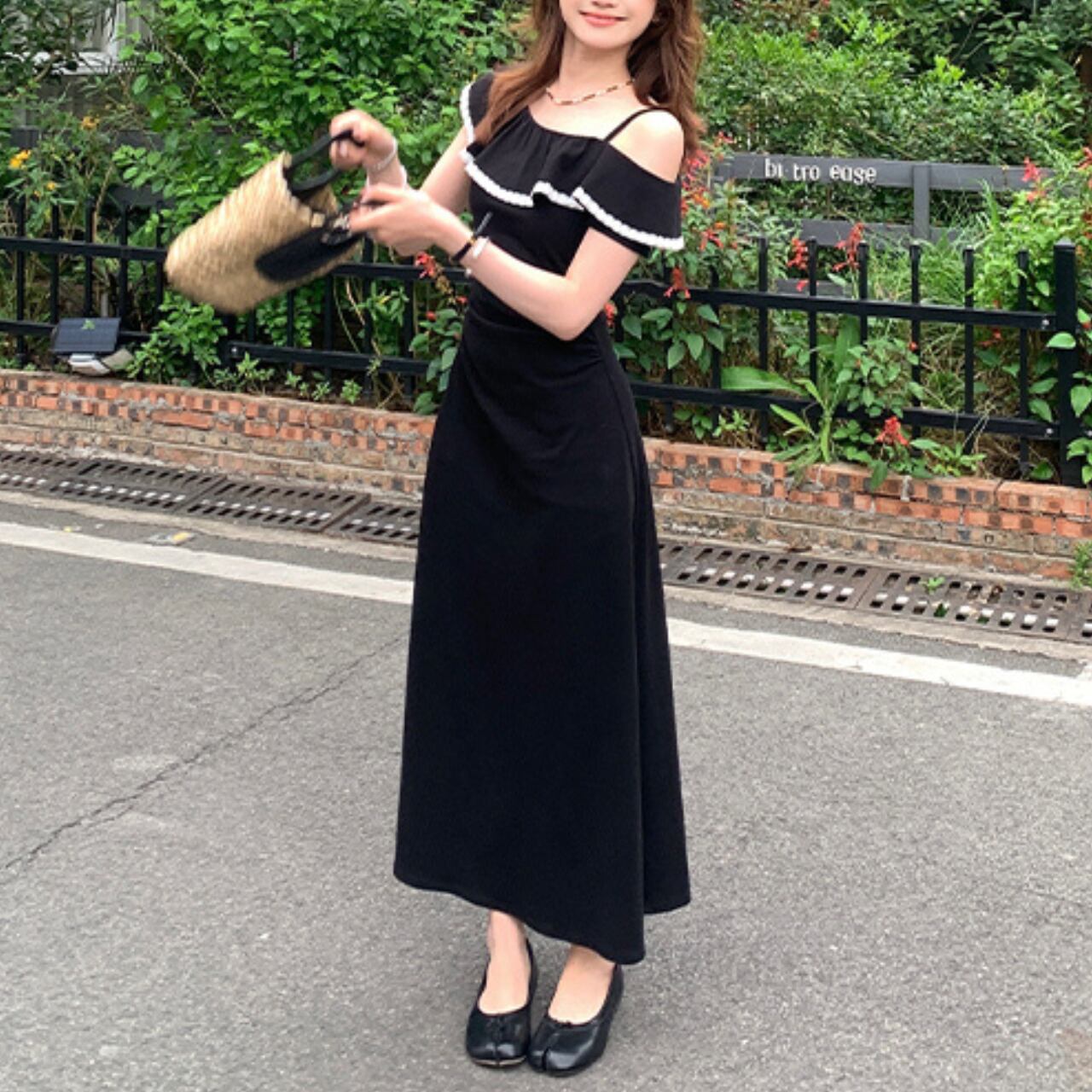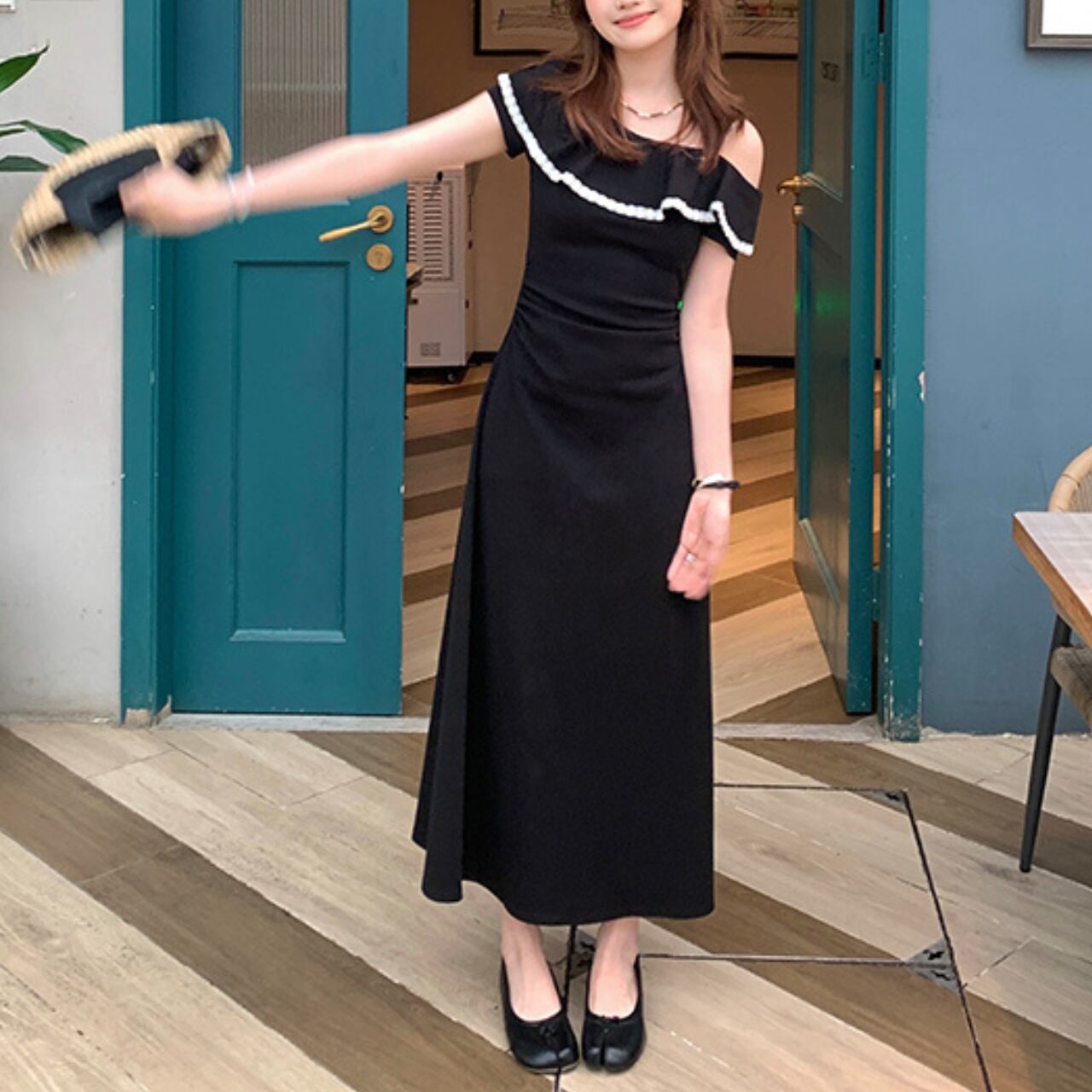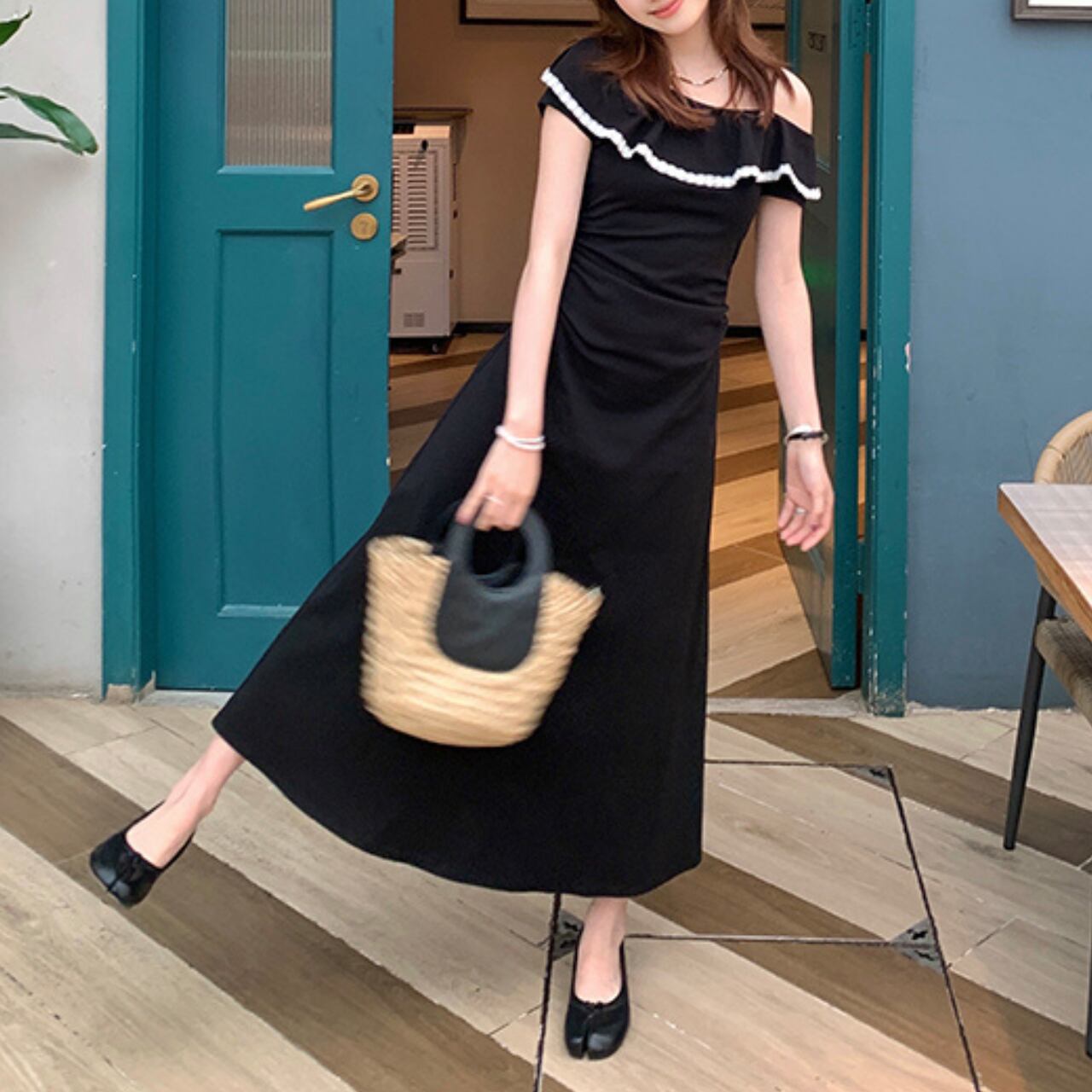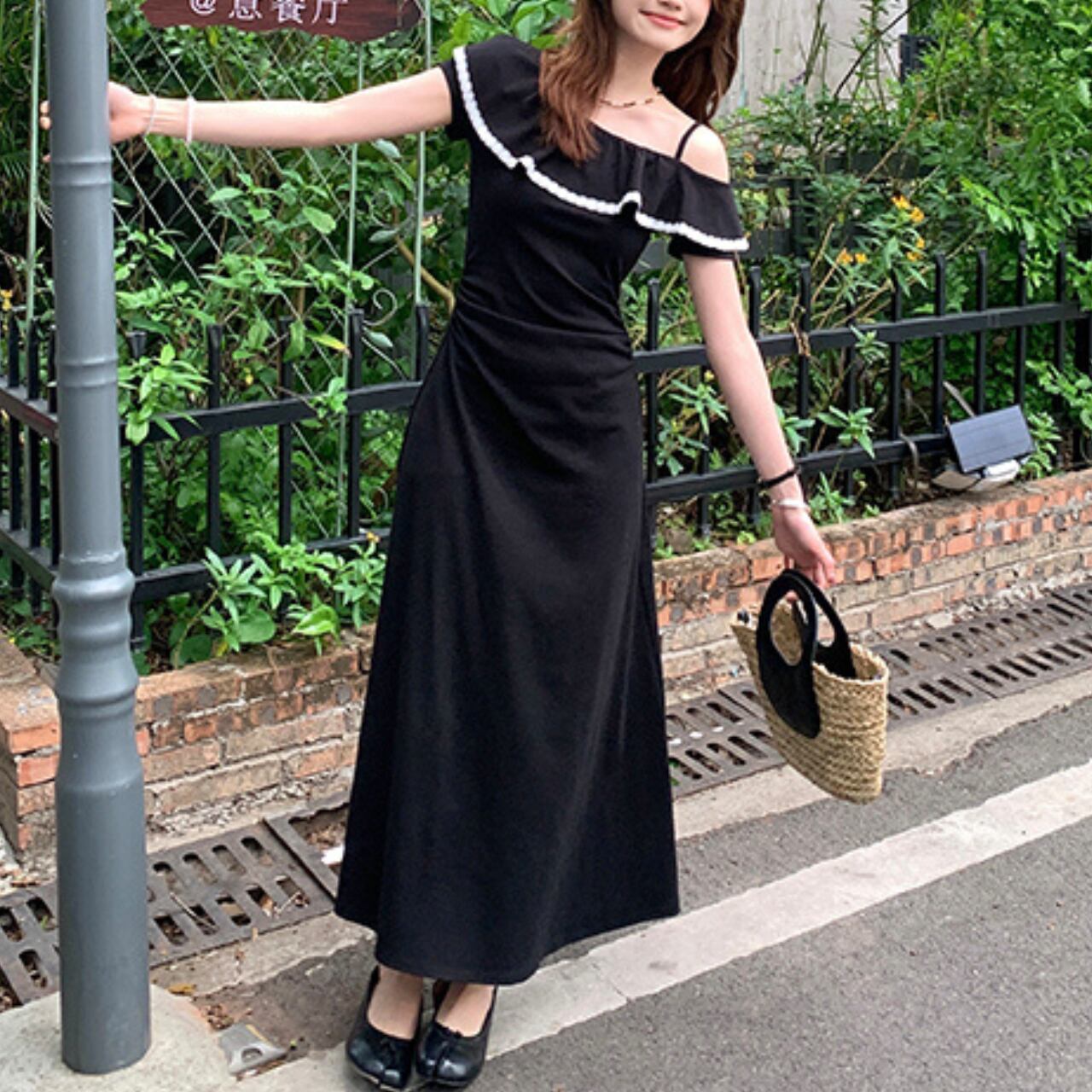 オフショルダーデザインのロングワンピース。胸元のフリルと白いパイピングが可愛らしいアクセントとなり、夏らしい爽やかさと女性らしさを両立した一枚です。