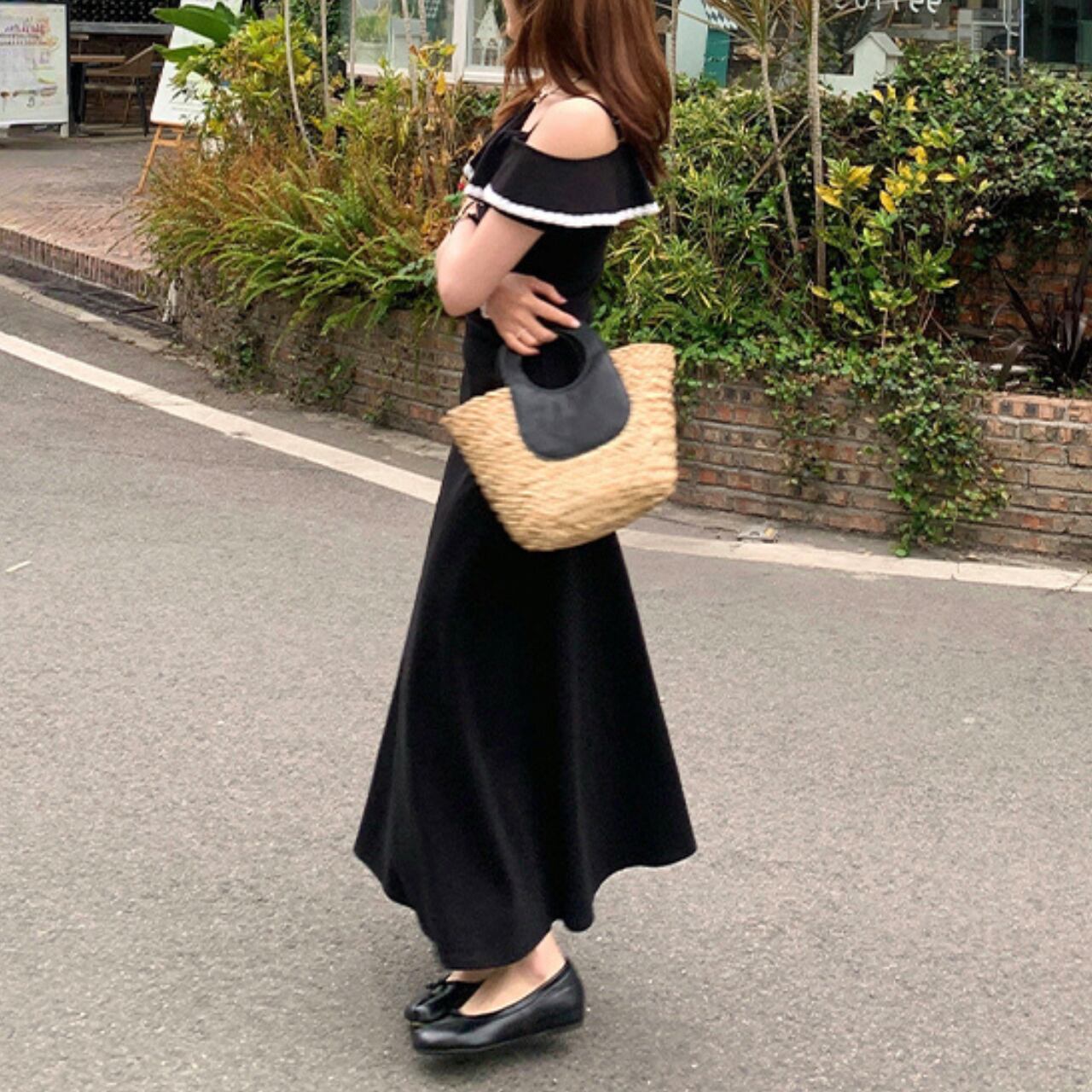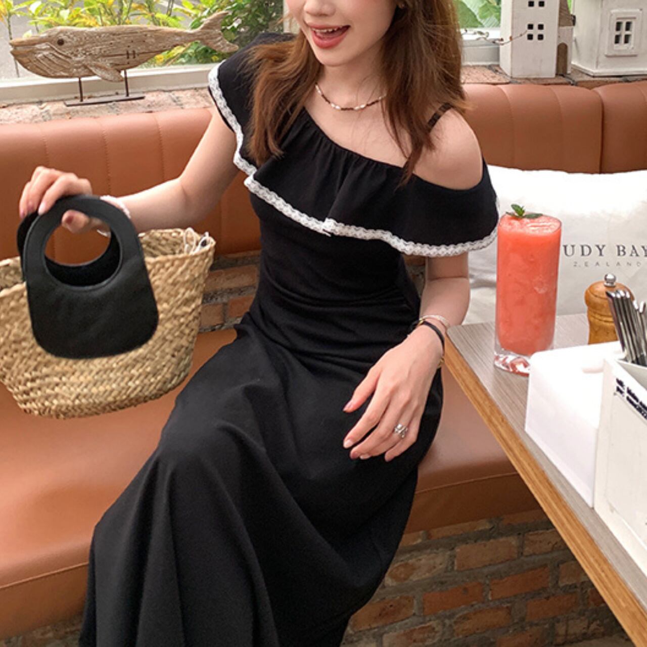 肩を美しく見せるオフショルダーデザインは、デコルテラインを上品に演出。胸元の大きなフリルが華やかさをプラスし、白いパイピングが全体を引き締めて洗練された印象に仕上げています。細いストラップで肩にかけるスタイルなので、着崩れしにくく安心して着用できます。