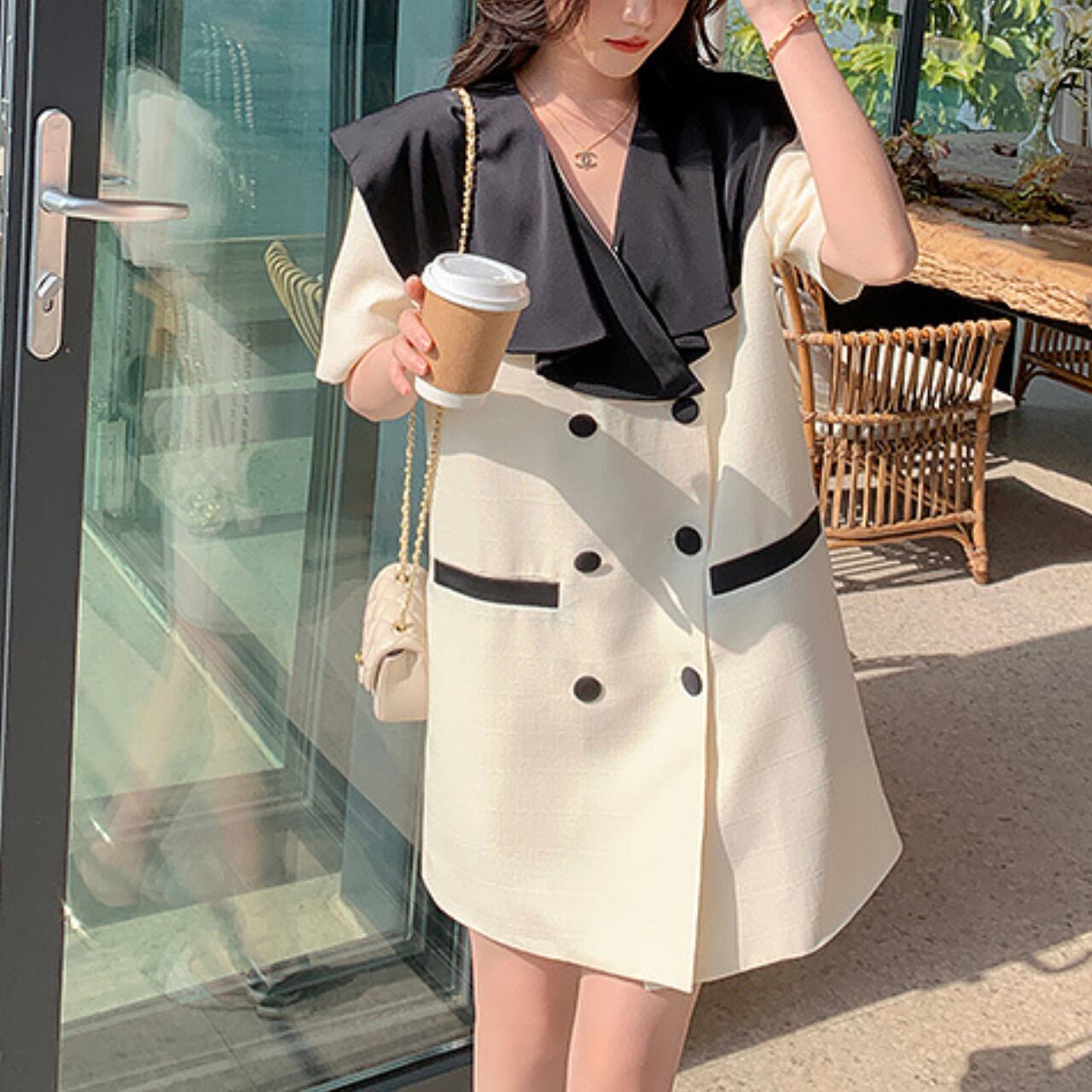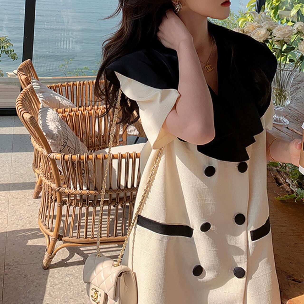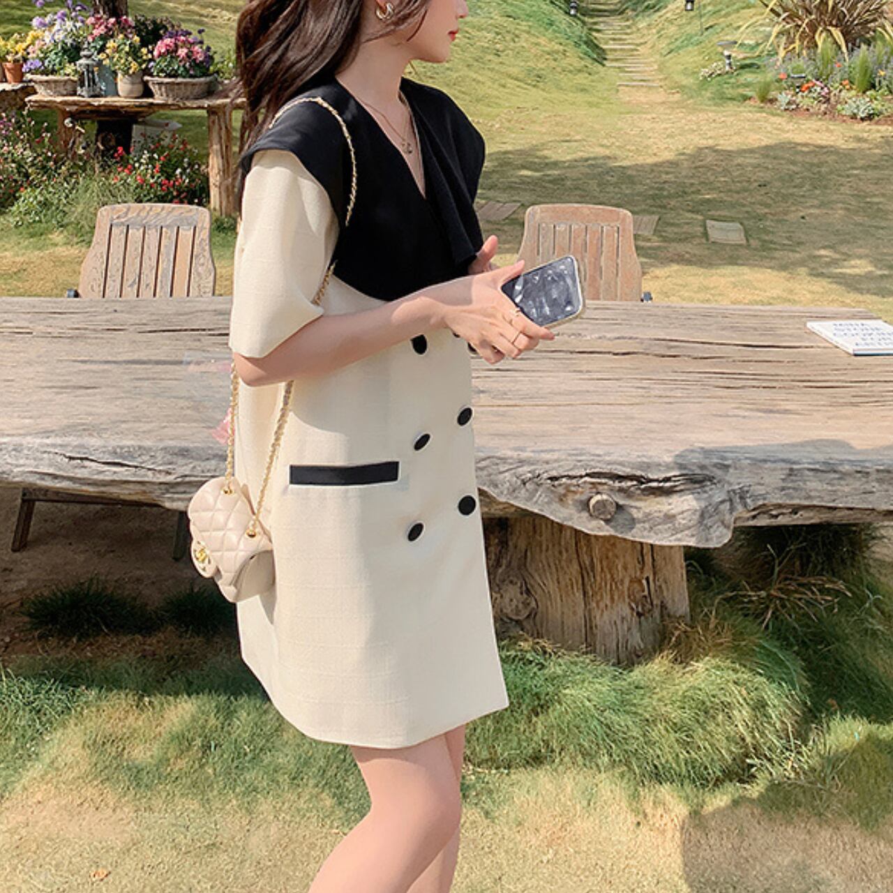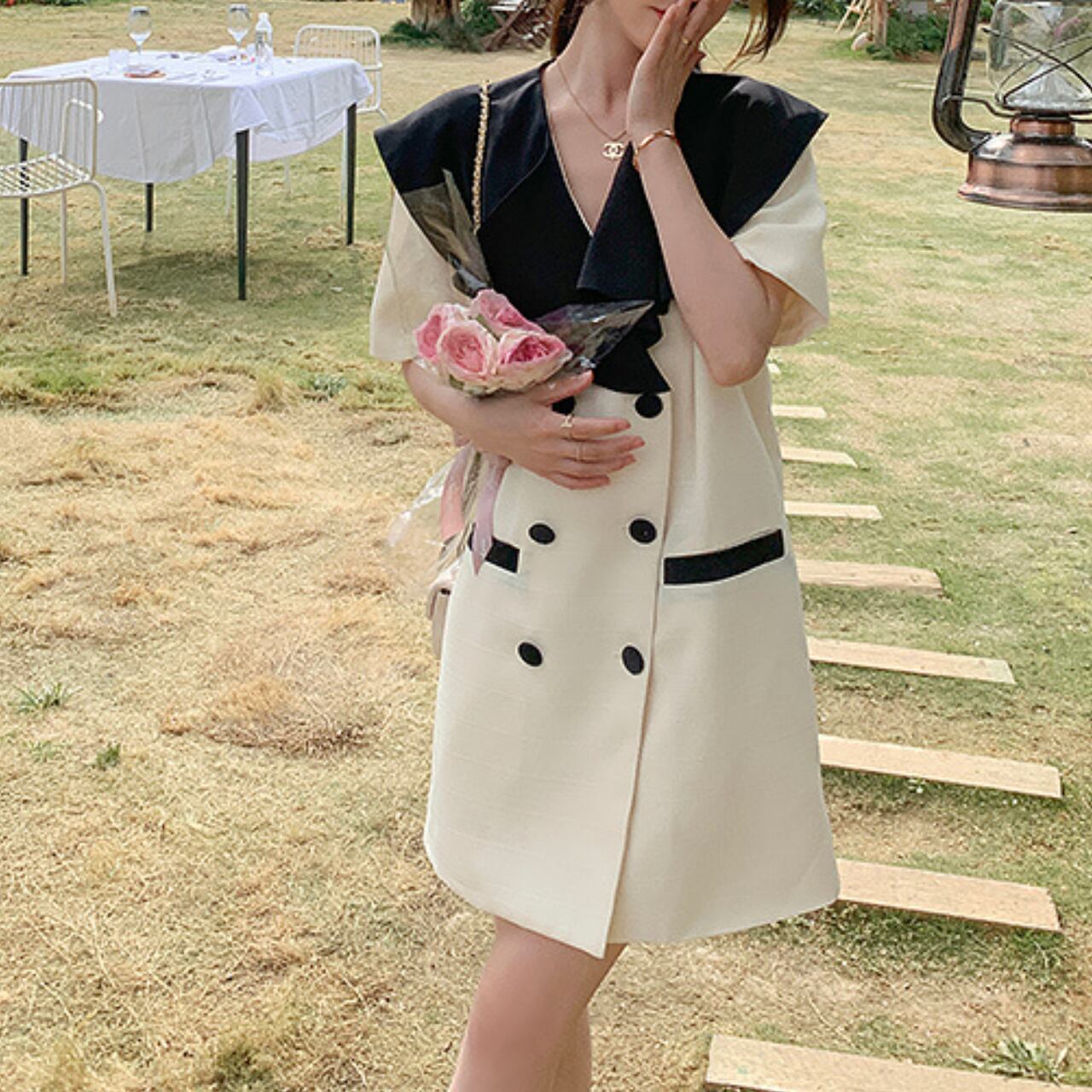ベージュとブラックの洗練されたバイカラーデザインが印象的な、トレンチコート風ワンピース。クラシカルなトレンチの要素を取り入れながら、ワンピースとして仕上げたモダンで上品な一枚です。上半身はシックなブラック、下半身は上品なベージュの配色で、スタイルアップ効果も抜群。ダブルブレストのボタンデザインとブラックのパイピングが全体を引き締め、トレンチコートらしい凛とした印象を演出します。襟元の深いVネックラインが大人の女性らしさを際立たせ、洗練された魅力を放ちます。季節を問わず着回しやすいデザインです。