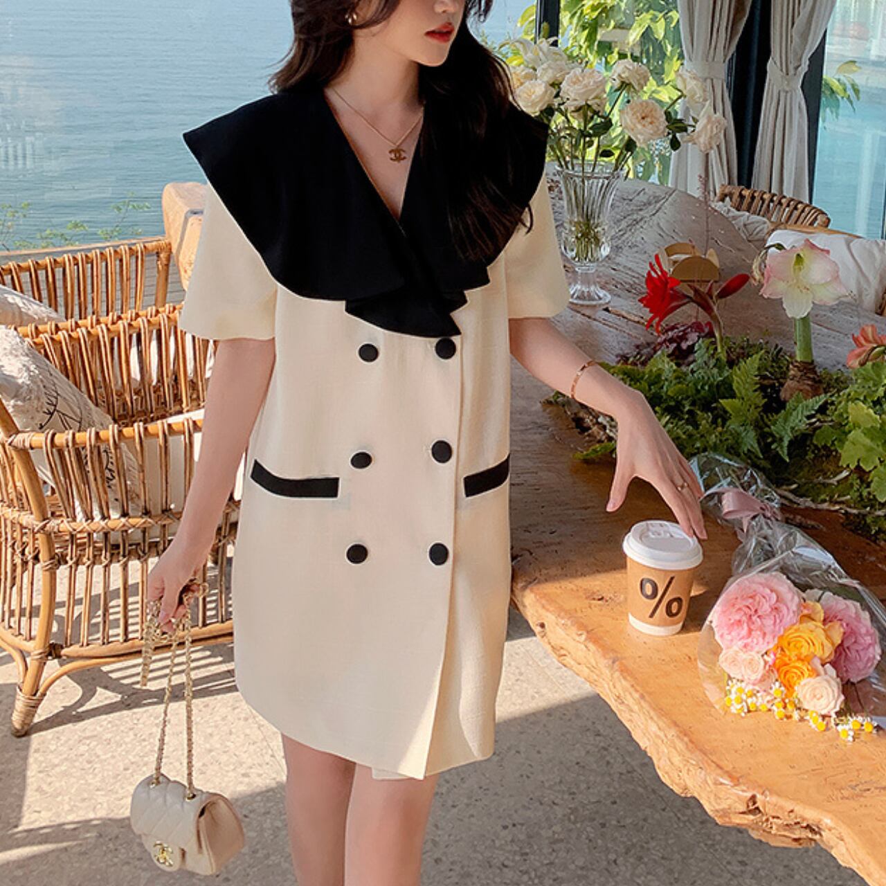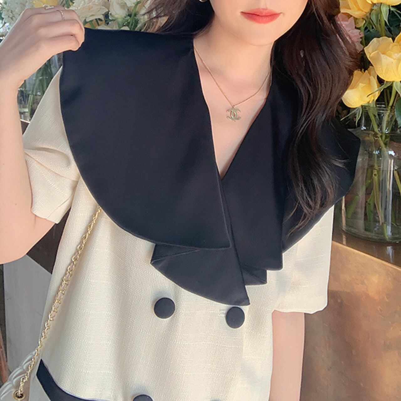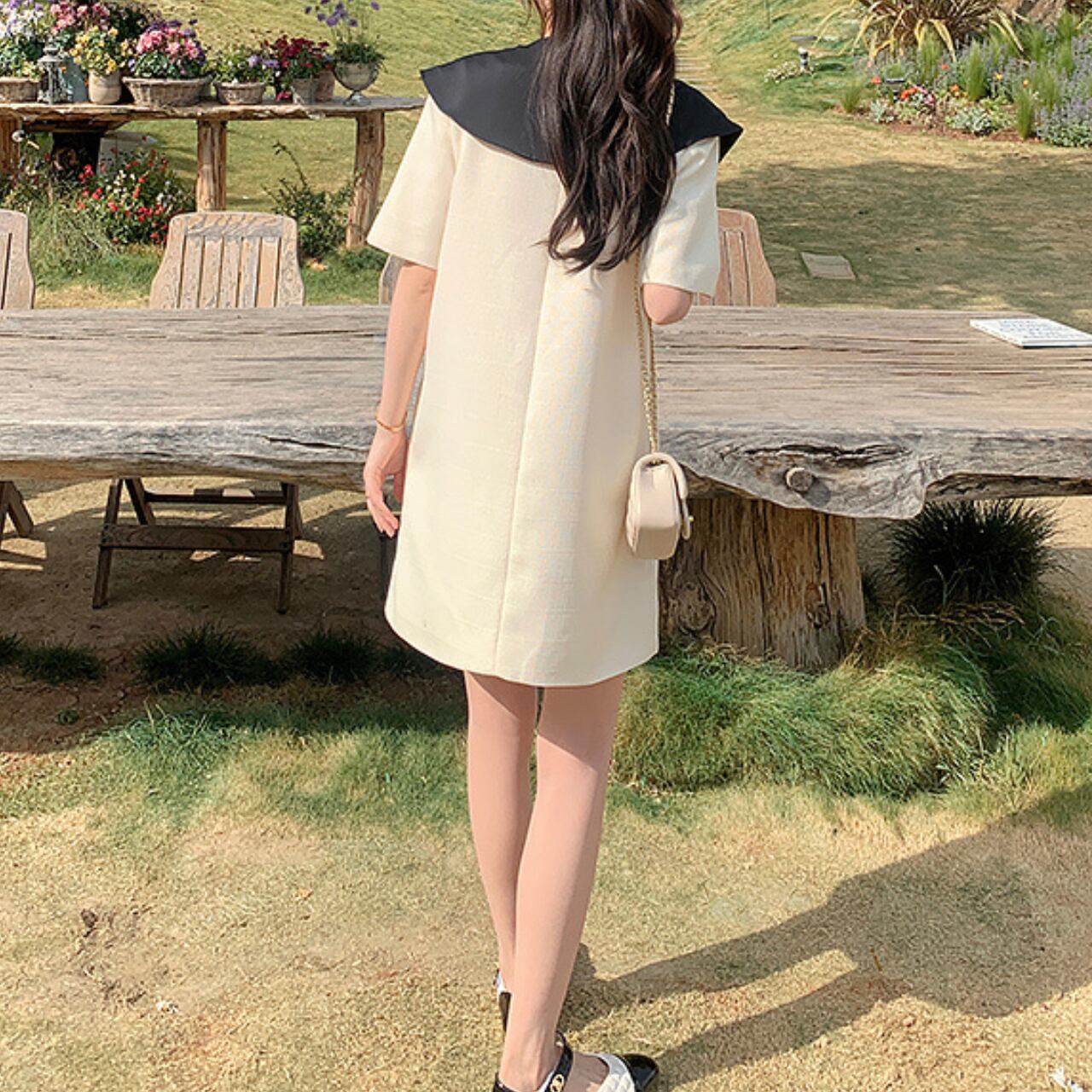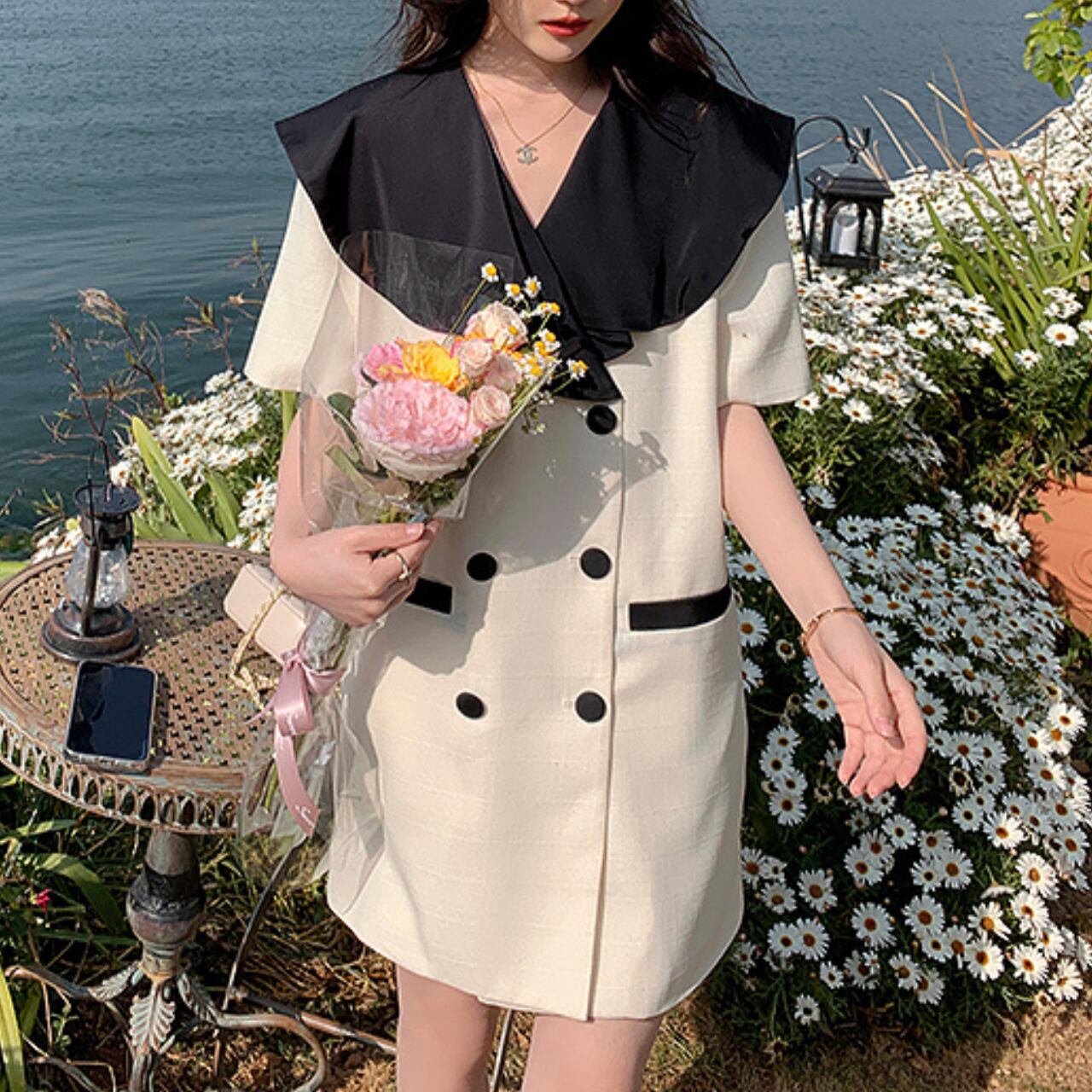 ベージュとブラックの洗練されたバイカラーデザインが印象的な、トレンチコート風ワンピース。クラシカルなトレンチの要素を取り入れながら、ワンピースとして仕上げたモダンで上品な一枚です。上半身はシックなブラック、下半身は上品なベージュの配色で、スタイルアップ効果も抜群。ダブルブレストのボタンデザインとブラックのパイピングが全体を引き締め、トレンチコートらしい凛とした印象を演出します。襟元の深いVネックラインが大人の女性らしさを際立たせ、洗練された魅力を放ちます。季節を問わず着回しやすいデザインです。