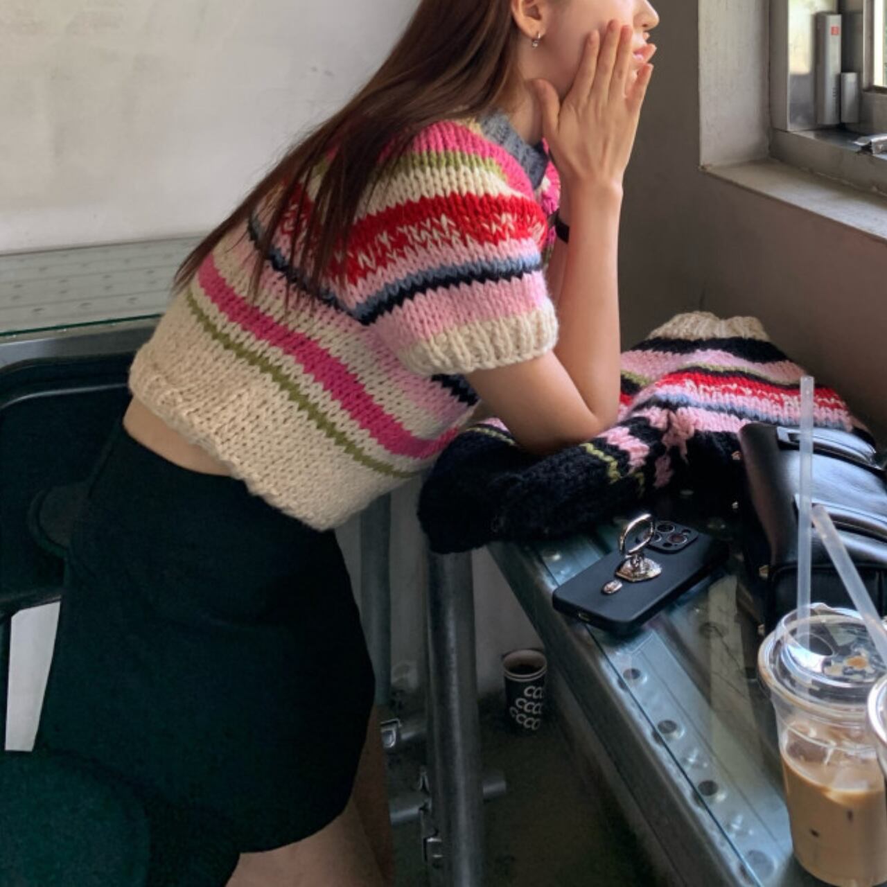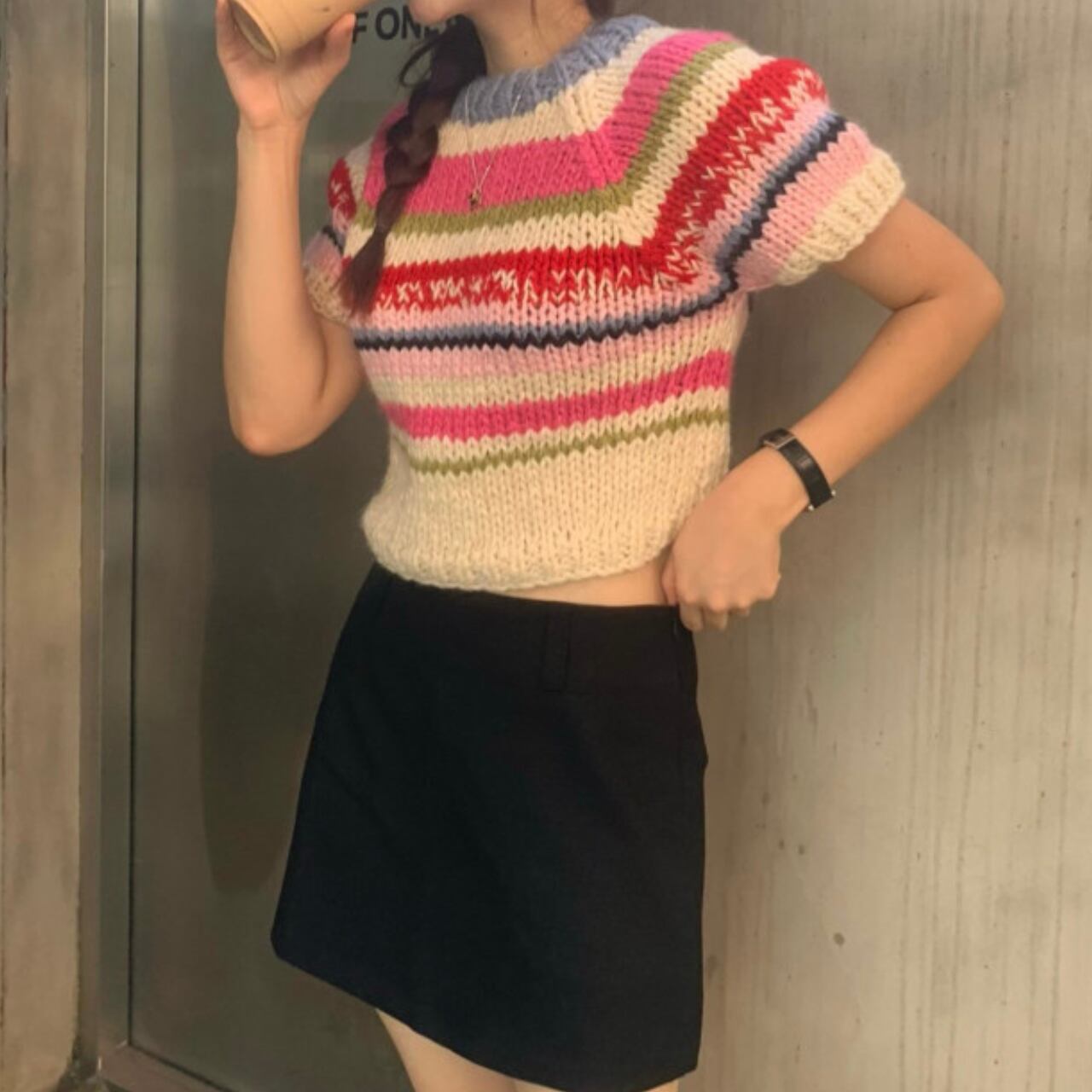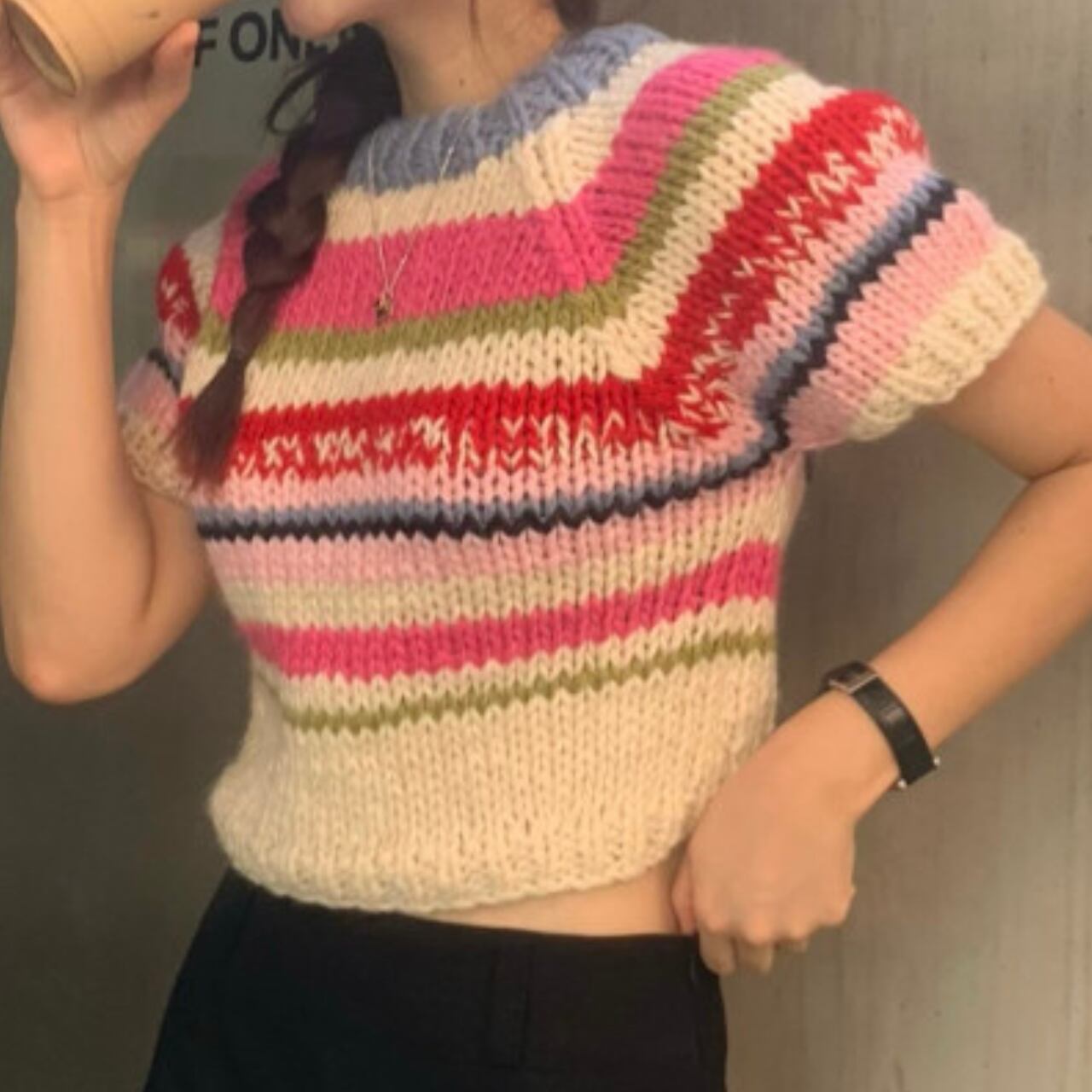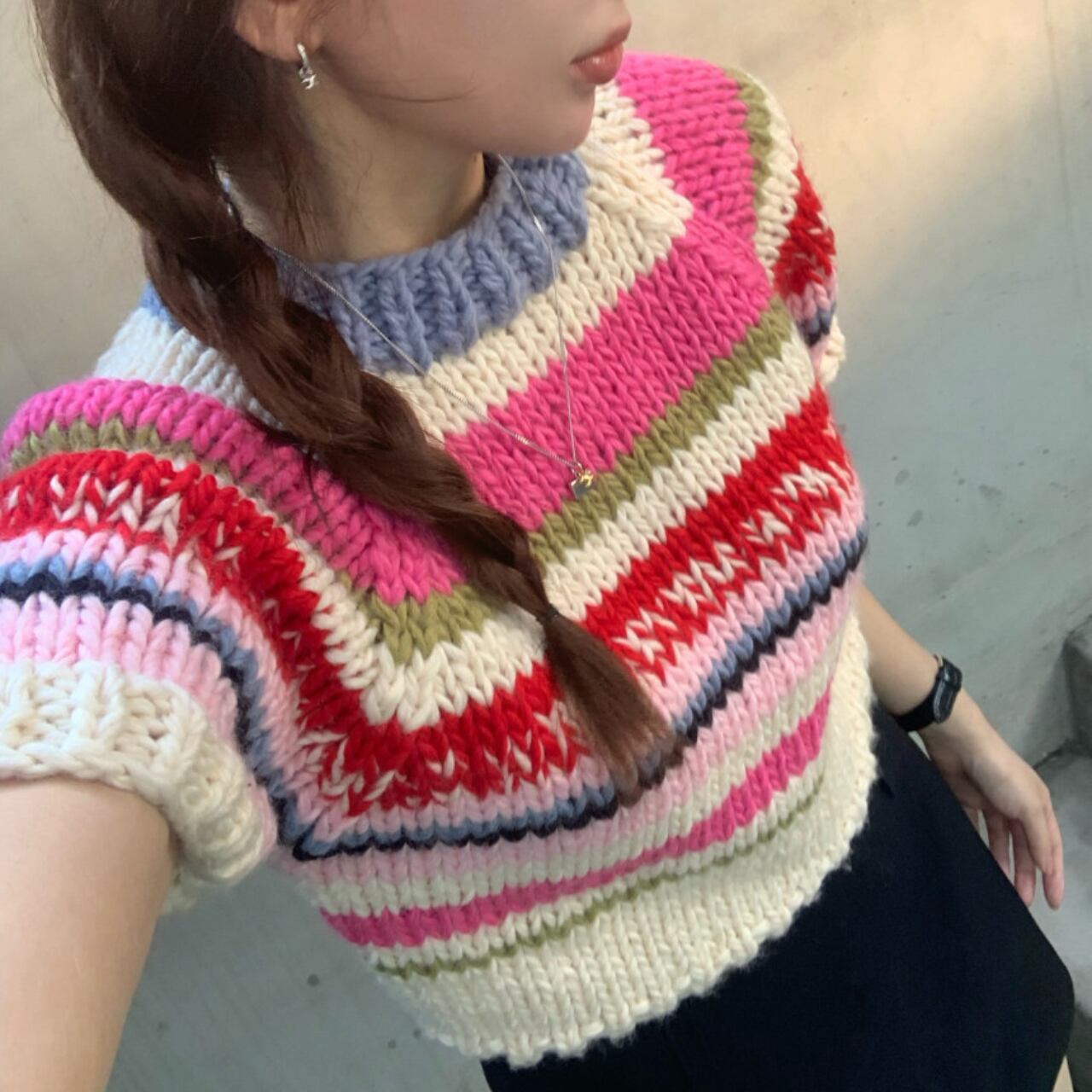 鮮やかなマルチカラーストライプが印象的な、個性的でキュートなニットです。ピンク、レッド、ブルー、グリーン、クリームなど豊富な色彩が織りなすボーダーデザインが、コーディネートのアクセントとして存在感を発揮します。手編み風の温かみのある質感と、太めの糸で編まれたざっくりとした風合いが、親しみやすく愛らしい雰囲気を演出します。