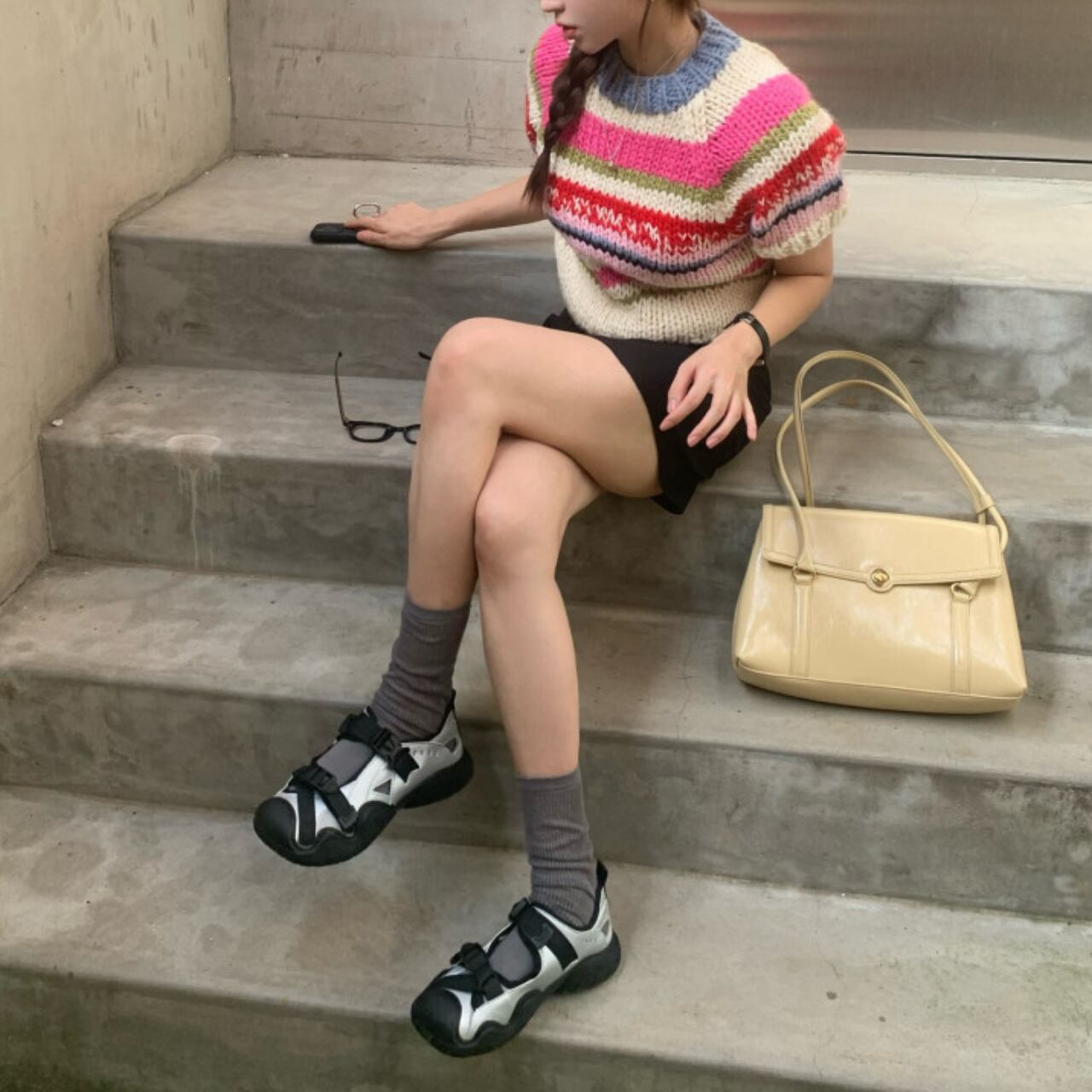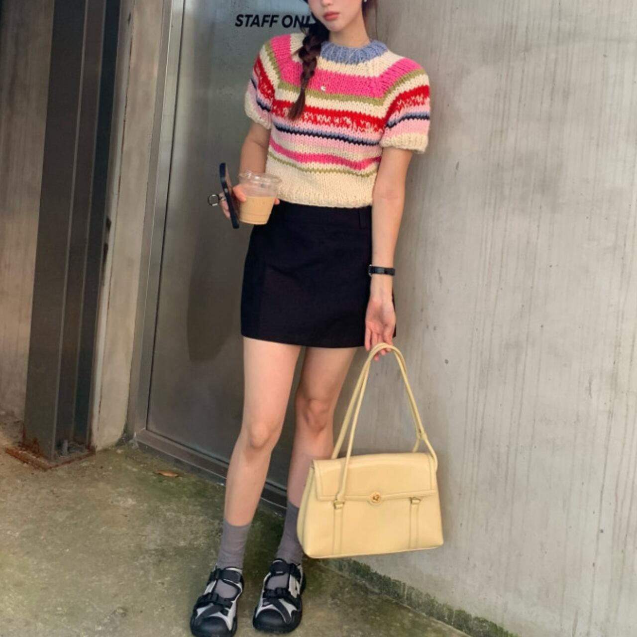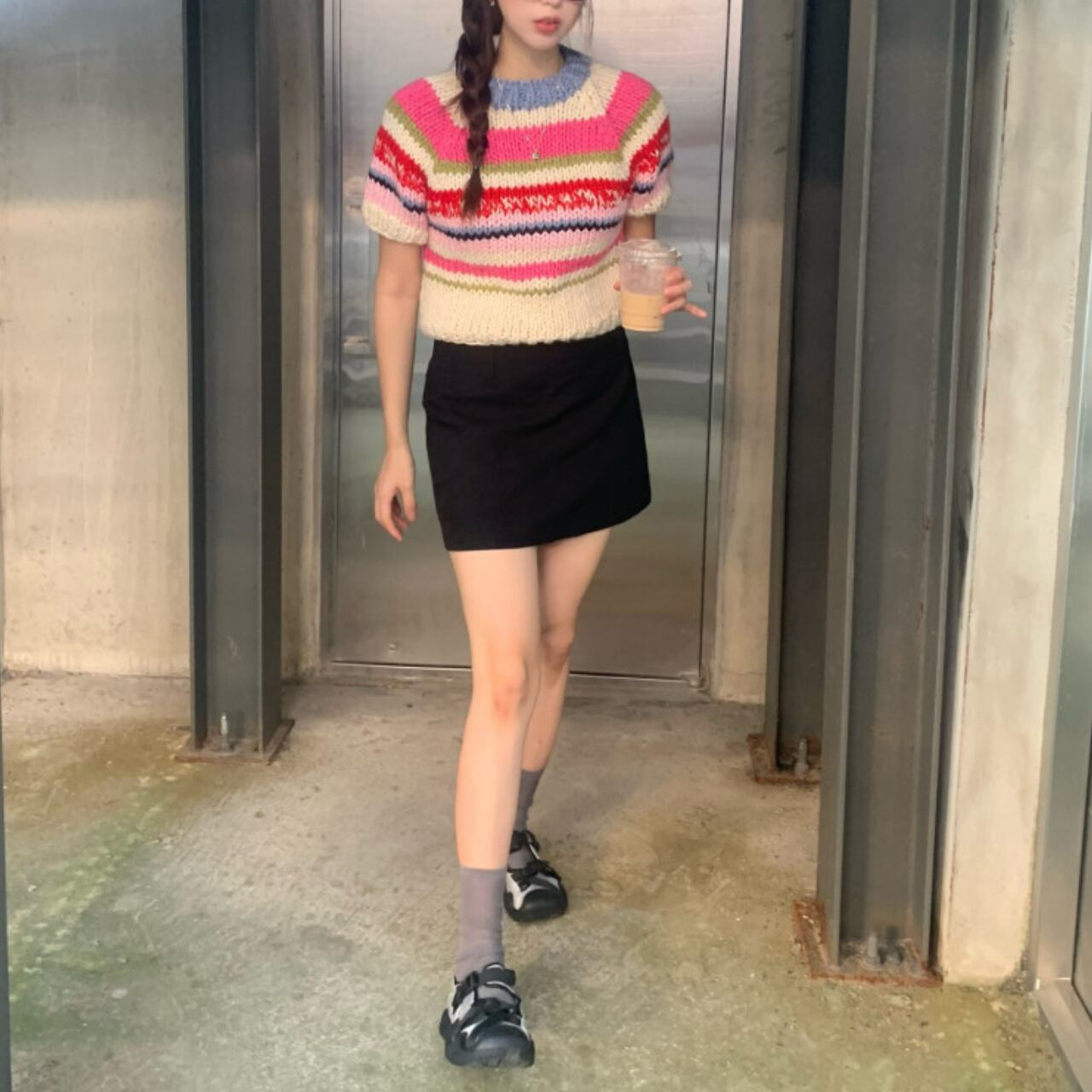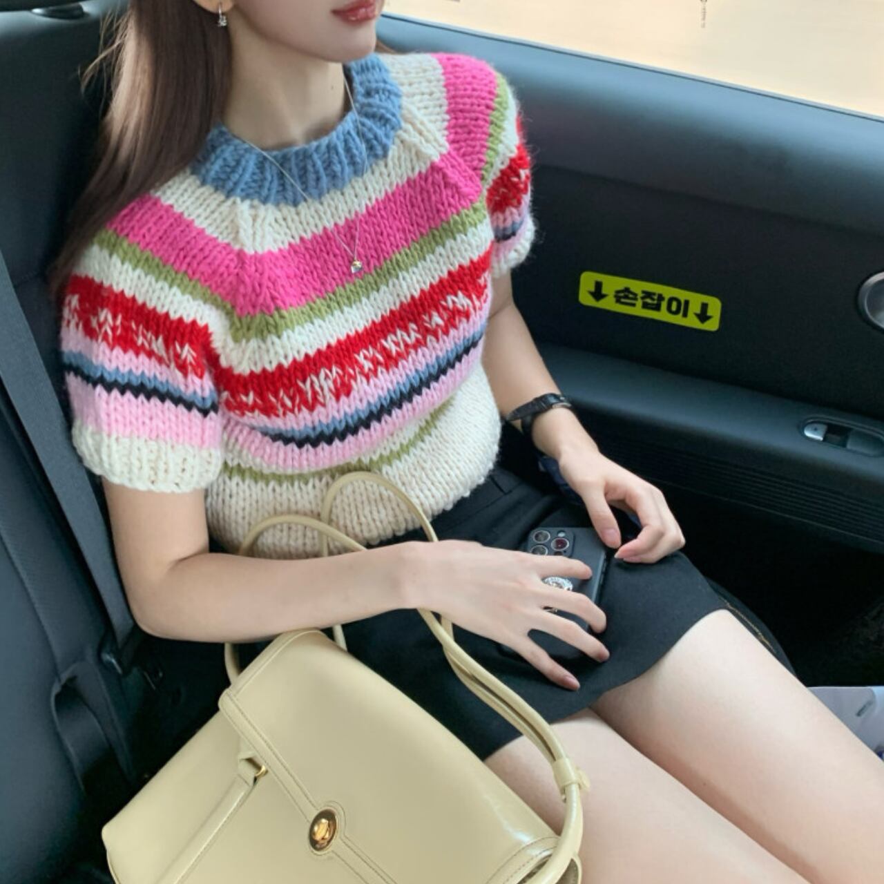 鮮やかなマルチカラーストライプが印象的な、個性的でキュートなニットです。ピンク、レッド、ブルー、グリーン、クリームなど豊富な色彩が織りなすボーダーデザインが、コーディネートのアクセントとして存在感を発揮します。手編み風の温かみのある質感と、太めの糸で編まれたざっくりとした風合いが、親しみやすく愛らしい雰囲気を演出します。