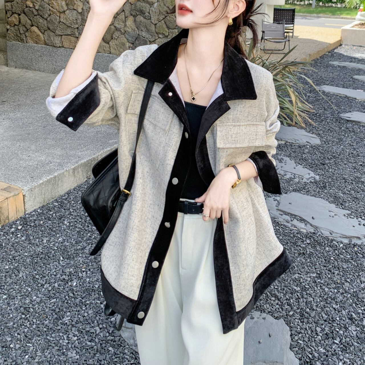 グレー×ブラックの洗練されたバイカラーデザインが印象的な、モードなジャケットです。最大の特徴は、グレーのベースにブラックの襟、袖口、裾部分を配したバイカラーデザイン。コントラストの効いた配色が都会的でスタイリッシュな印象を与えます。フロントには大きめのフラップポケットが付いており、実用性とデザイン性を兼ね備えています。秋冬シーズンの防寒対策にも優れています。ゆったりとしたオーバーサイズシルエットで今っぽいスタイリングが楽しめ、インナーを選ばない着回しの良さも魅力です。