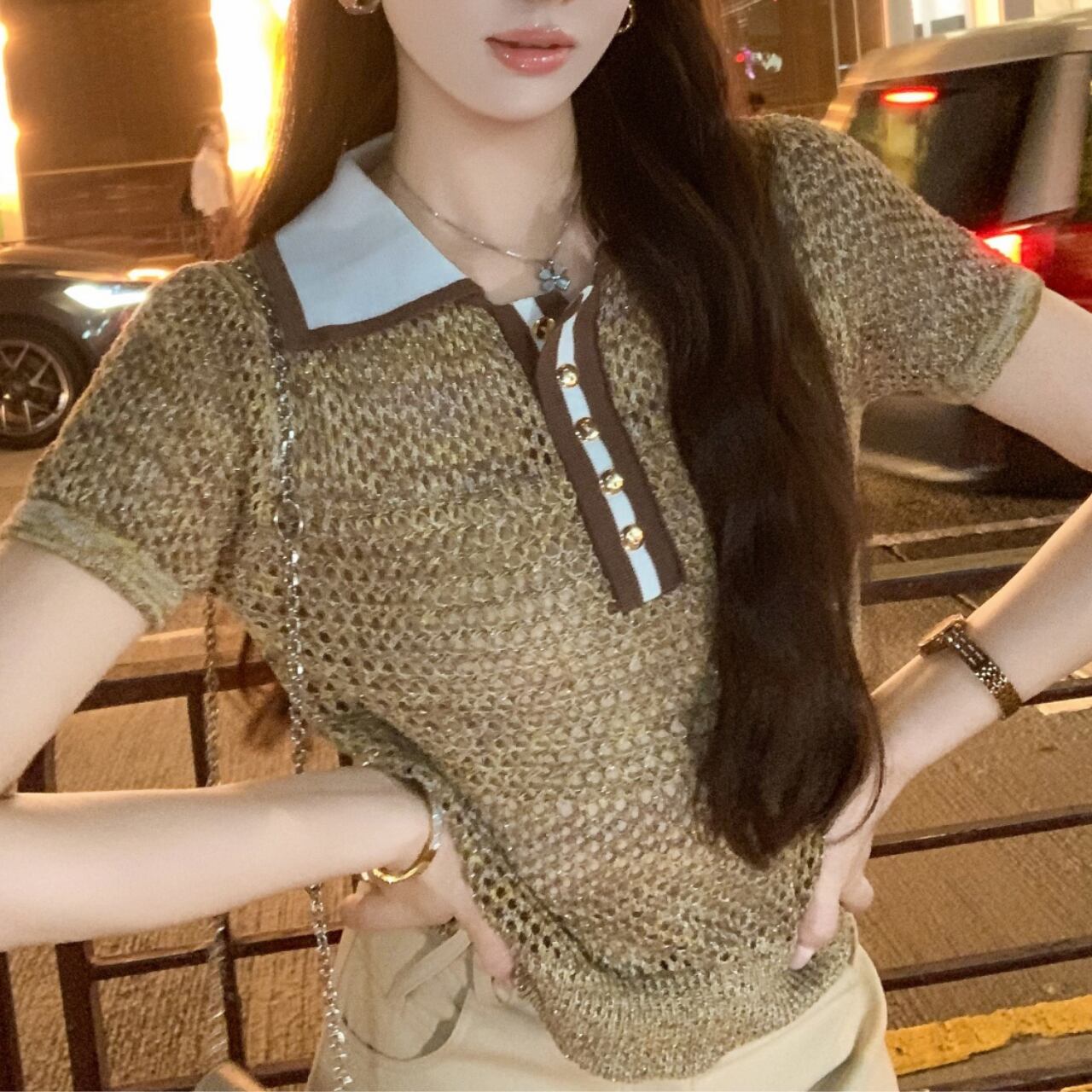 上品なカーキカラーの洗練されたポロシャツです。透け感のある繊細なメッシュ編みが夏らしい涼しげな印象を与え、白いシャツ襟とのコントラストがクラシックで上品なアクセントを演出します。フロントのボタンデザインがきちんと感をプラスし、カジュアルすぎない大人の魅力を引き出します。