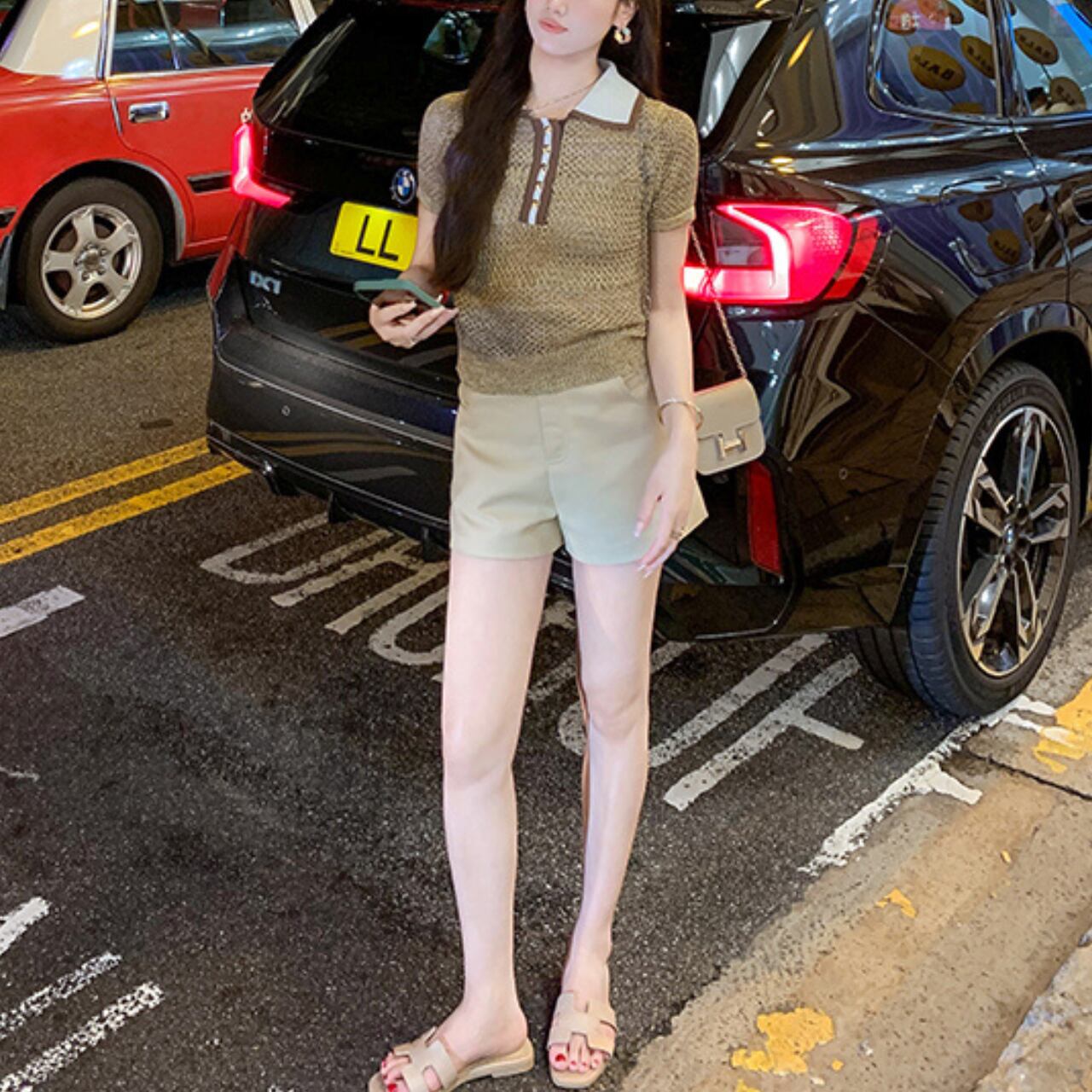 程よくフィットするシルエットで体のラインを美しく見せ、短めの袖丈が腕をすっきりと見せてくれます。写真のようにベージュのショートパンツと合わせたワントーンコーディネートで統一感のあるスタイリングを楽しんだり、デニムやスカートと合わせてカジュアルダウンしたりと、様々な着こなしが可能です。一枚でこなれ感のあるスタイルが完成します。