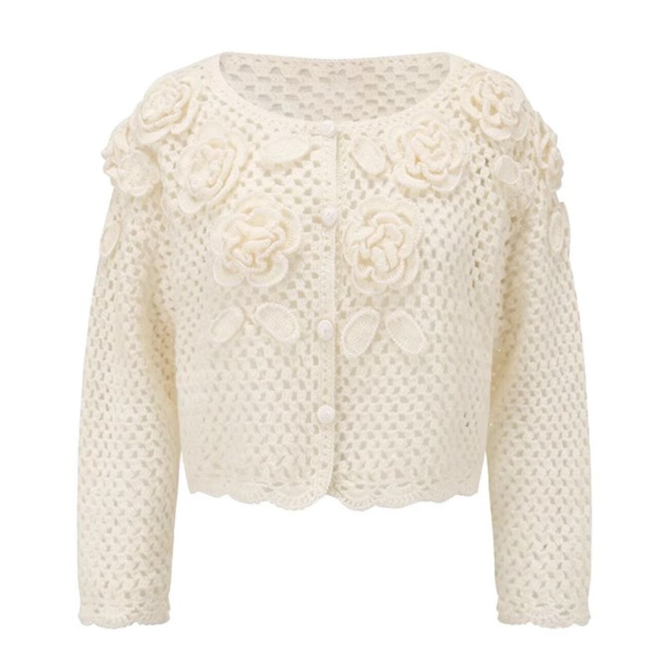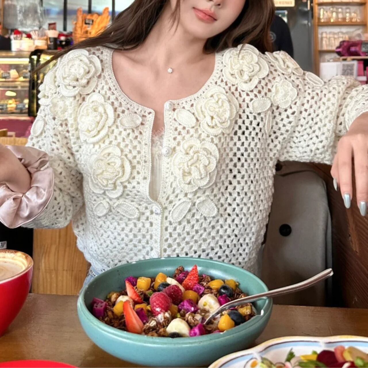 繊細なフラワーモチーフが美しいレースカーディガンは、エレガントな大人の女性を演出する特別な一枚です。立体的に浮かび上がるローズモチーフと透け感のあるメッシュレースが絶妙に組み合わさり、上品でロマンティックな印象を与えます。フロントボタンデザインでトップスとしてもカーディガンとしても着回しでき、カフェでのお食事やデート、特別なお出かけシーンで華やかさをプラスしてくれます。袖口や肩部分にあしらわれたフラワーレースが女性らしい柔らかさを演出し、どんなインナーと合わせても主役級の存在感を放ちます。春夏の軽やかなスタイリングから、秋冬のレイヤードスタイルまで、一年を通して愛用していただけるアイテムです。