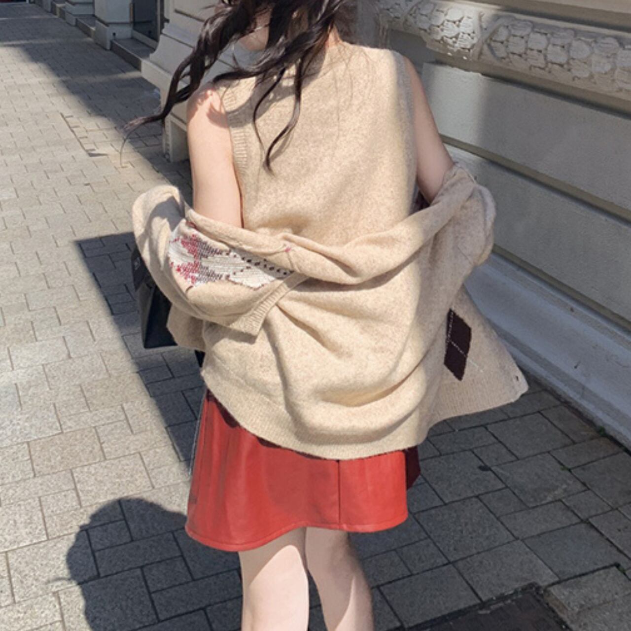 クラシックなアーガイル柄がぱっと目を引く、トラッドで可愛いニットカーディガンとベストのご紹介です。ベージュ地にブラウンとレッドのダイヤ柄がきゅっと引き締まり、レトロな雰囲気がふんわり漂います。カーディガンとベストがセットでも着ていただけ、別々に着てもコーディネートが決まり、重ね着すればぽかぽか暖かく秋冬にぴったりです。シンプルなボトムスと合わせるだけでぐっとおしゃれ度がアップします。カーディガンはすっきりとしたシルエットで、ボタンを閉めてもきちんと感があり、開けてさらっと羽織ればこなれ感たっぷりです。トラッドなスクールスタイルからカジュアルなお出かけまで、幅広いシーンで活躍してくれます。