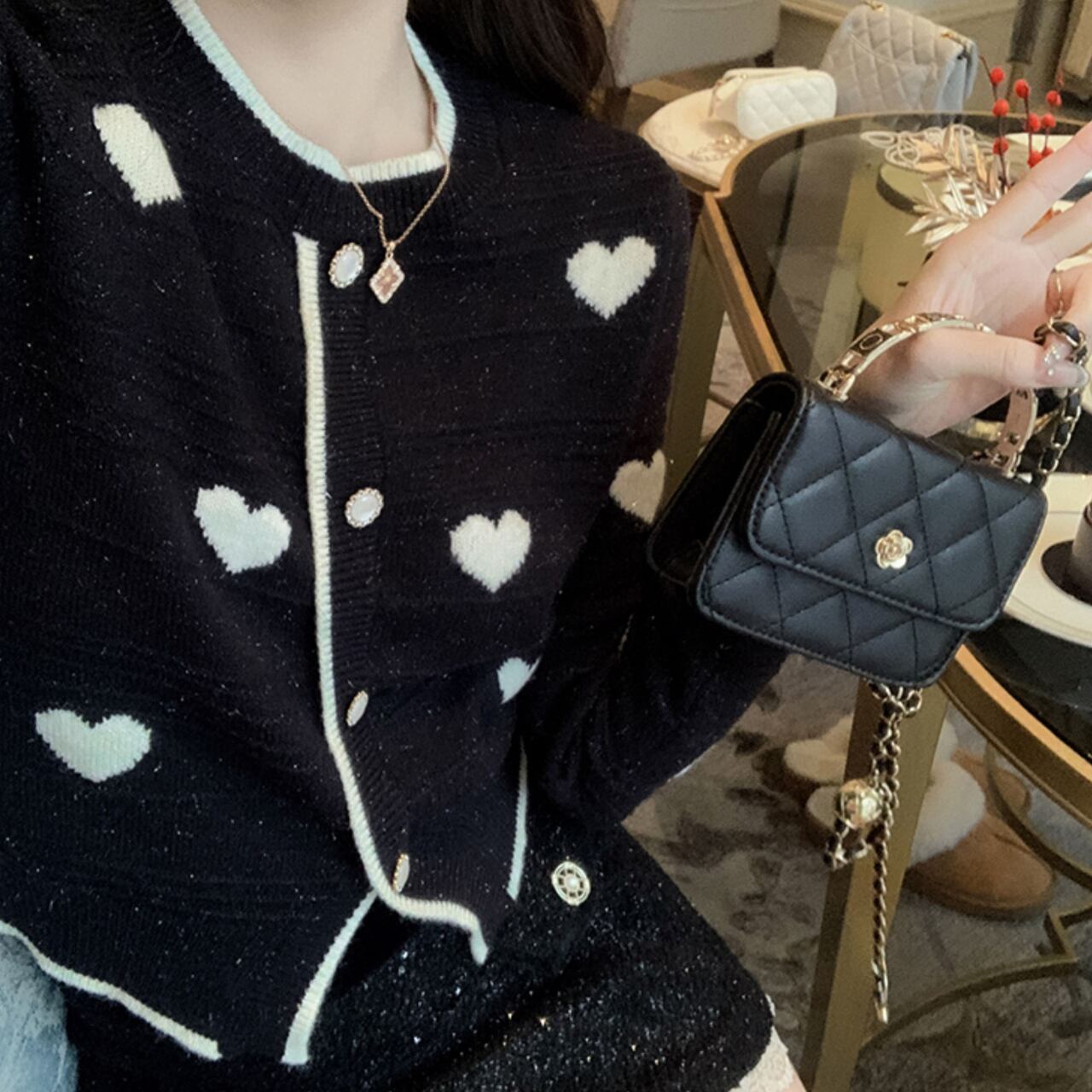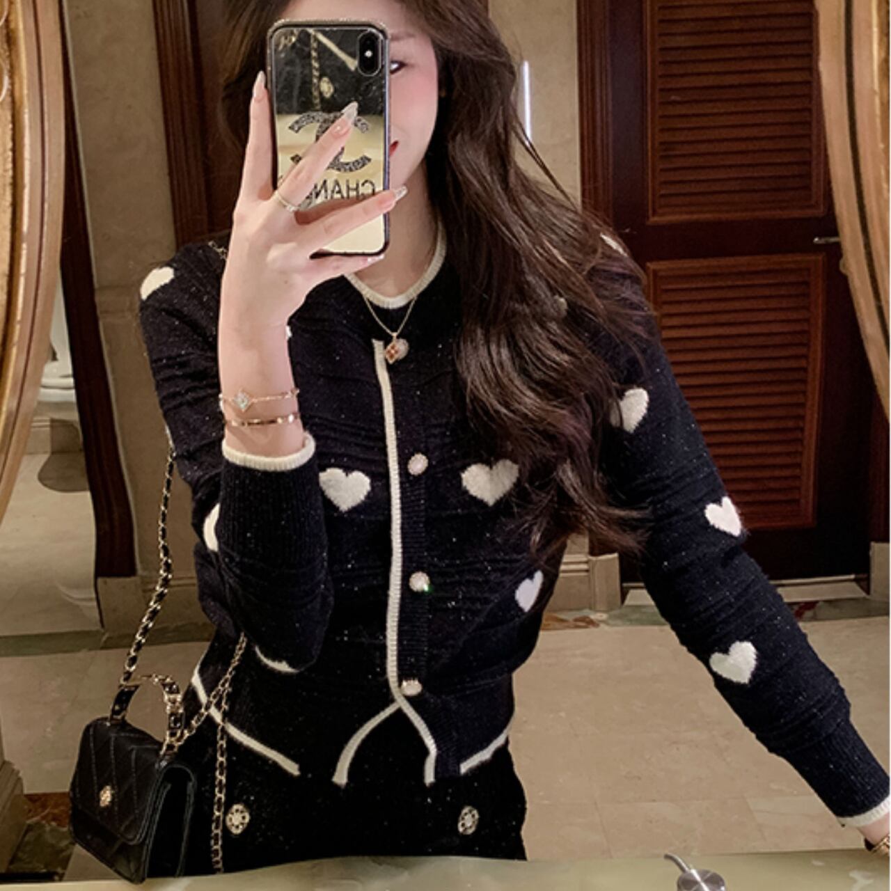 ハート柄がぽこぽこと散りばめられた、キュートで甘いニットカーディガンです。ハートモチーフがふんわりと全体に配置され、見るだけで気分がぱっと明るくなる愛らしいデザインです。襟元と袖口、フロントのラインにあしらわれたリブがきゅっと引き締まり、メリハリのある印象をぱっと与えてくれます。ボタンがきらりと輝いて上品さをプラスし、カジュアルなのにエレガントな雰囲気がふわっと漂います。デートやお出かけなど一枚でぐっと視線を集める特別感たっぷりのアイテムです。スカートと合わせてとことんガーリーに、デニムと合わせてカジュアルダウンしても可愛さはばっちりキープできます。