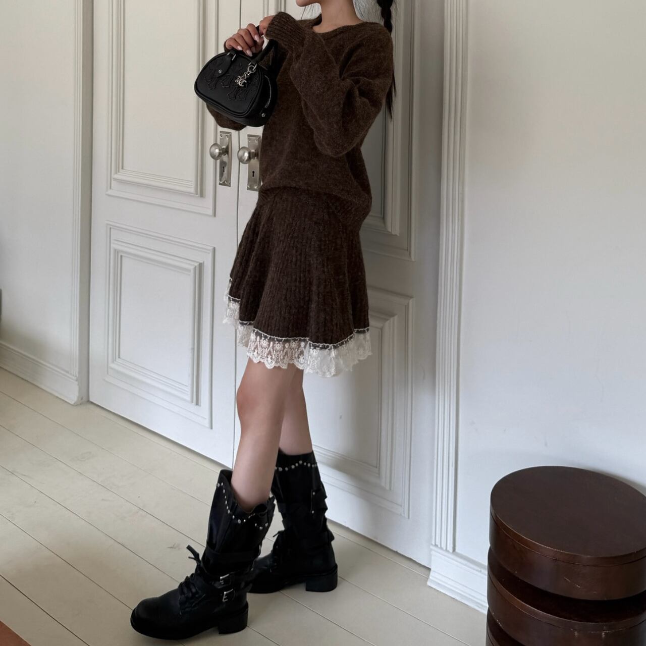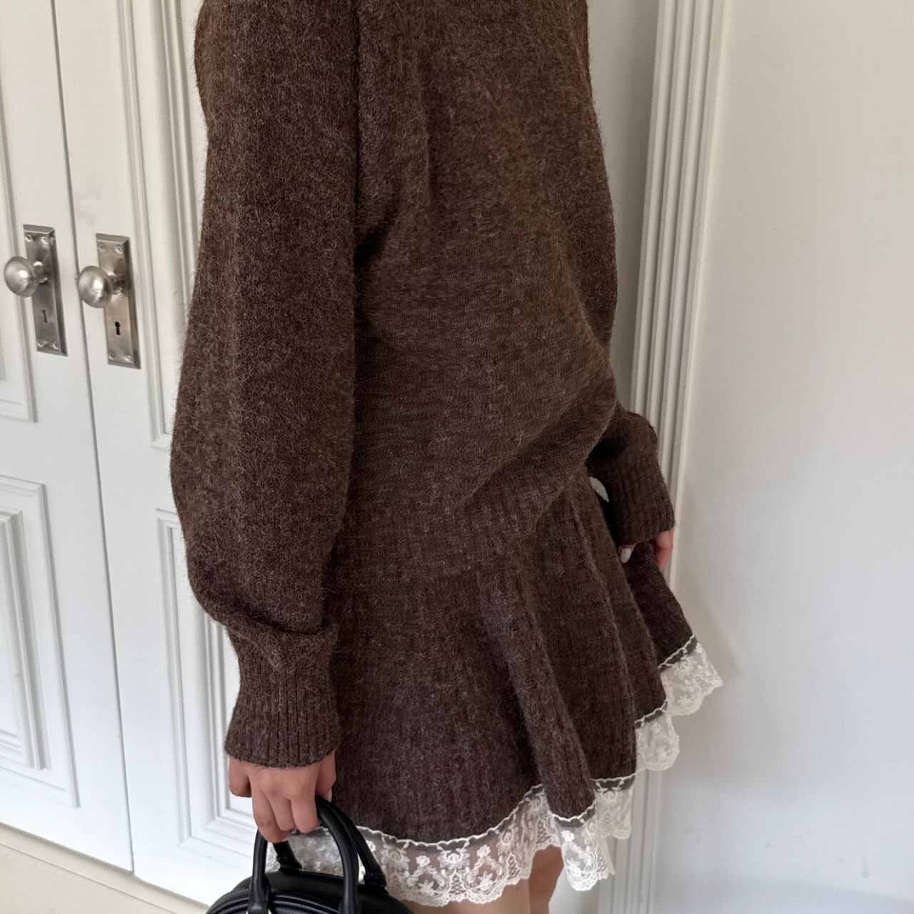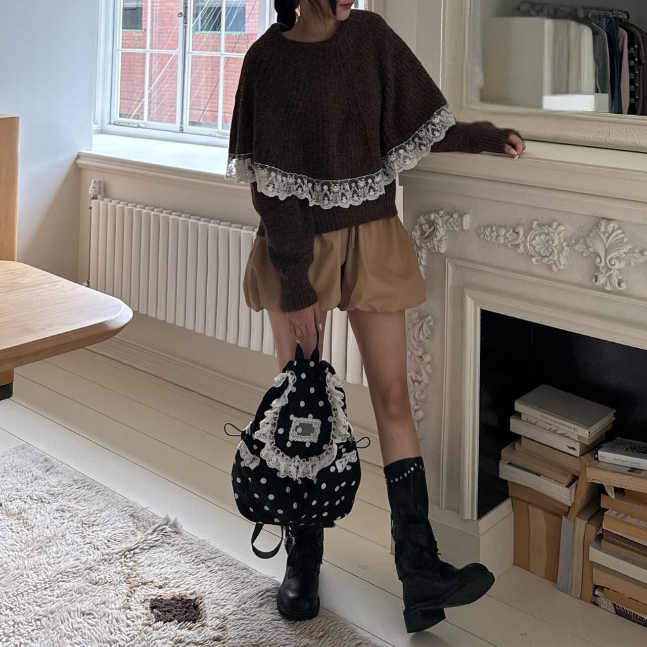 深みのあるブラウンのふわふわニットに、繊細なレースがひらひらと揺れる2WAYケープがセットになった、エレガントで遊び心たっぷりのアイテムです。ケープとして肩にさらっと羽織れば、レーストリムがゆらゆらと優雅に揺れて上品な印象をぱっと演出してくれます。さらに驚きなのが、このケープはスカートとしてもすっぽり着用できる2WAY仕様になっているところです。気分やシーンに合わせてくるくるスタイルチェンジできる楽しさがぎゅっと詰まっているアイテムです。