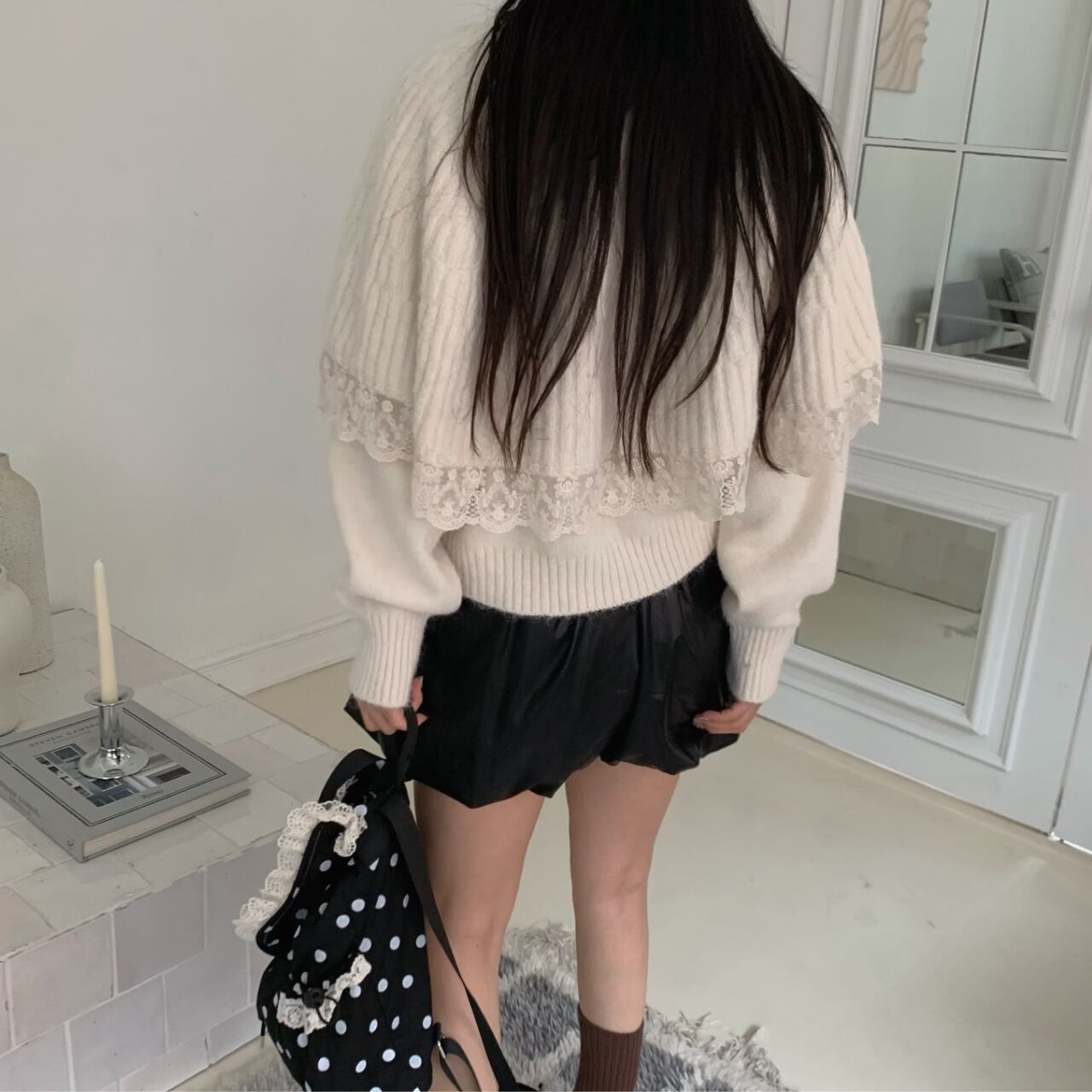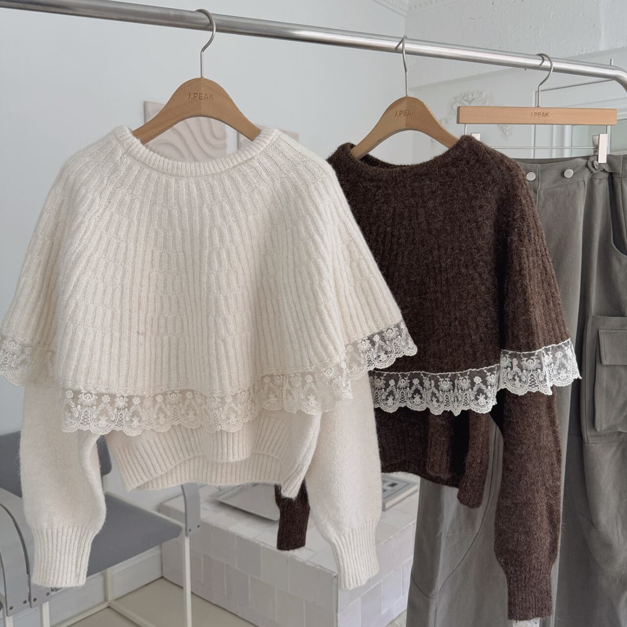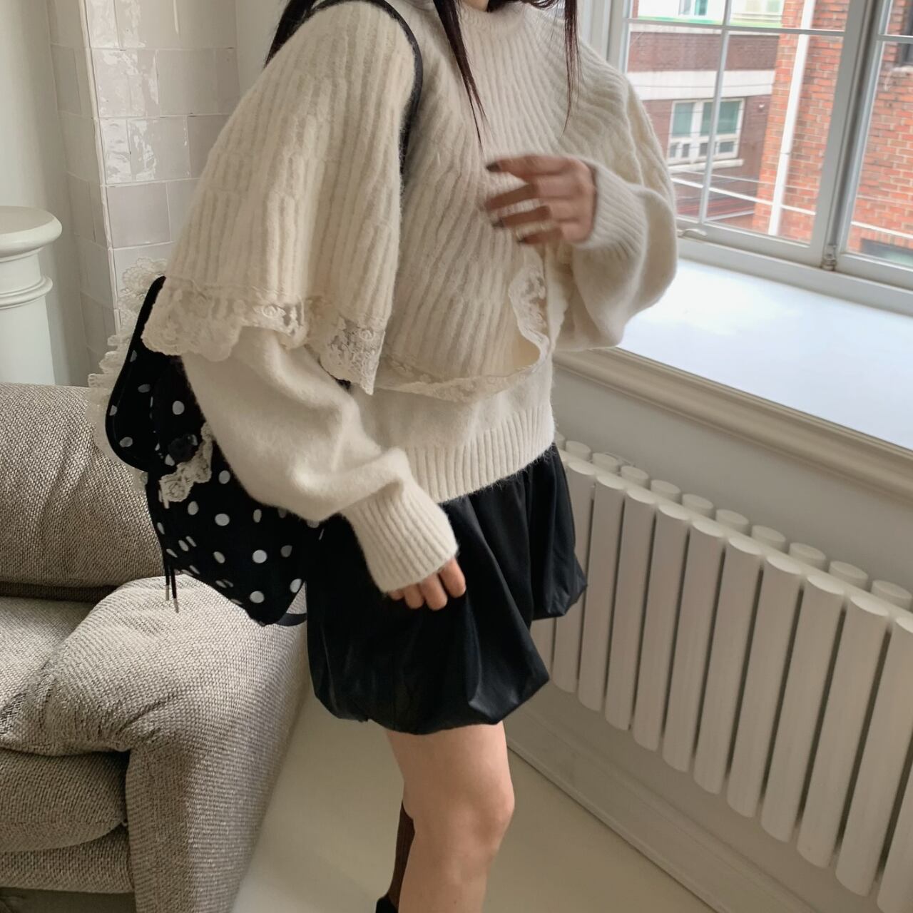 ふわふわニットに、繊細なレースがひらひらと揺れる2WAYケープがセットになった、エレガントで遊び心たっぷりのアイテムです。ケープとして肩にさらっと羽織れば、レーストリムがゆらゆらと優雅に揺れて上品な印象をぱっと演出してくれます。さらに驚きなのが、このケープはスカートとしてもすっぽり着用できる2WAY仕様になっているところです。気分やシーンに合わせてくるくるスタイルチェンジできる楽しさがぎゅっと詰まっているアイテムです。