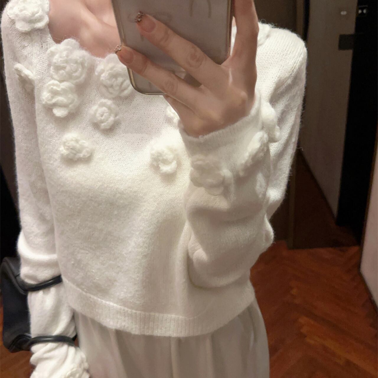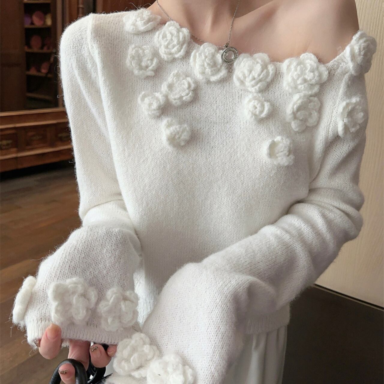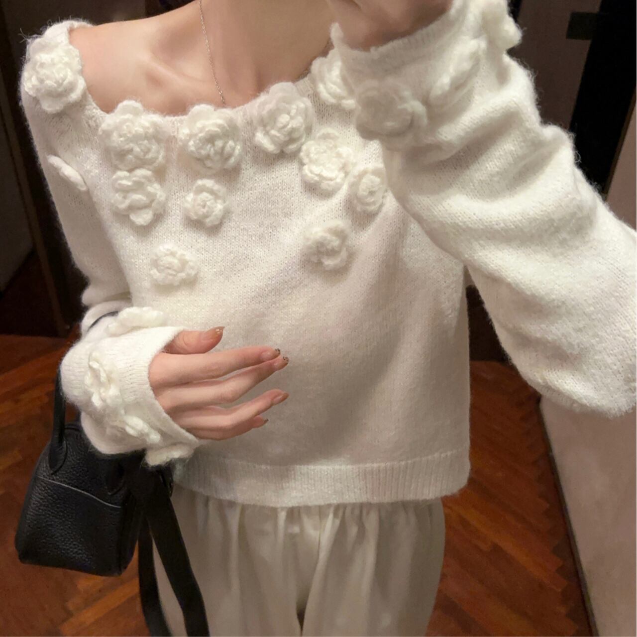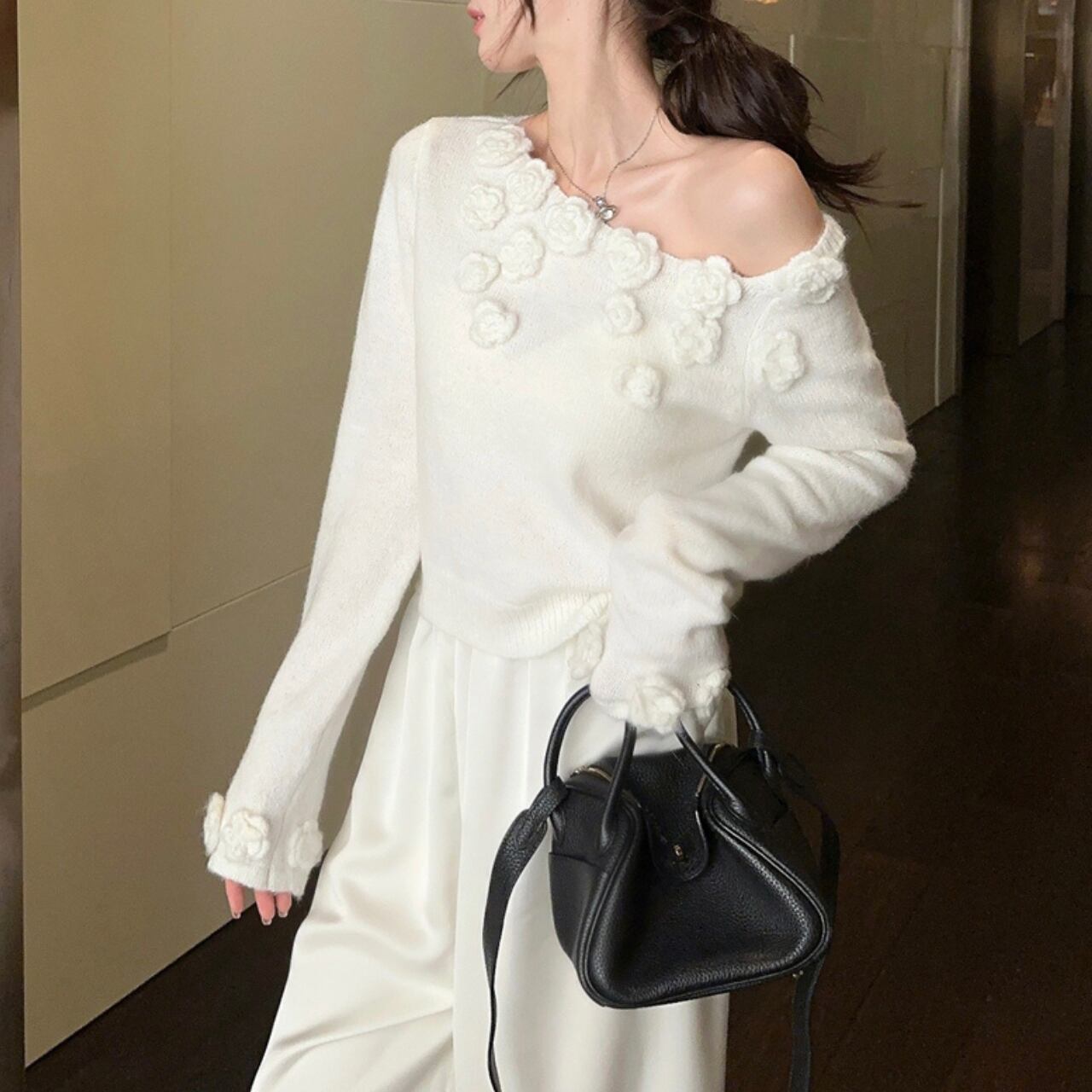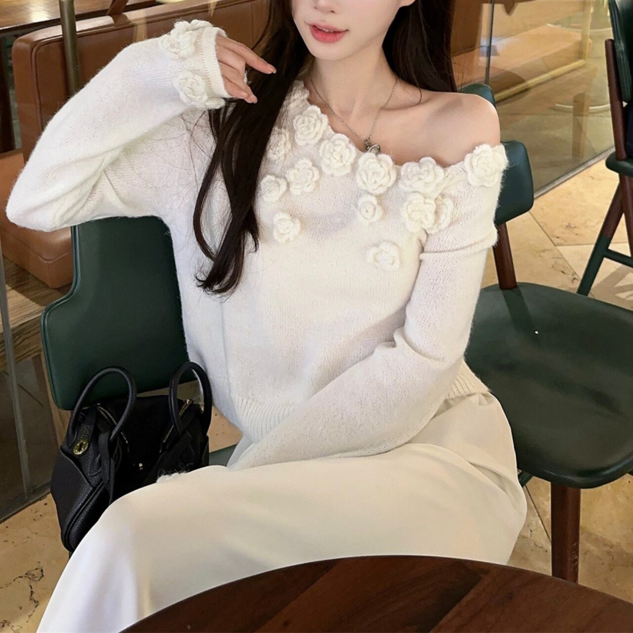 ピュアホワイトのニットに立体的なローズモチーフがぷっくりと咲き誇る、ロマンティックなオフショルダーニットです。デコルテラインにぽこぽこと並んだ白いバラが女性らしい華やかさをたっぷり演出し、肩をさらっと見せるオフショルダーデザインが抜け感をふわっとプラスしてくれます。ボリューム袖がぽわんと膨らんで可愛らしさをぎゅっと引き立て、手首のフリルがひらひらと揺れるたびにエレガントな印象を与えます。パンツやスウェットと合わせてもフェミニンさは残しつつリラックスコーデが完成します。