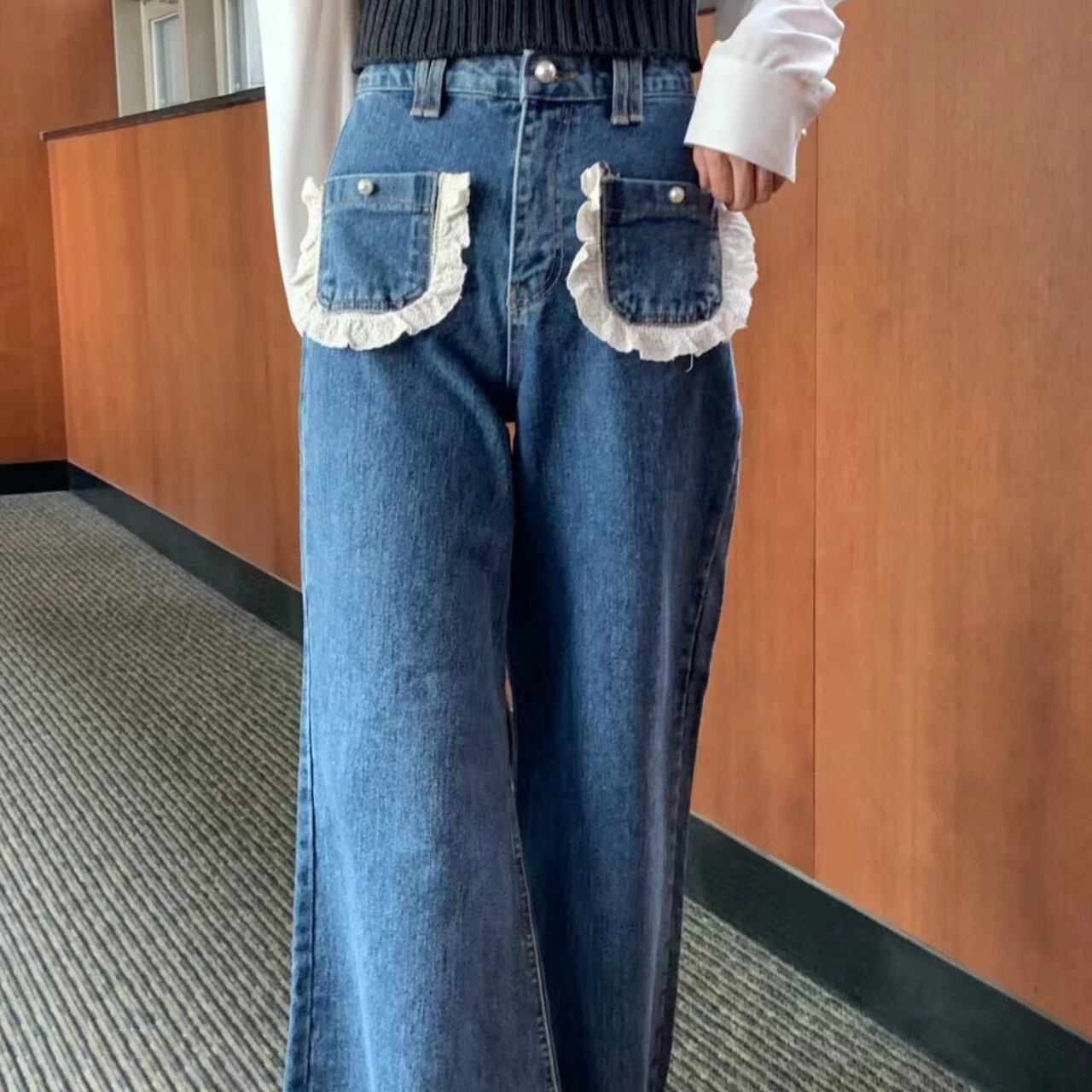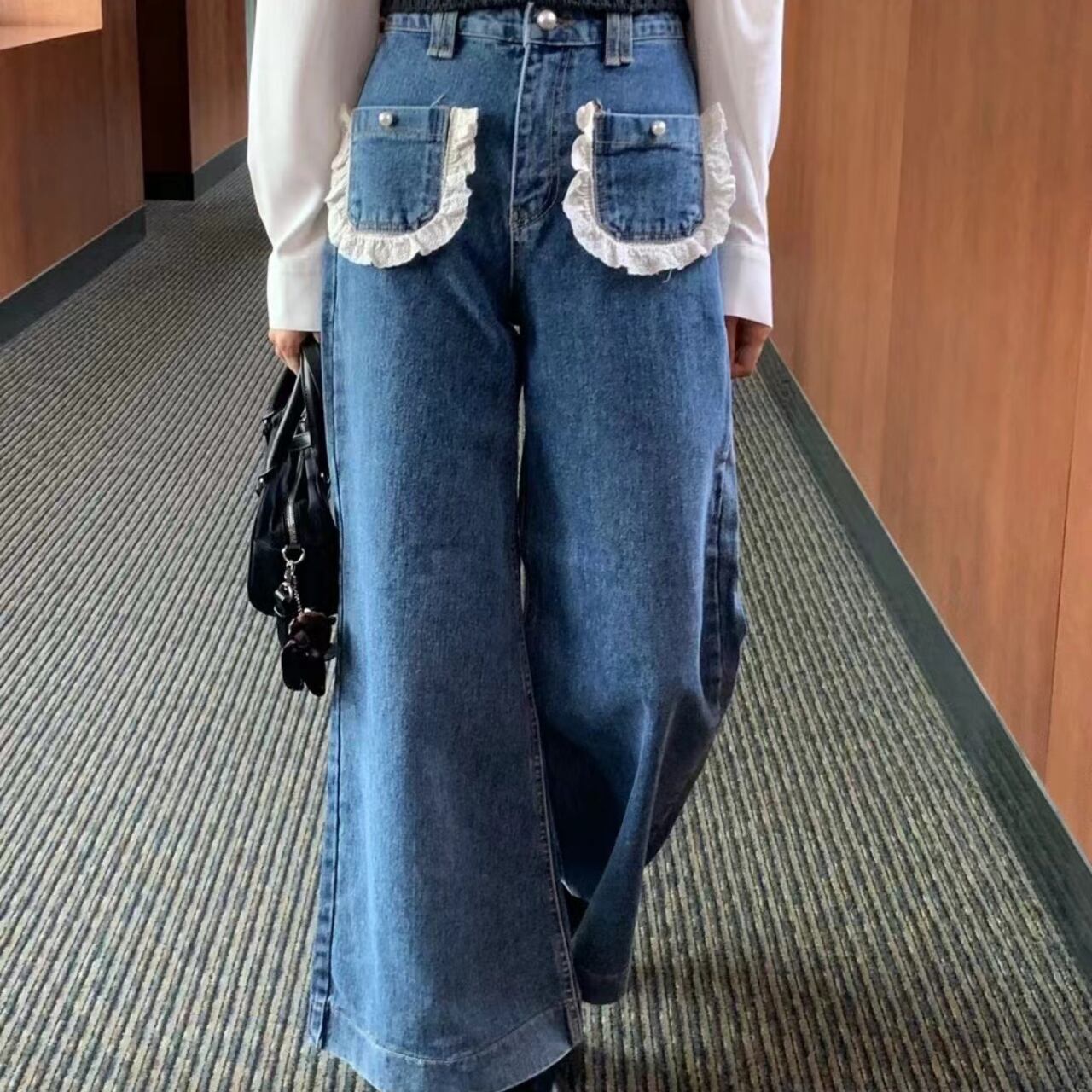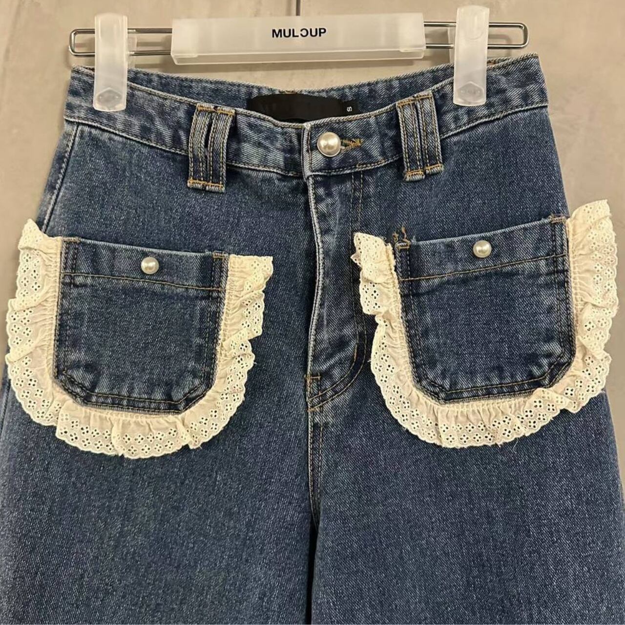 ブルーデニムに、ポケットのレースがポイントの、個性的で可愛いワイドデニムパンツです。