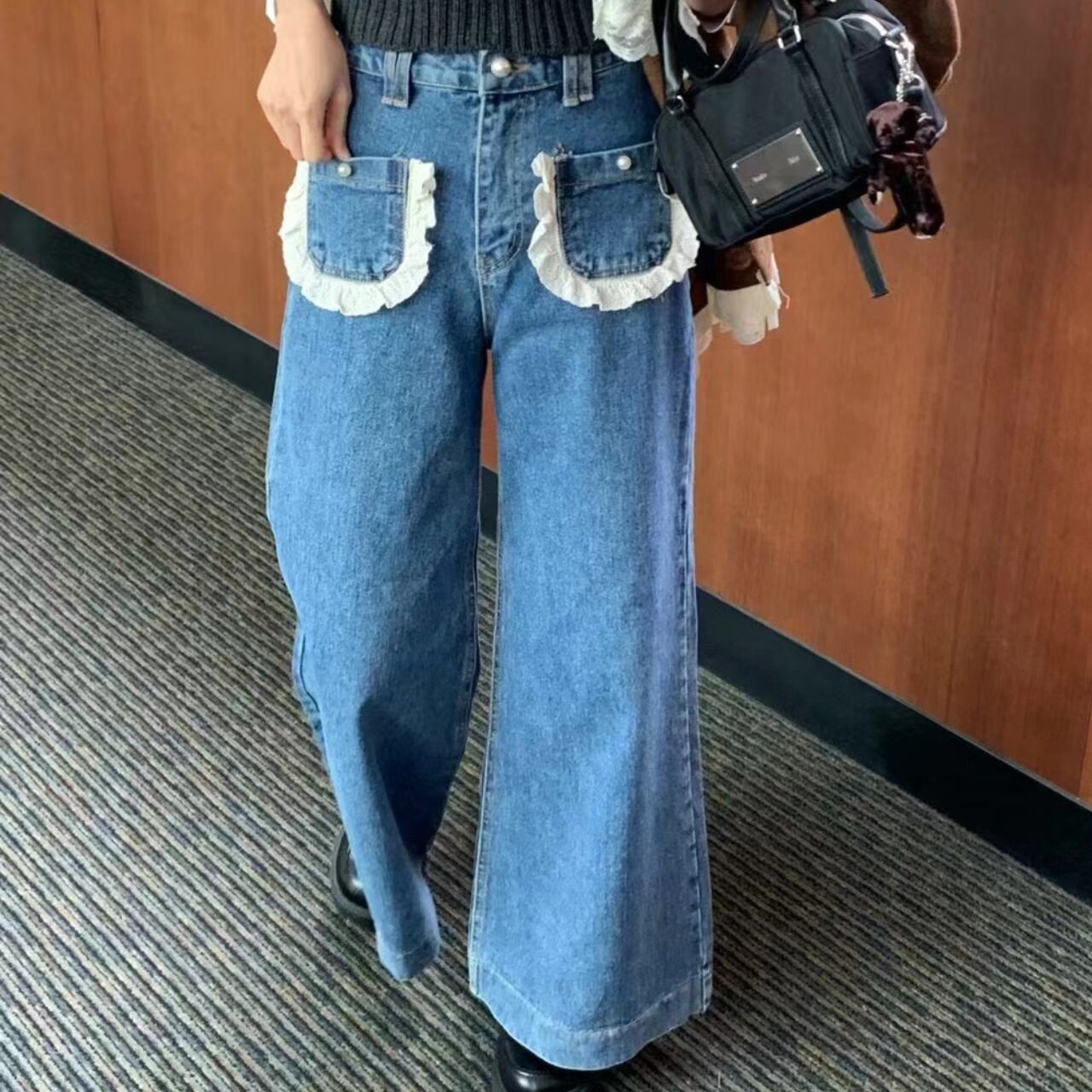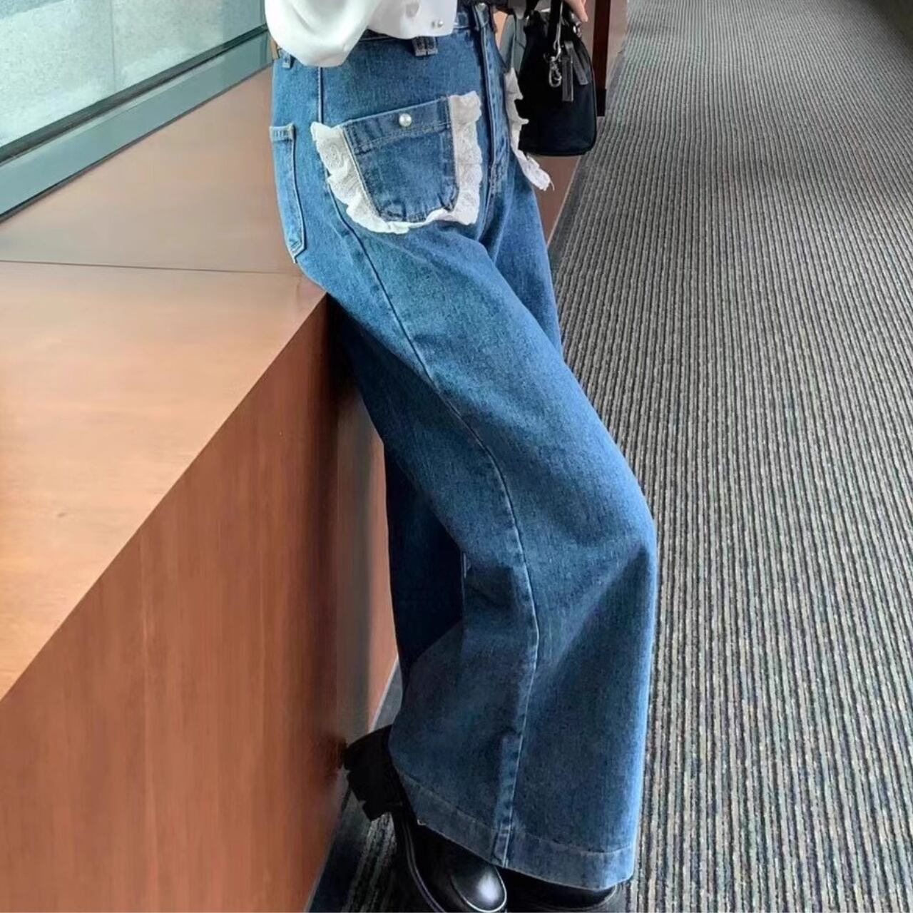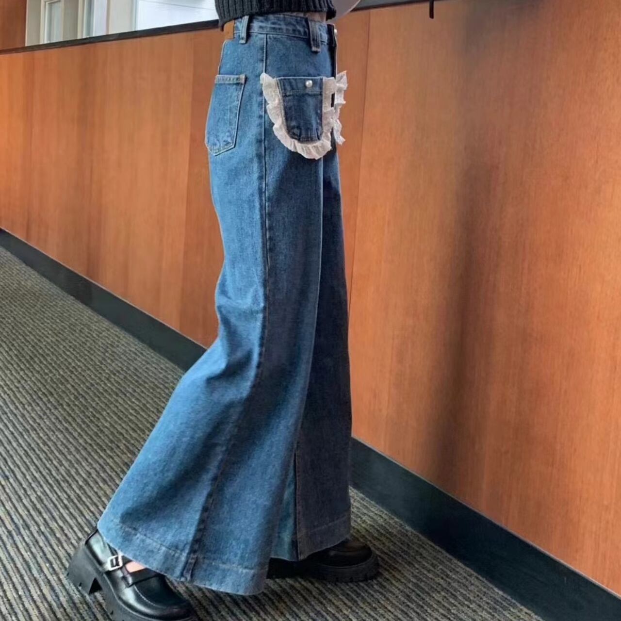 ブルーデニムに、ポケットのレースがポイントの、個性的で可愛いワイドデニムパンツです。