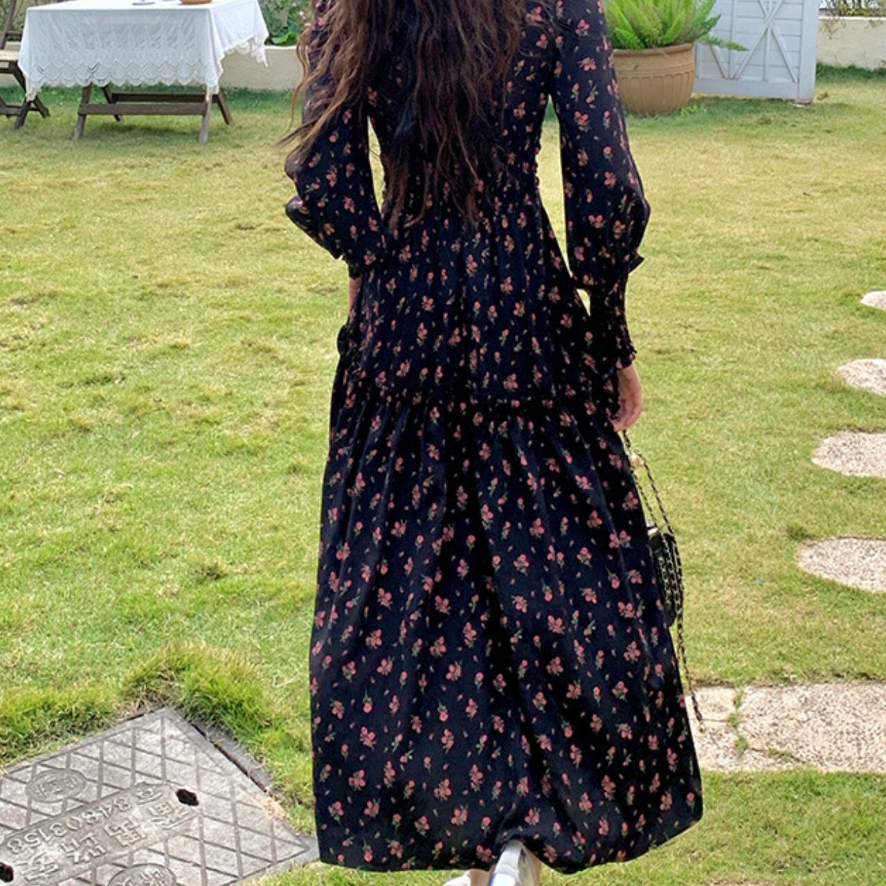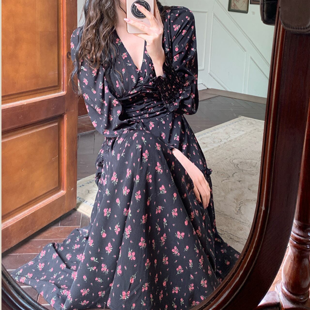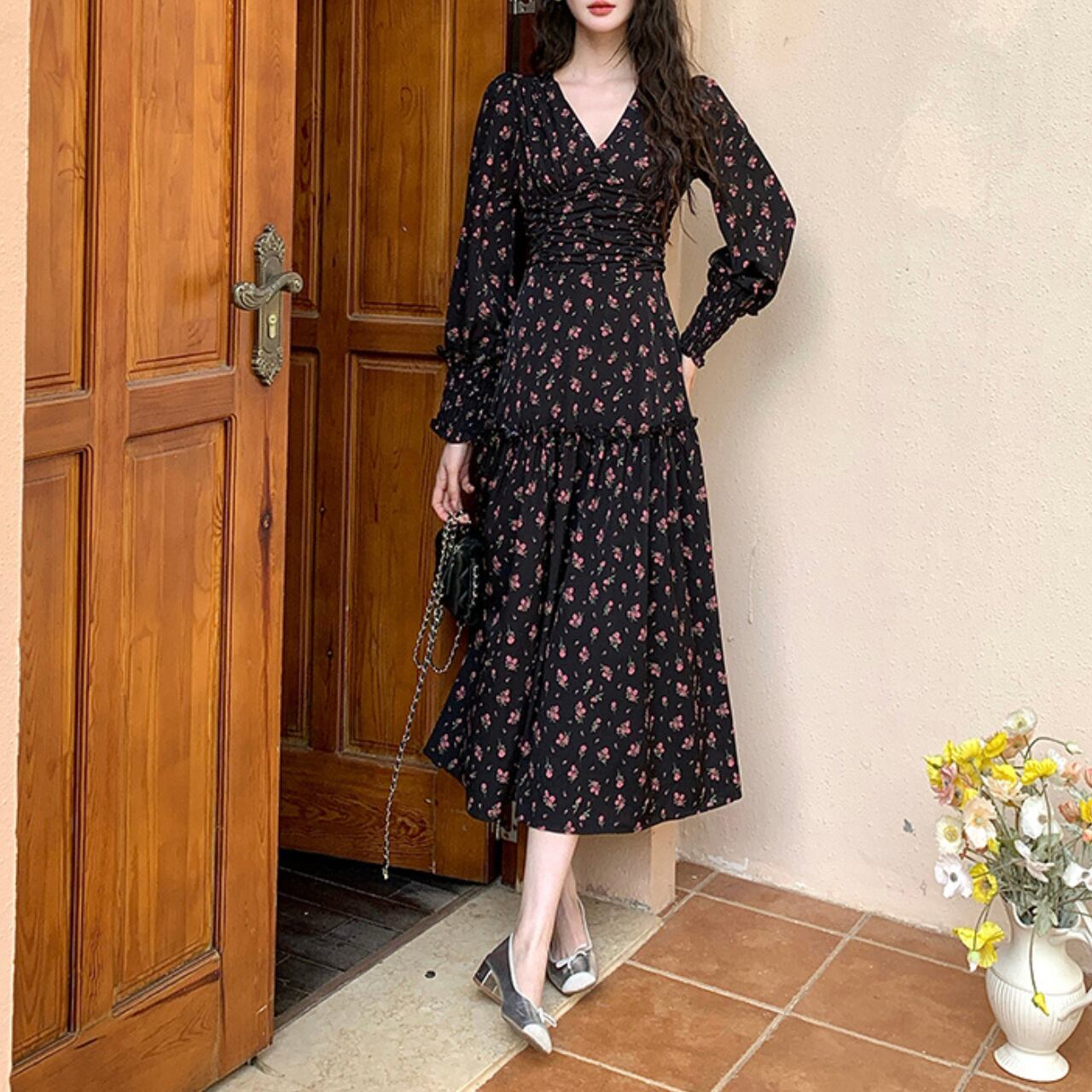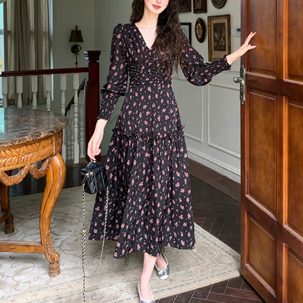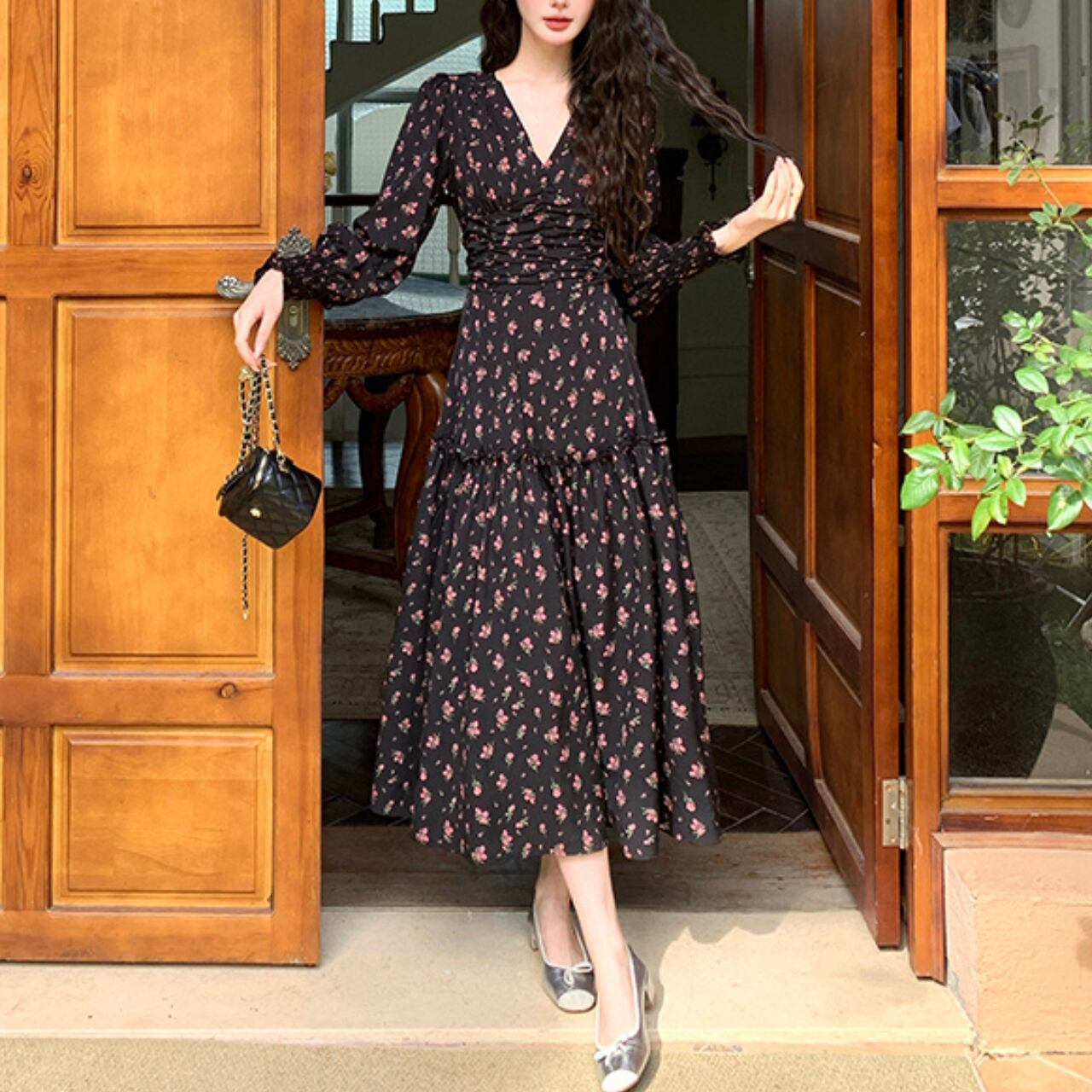 シックなブラックに小さなピンクフラワーが咲き誇る、エレガントで華やかなティアードワンピースです。深いVネックラインが顔まわりをすっきりと見せ、大人の女性らしい上品な印象を演出します。
