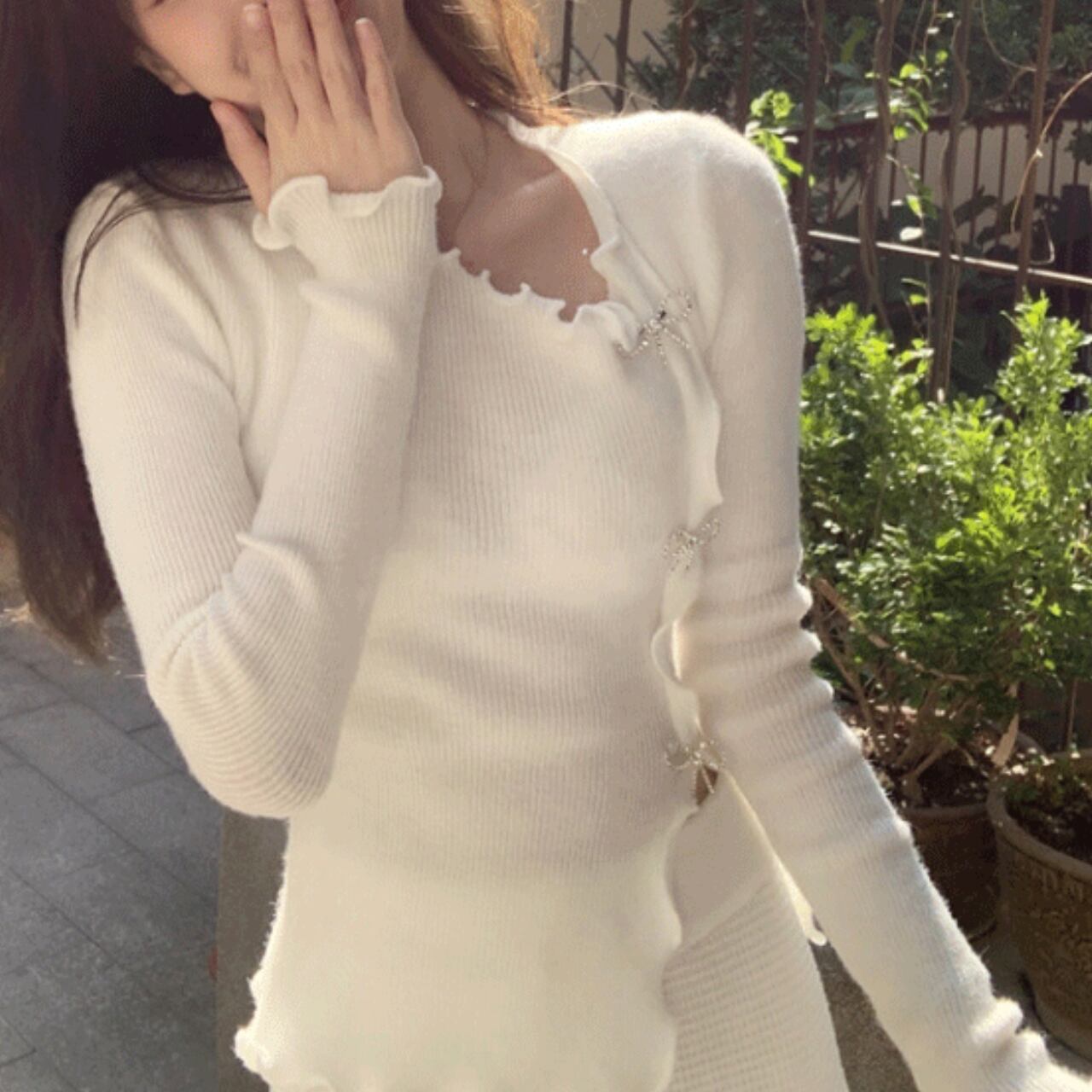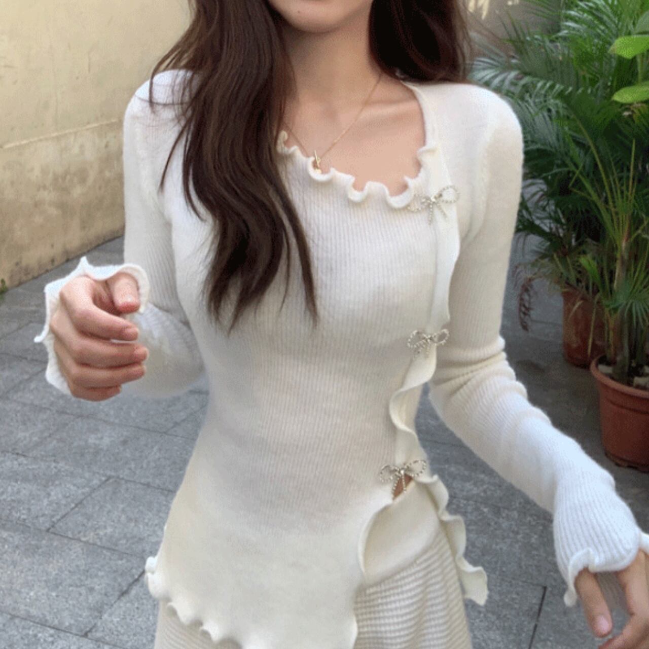 可愛らしいホワイトリボンがアクセントを添える、エレガントなスリムフィットトップスです。襟元の波打つようなスカラップデザインにリボンモチーフが飾られ、袖口のフリルトリムがクラシカルな雰囲気をプラスし、ディテールまでこだわった上品なデザインです。