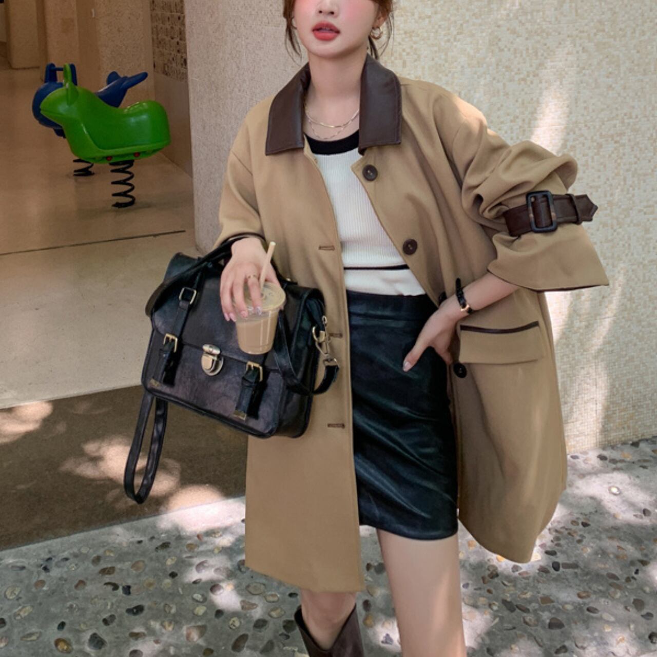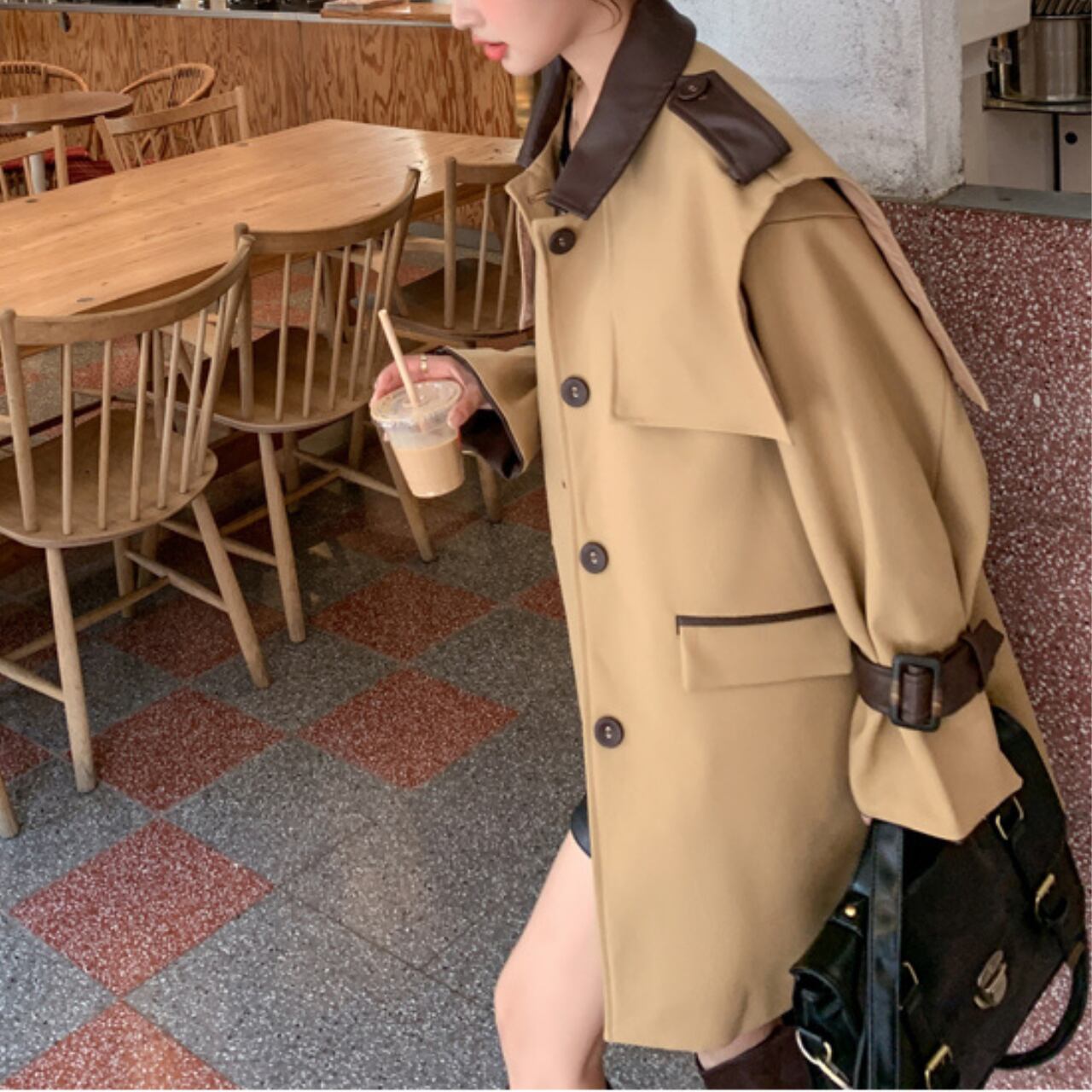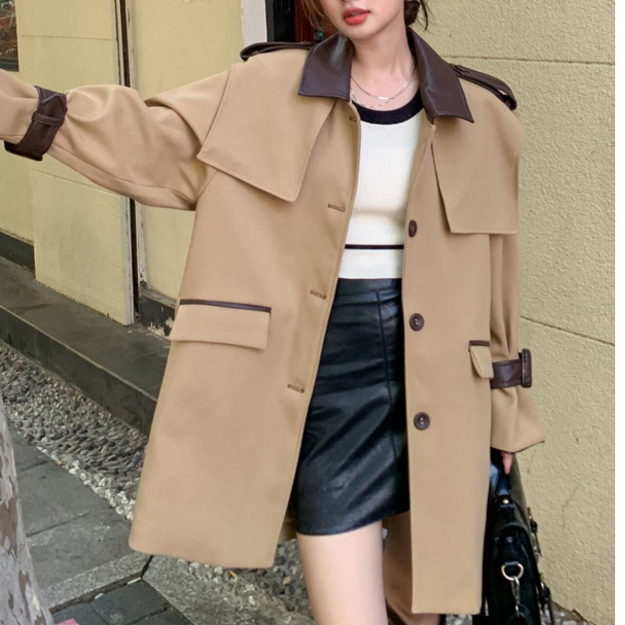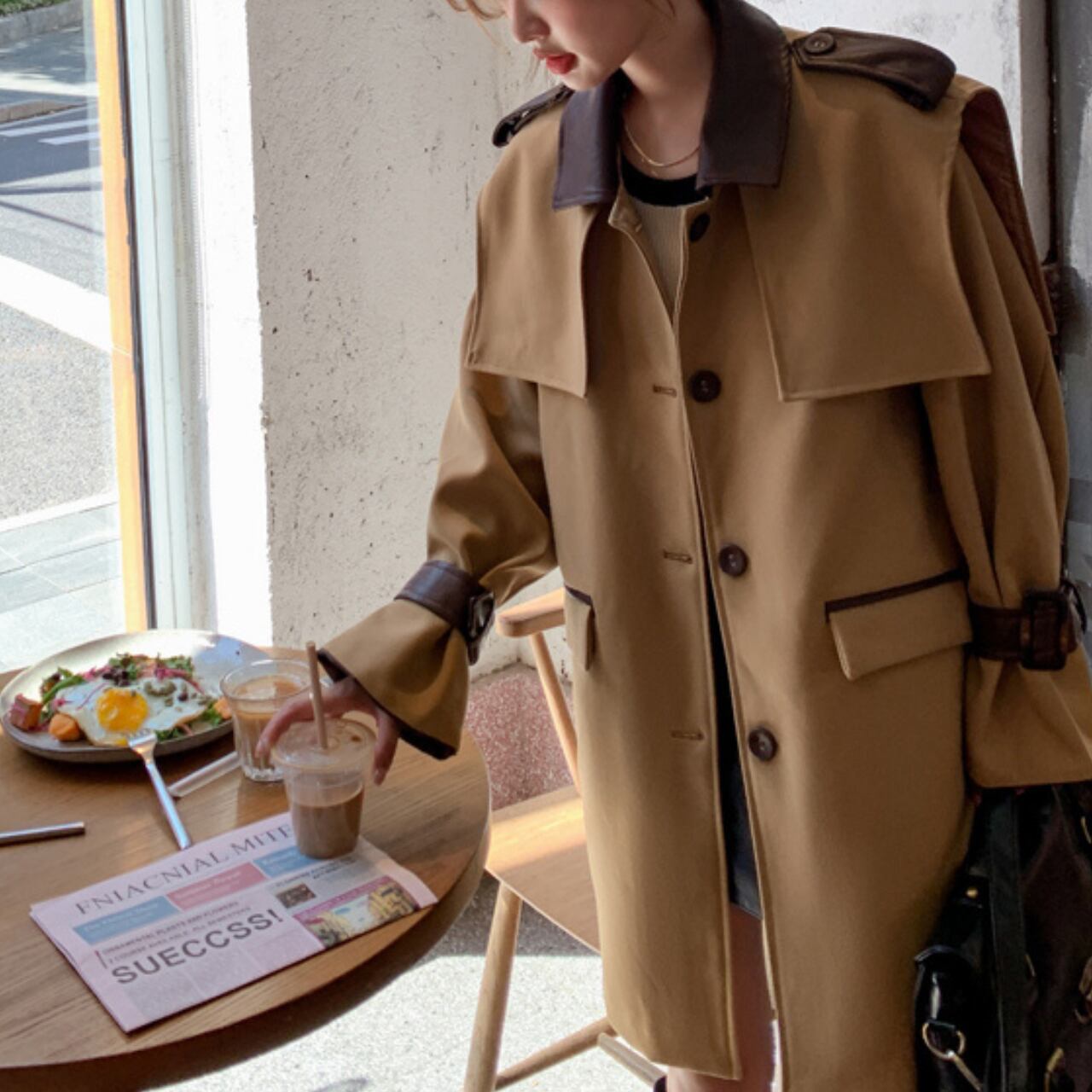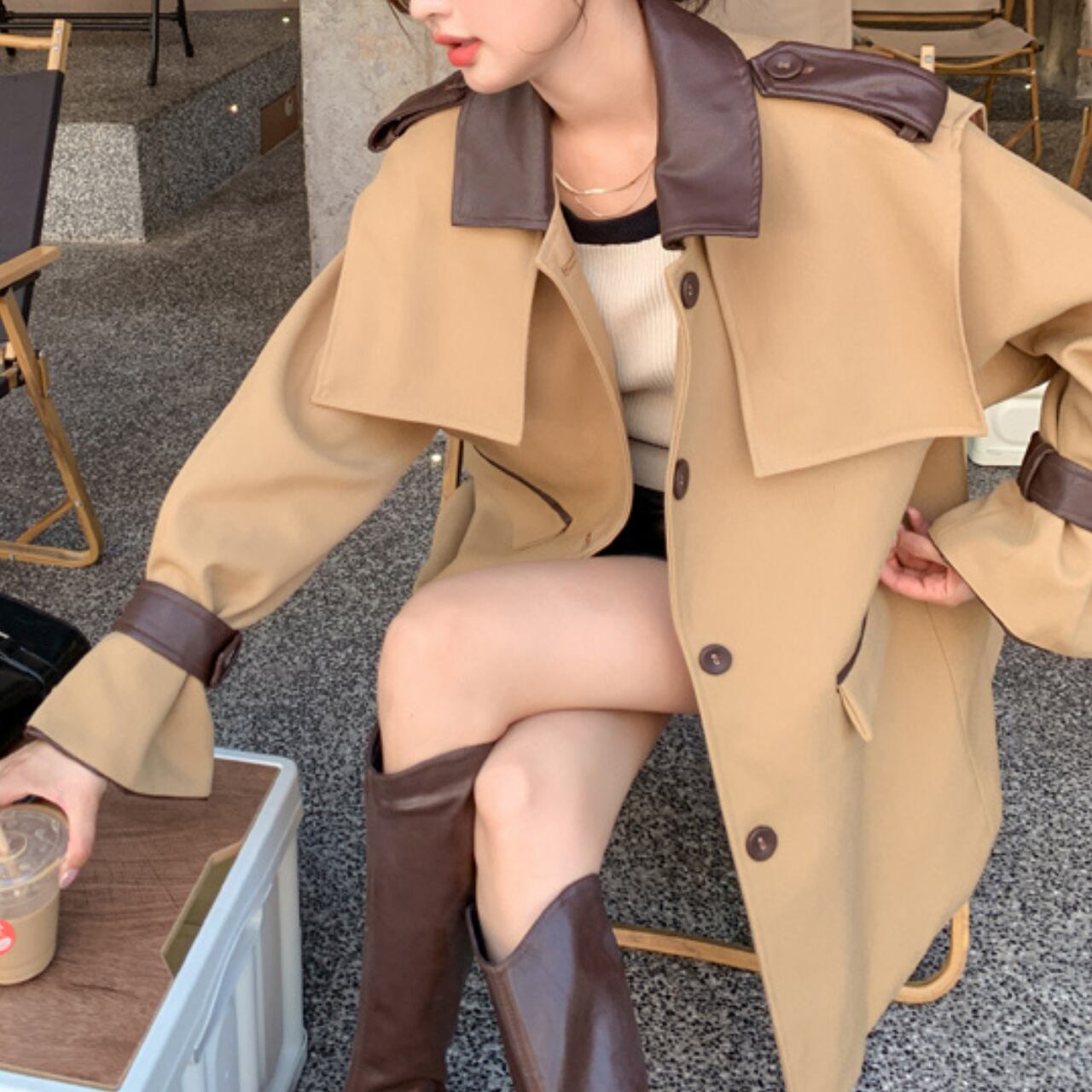 上品なベージュボディにブラウンの襟とトリムがアクセントを添える、洗練されたバイカラートレンチコートです。クラシックなデザインに配色使いが現代的な印象をプラスし、シンプルながらも存在感のある一枚に仕上がっています。