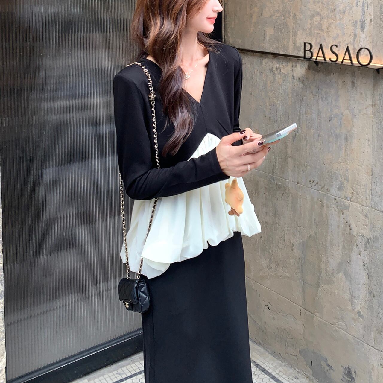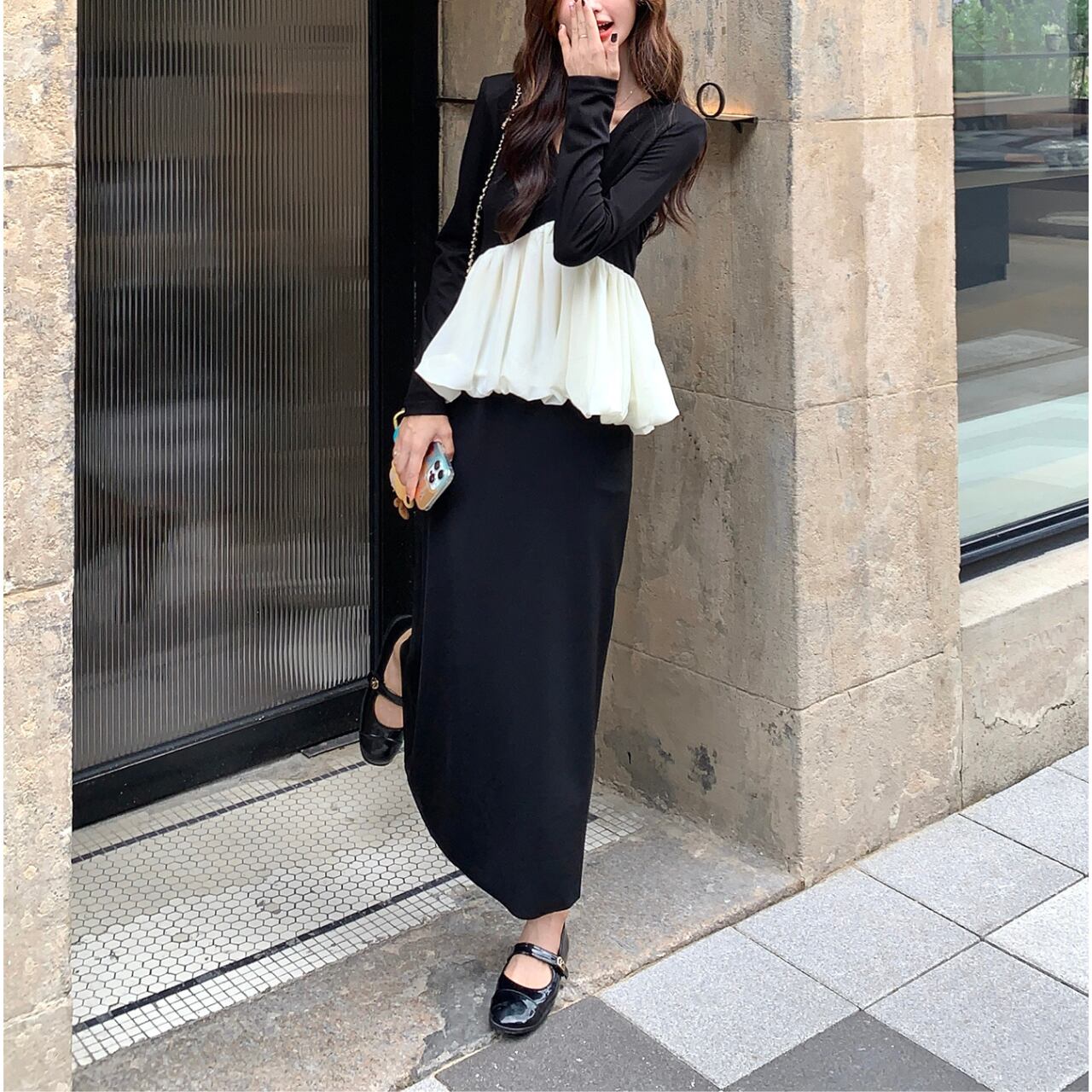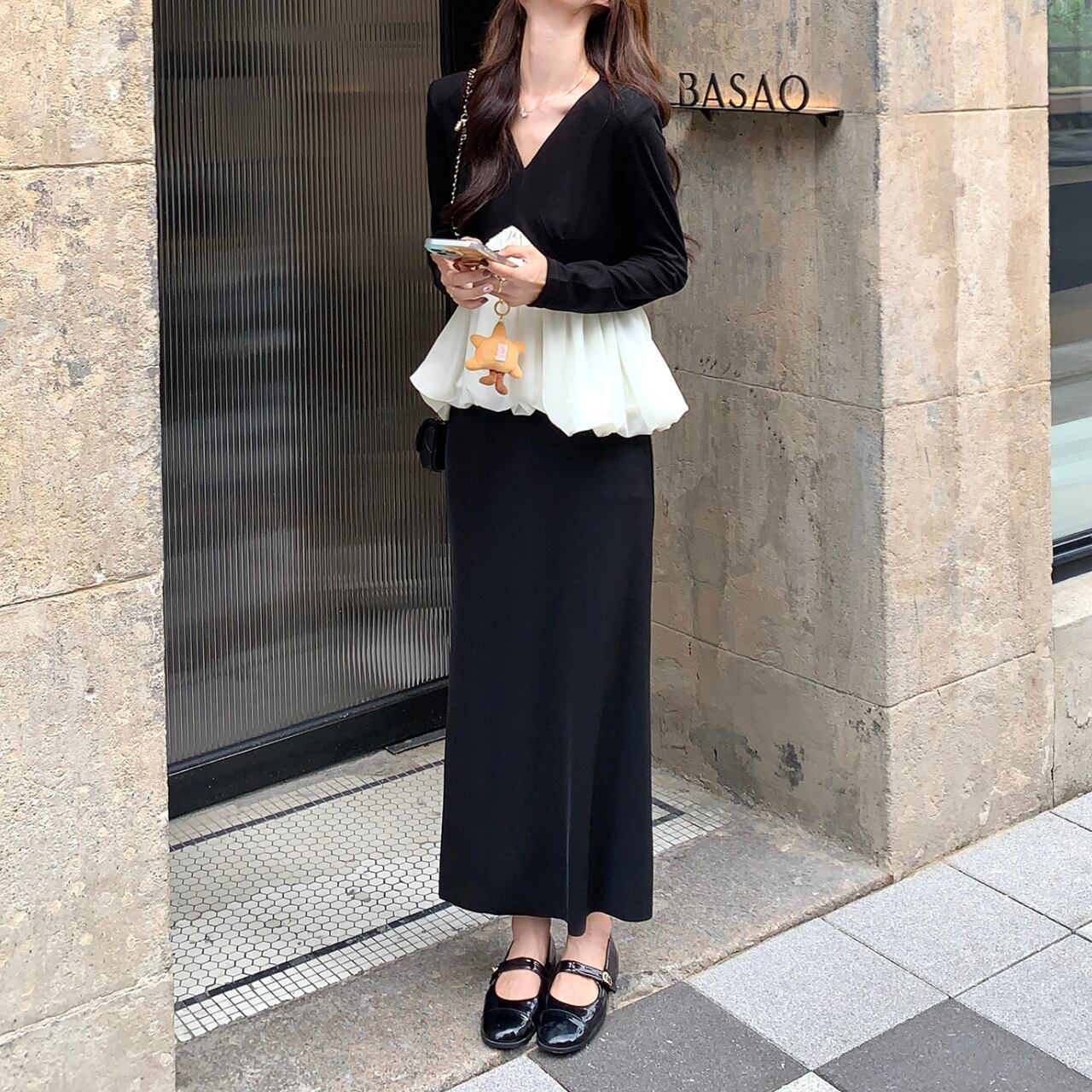 深いVネックラインがデコルテを美しく見せ、ウエスト部分のホワイトペプラムが女性らしいアクセントとなり、スタイルアップ効果も抜群です。ブラックとホワイトのコントラストが目を引く個性的なデザインで、印象的なコーディネートが完成します。