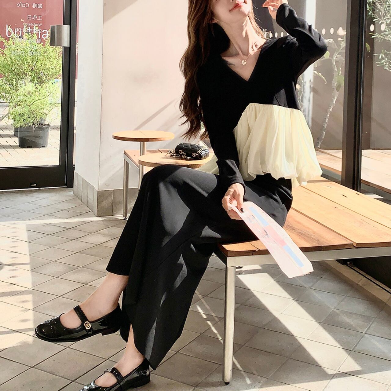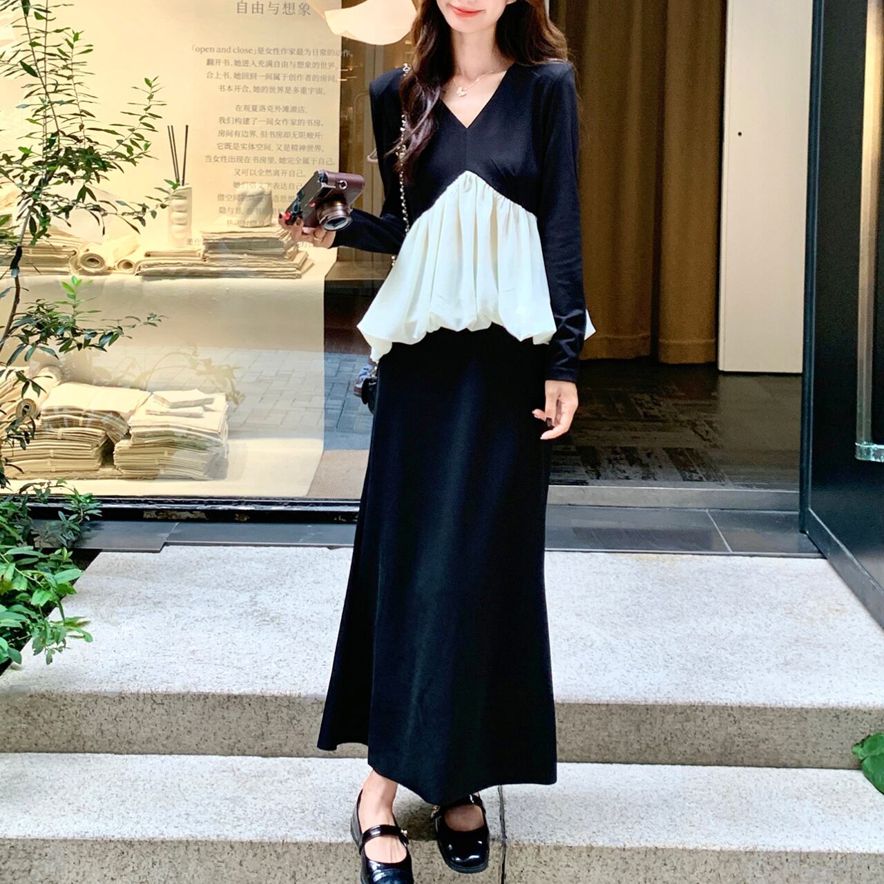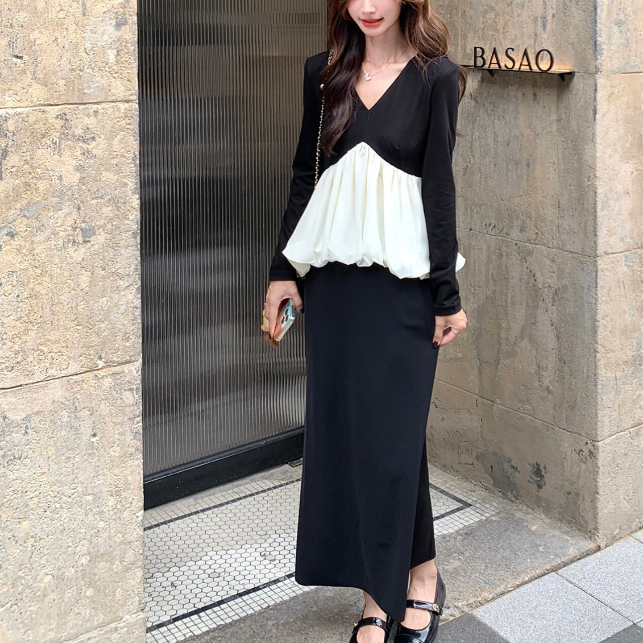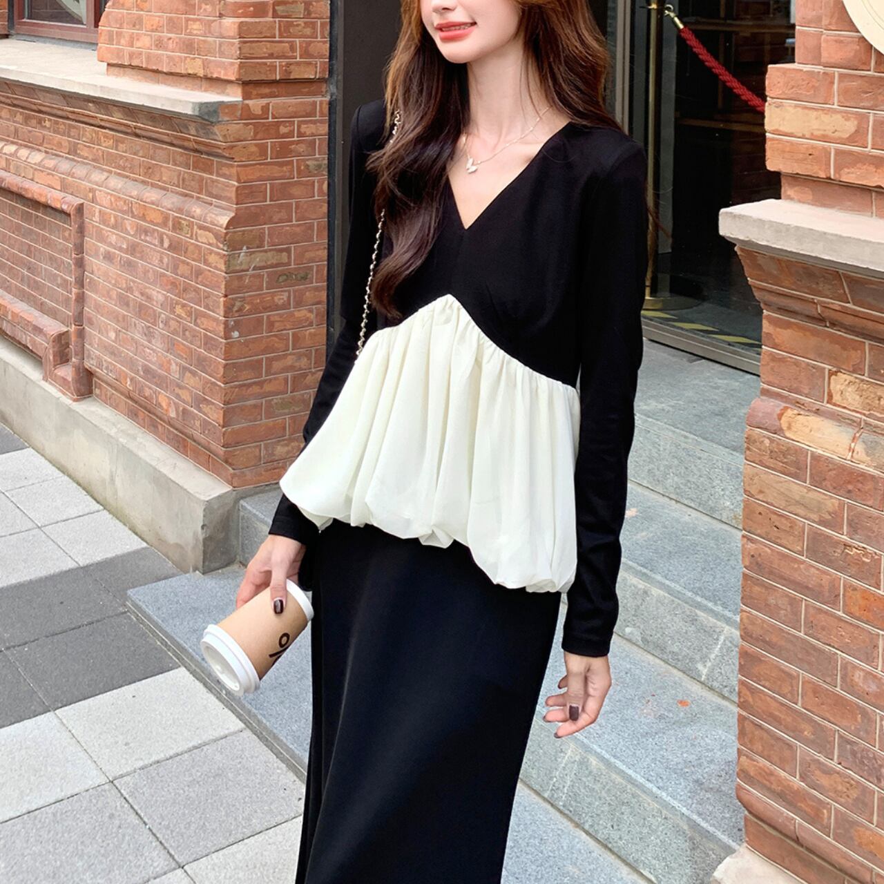 深いVネックラインがデコルテを美しく見せ、ウエスト部分のホワイトペプラムが女性らしいアクセントとなり、スタイルアップ効果も抜群です。ブラックとホワイトのコントラストが目を引く個性的なデザインで、印象的なコーディネートが完成します。