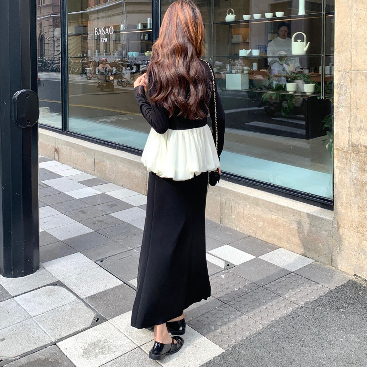シックなブラックにホワイトのペプラムが映える、モダンで洗練されたバイカラーのセットアップです。