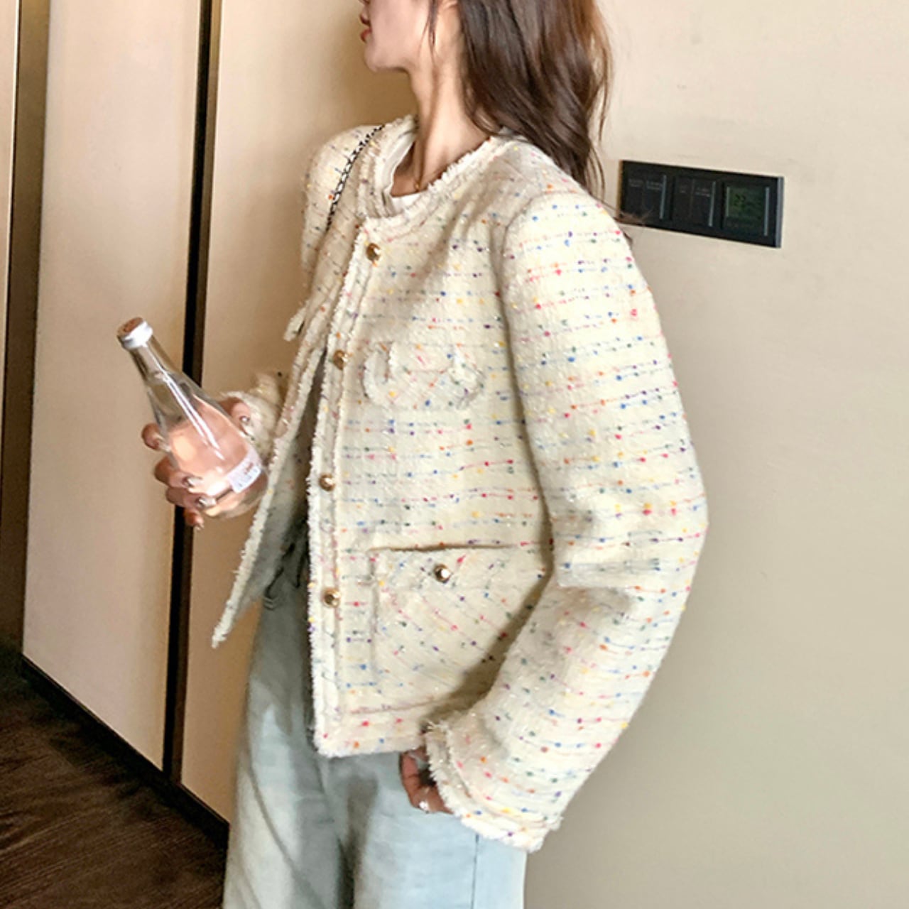 ベージュベースにカラフルな色糸が散りばめられた、上品で華やかなツイードジャケットです。