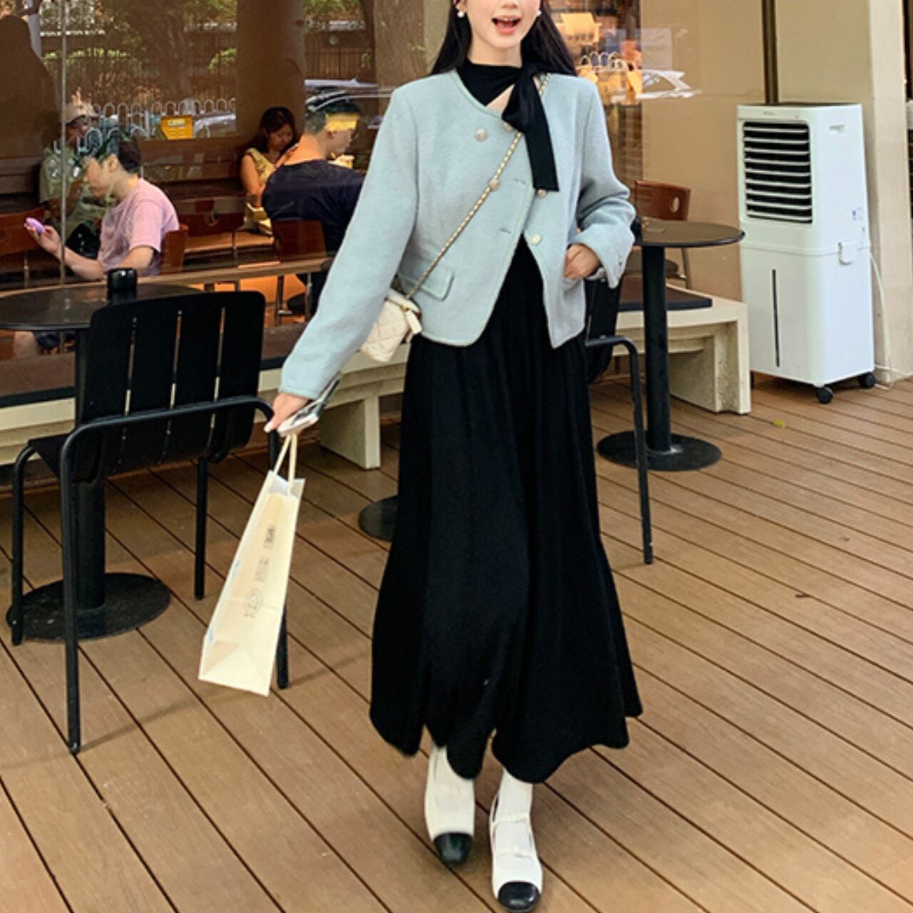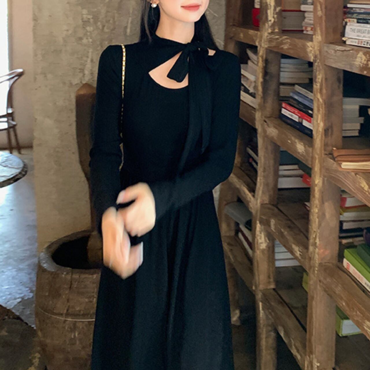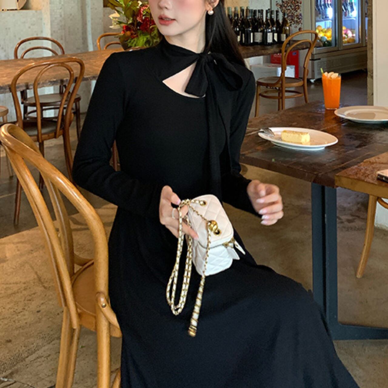 ウエスト部分は程よくフィットし、スカート部分がふんわりと広がるAラインシルエットで、体型カバー効果も抜群です。膝丈の上品な着丈で、シンプルなブラックだからこそ、リボンとカットアウトのディテールが際立ち、一枚で主役級の存在感を放ちます。