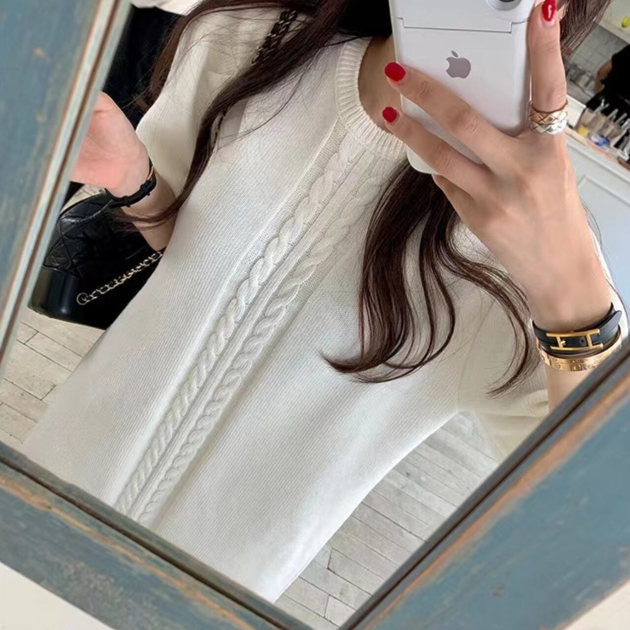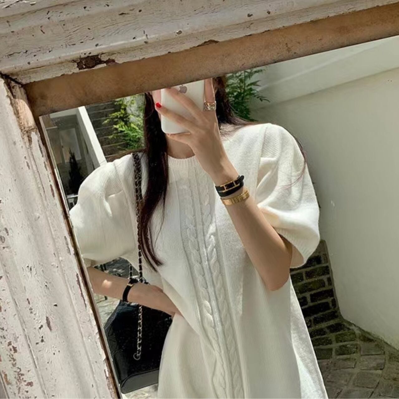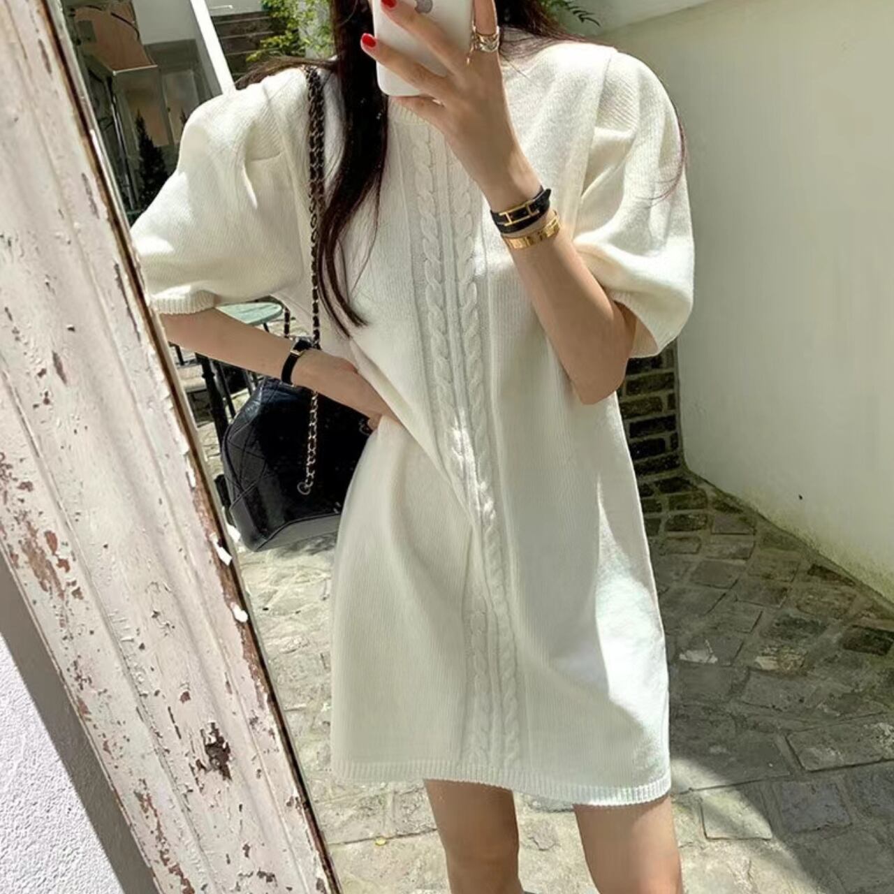 フロントのケーブル編みが上品なアクセントを添える、フェミニンなニットワンピースです。