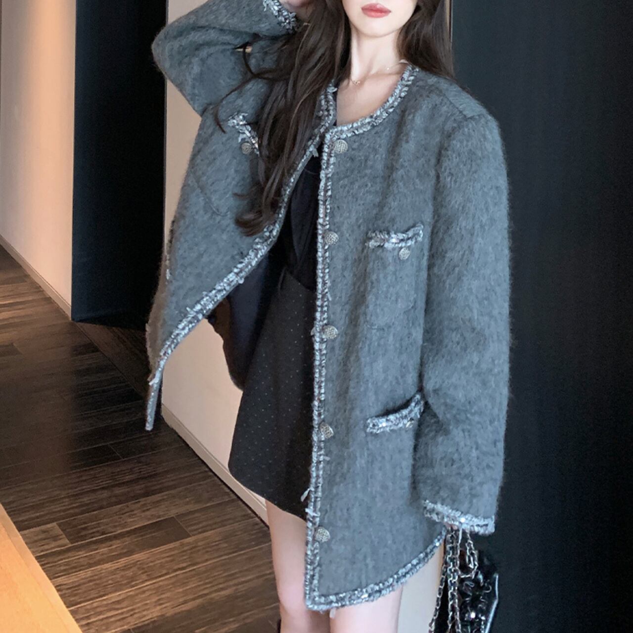深みのあるグレーブルーが上品な印象を与える、ラグジュアリーなツイードジャケットです。