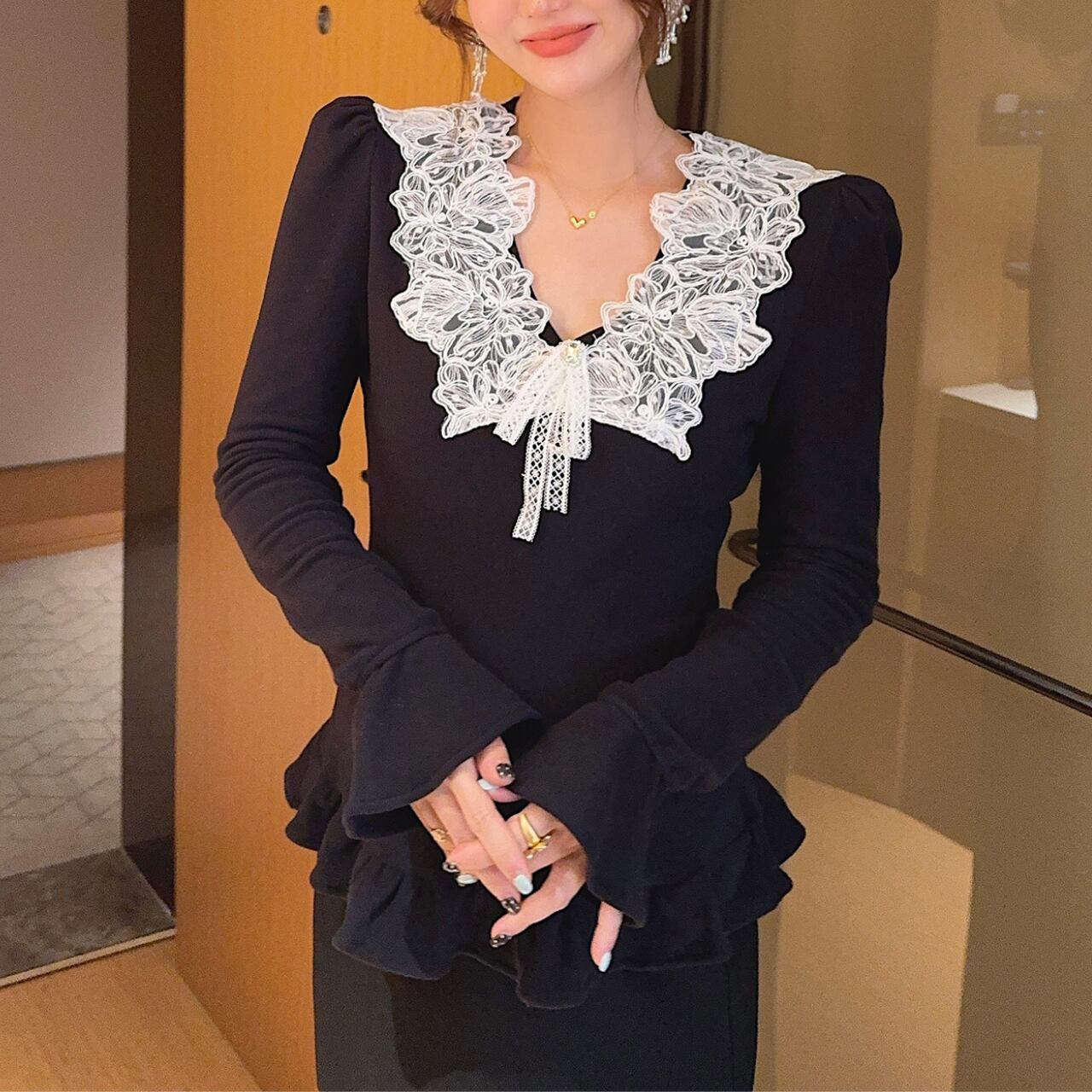 Vネック レーストリムトップス A4469