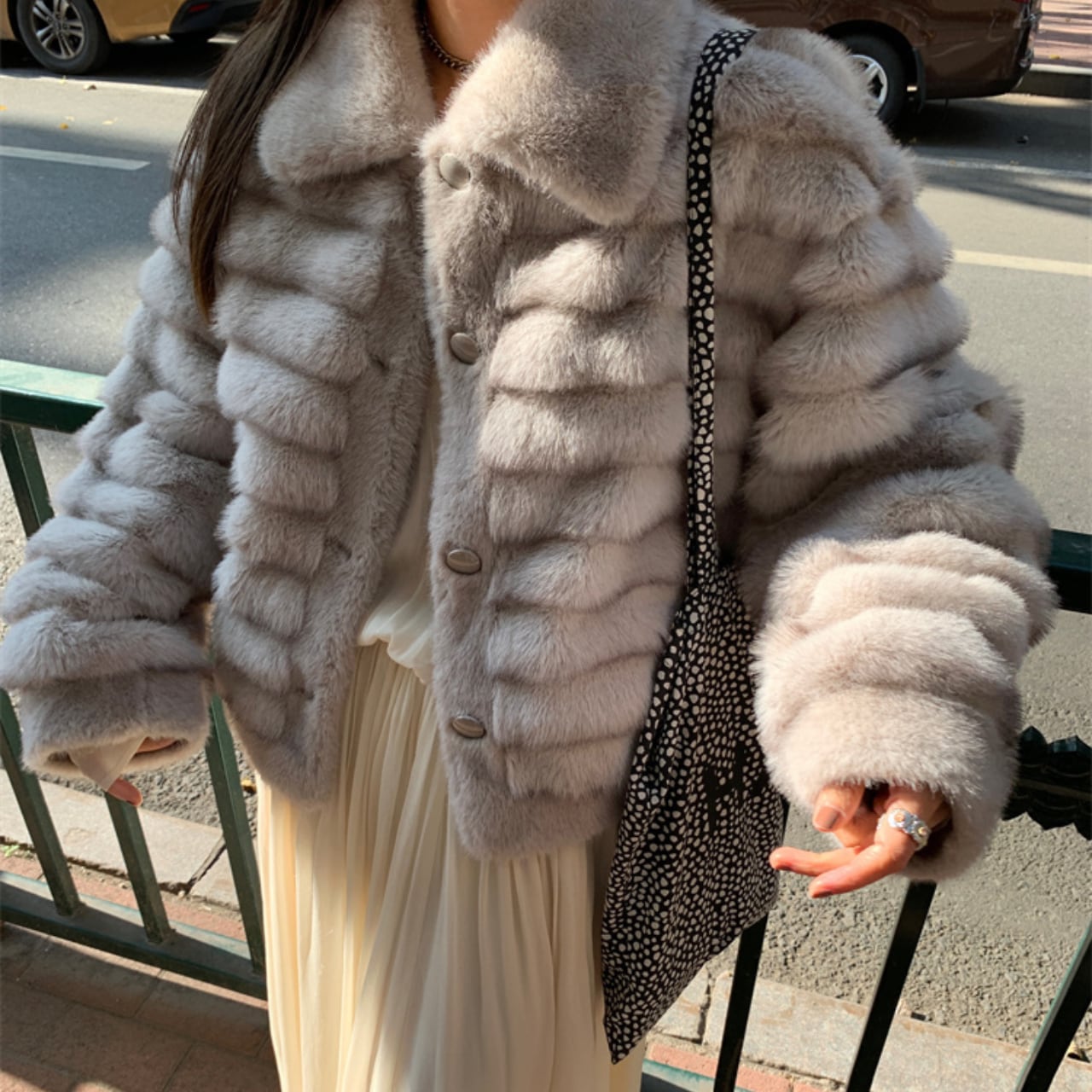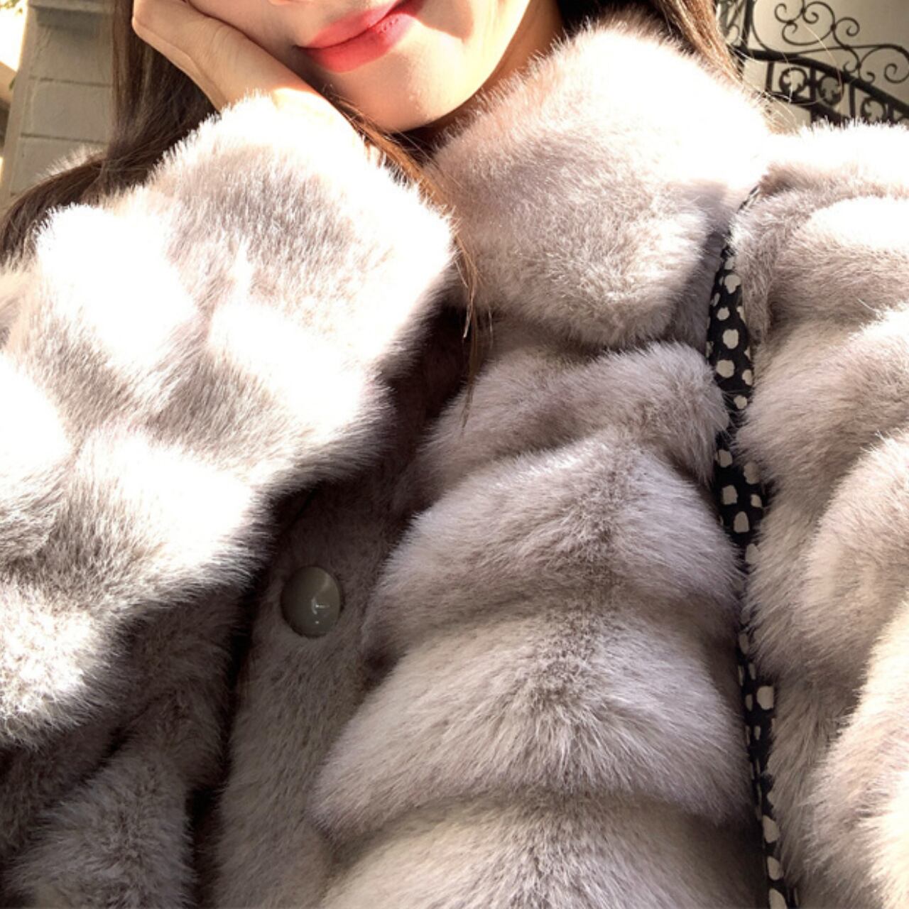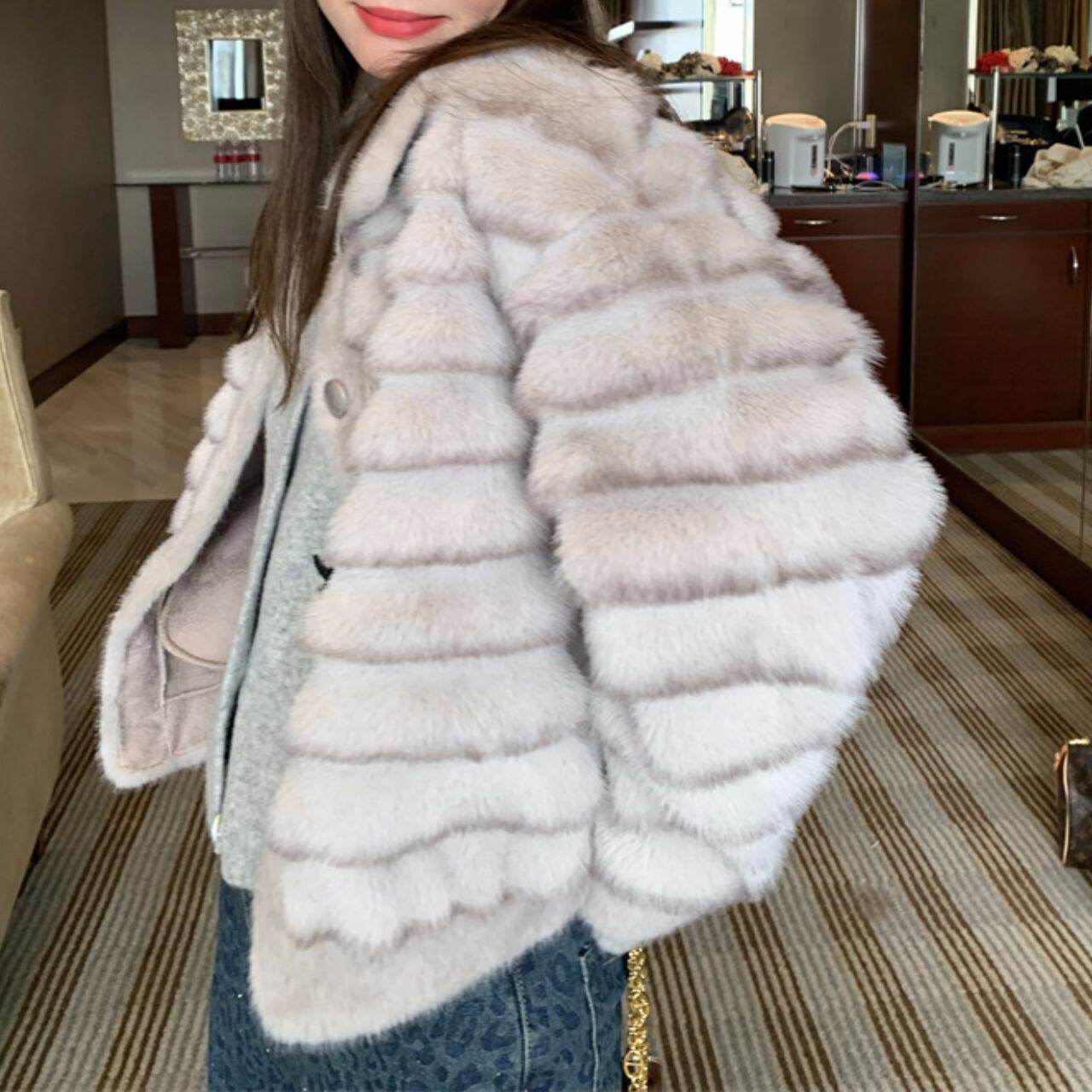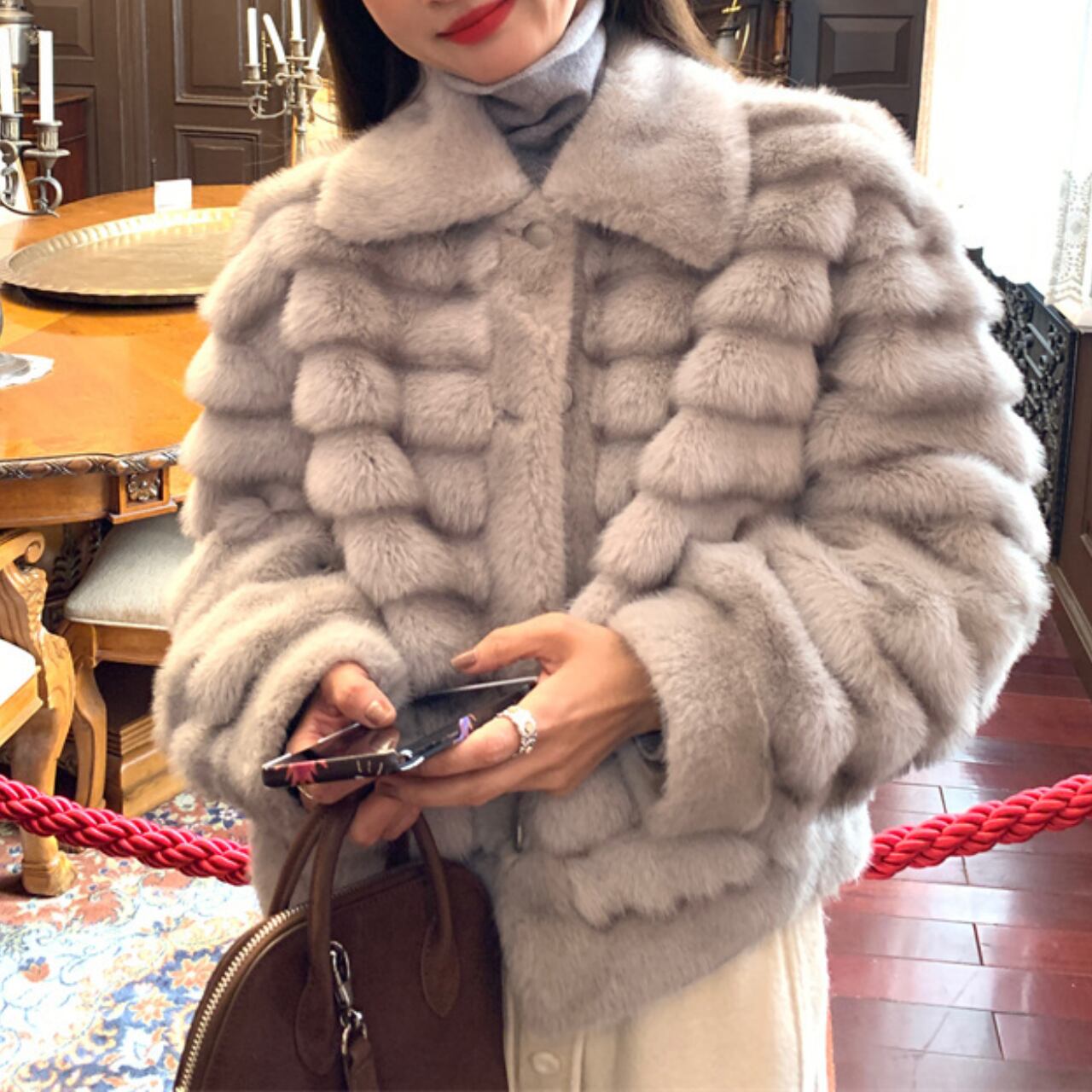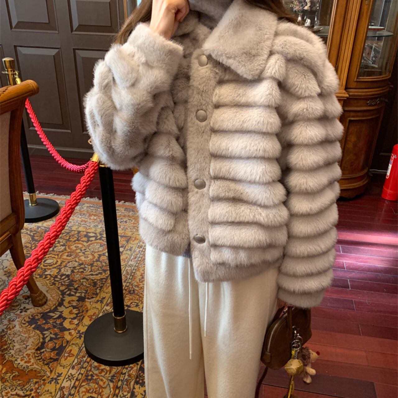 上品なライトグレーのフェイクファーを使用した、ラグジュアリーなショートジャケットです。