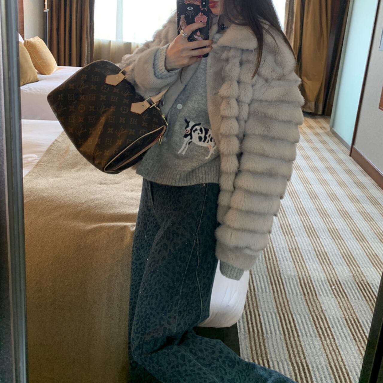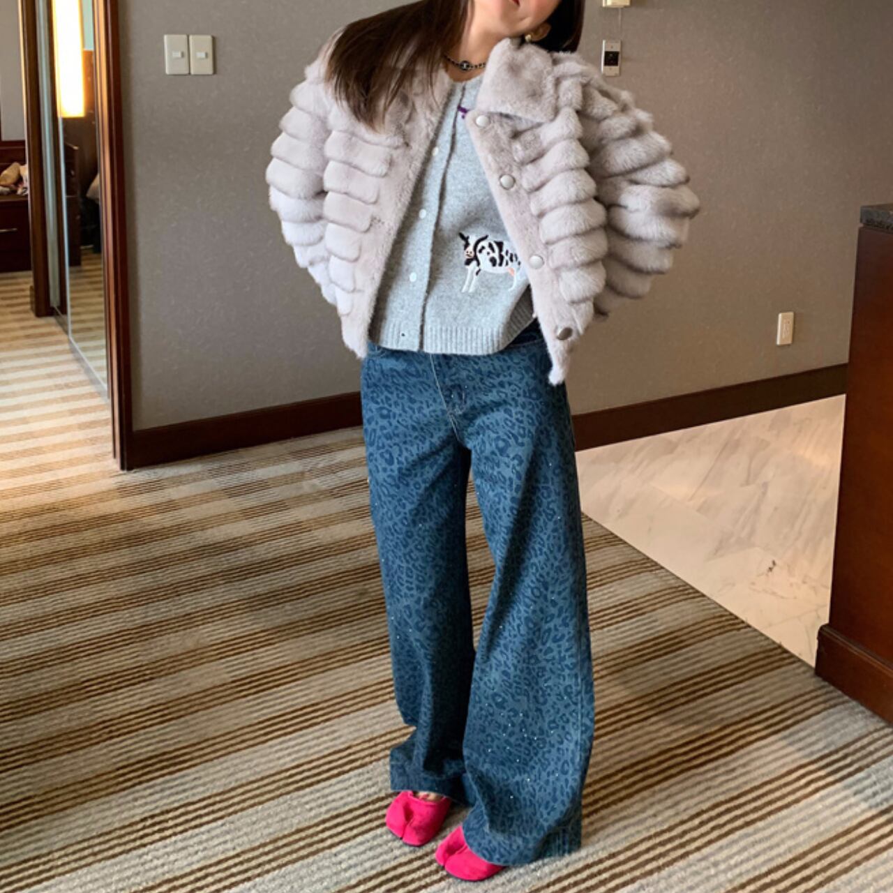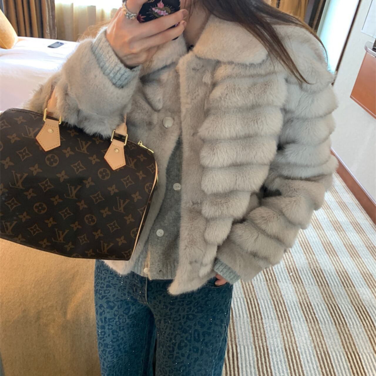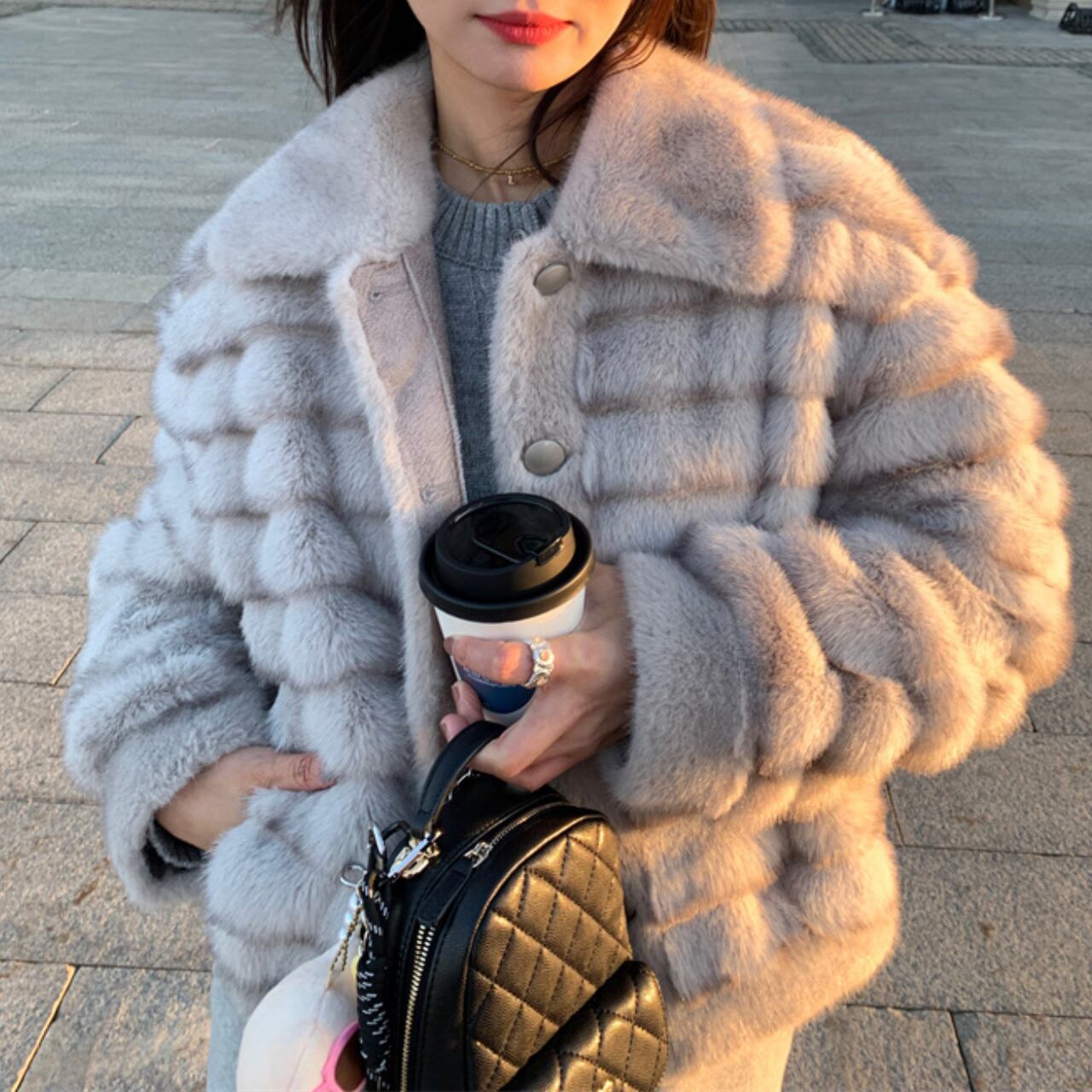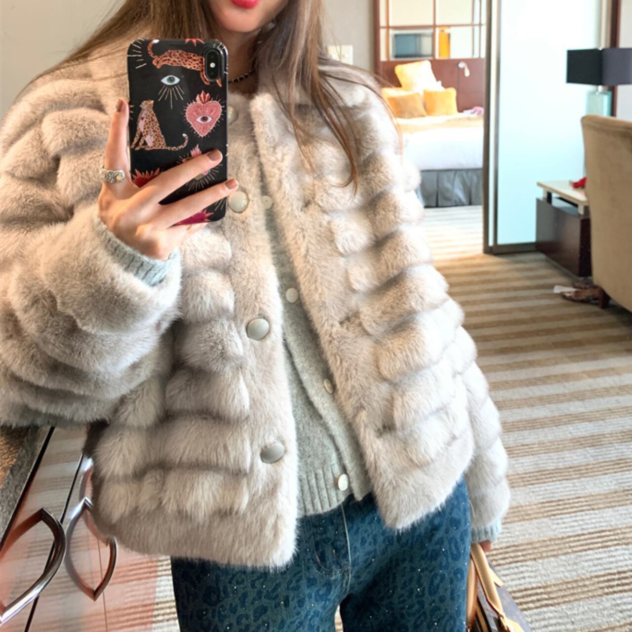 上品なライトグレーのフェイクファーを使用した、ラグジュアリーなショートジャケットです。