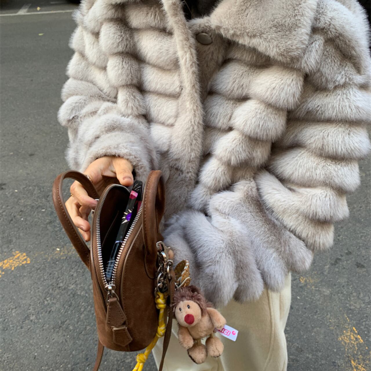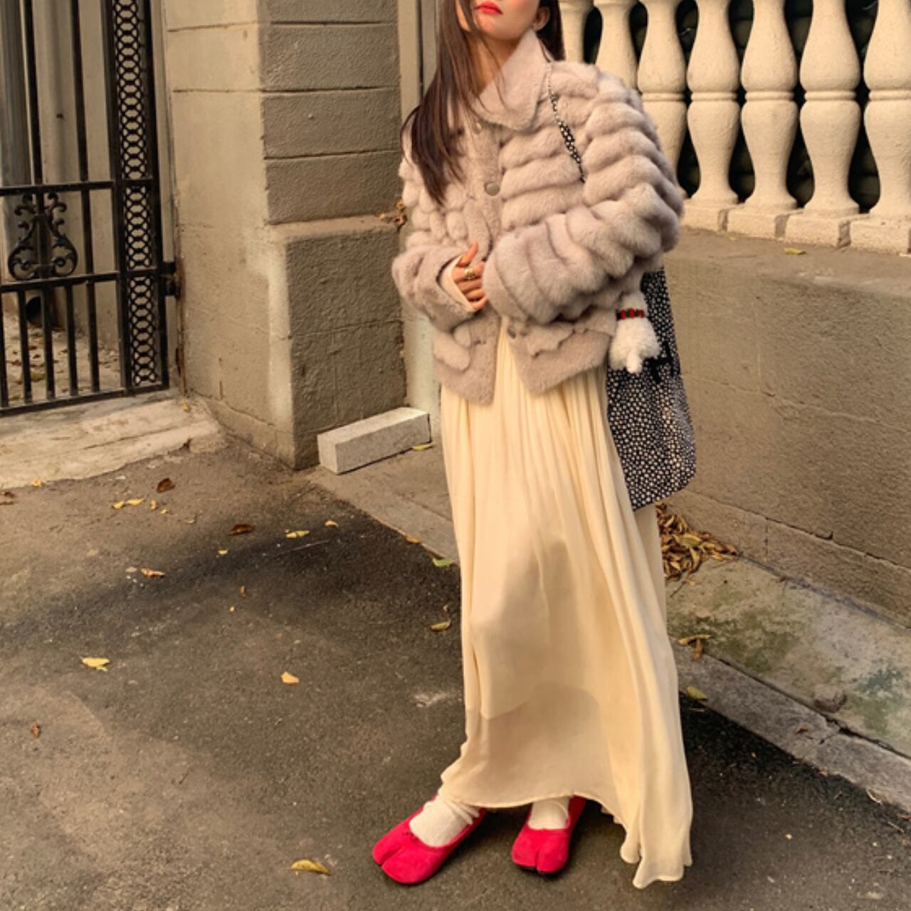 軽量で動きやすく、保温性も抜群なので、秋冬のお出かけに最適。写真のようにベージュのスカートと合わせたエレガントなスタイルから、デニムやパンツでカジュアルダウンした着こなしまで、幅広いコーディネートに対応します。