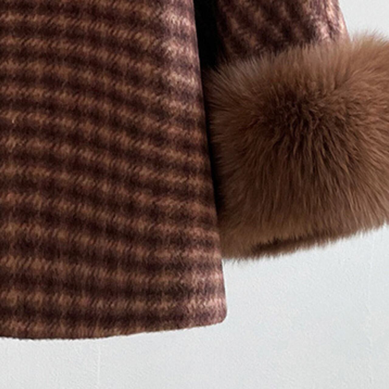 袖口にあしらわれたボリュームたっぷりのファートリムが華やかさをプラスし、動くたびに揺れる柔らかな質感が女性らしさを演出します。