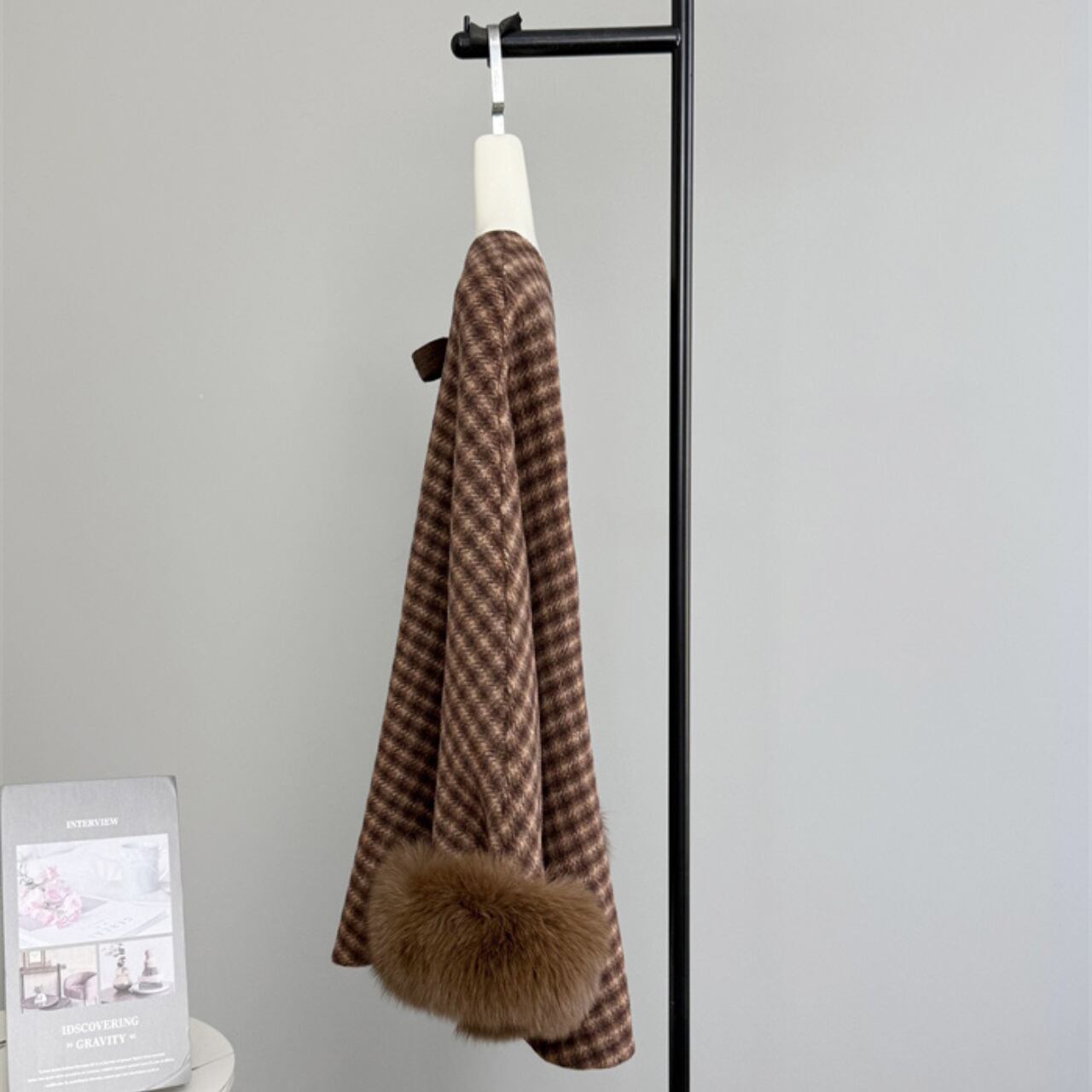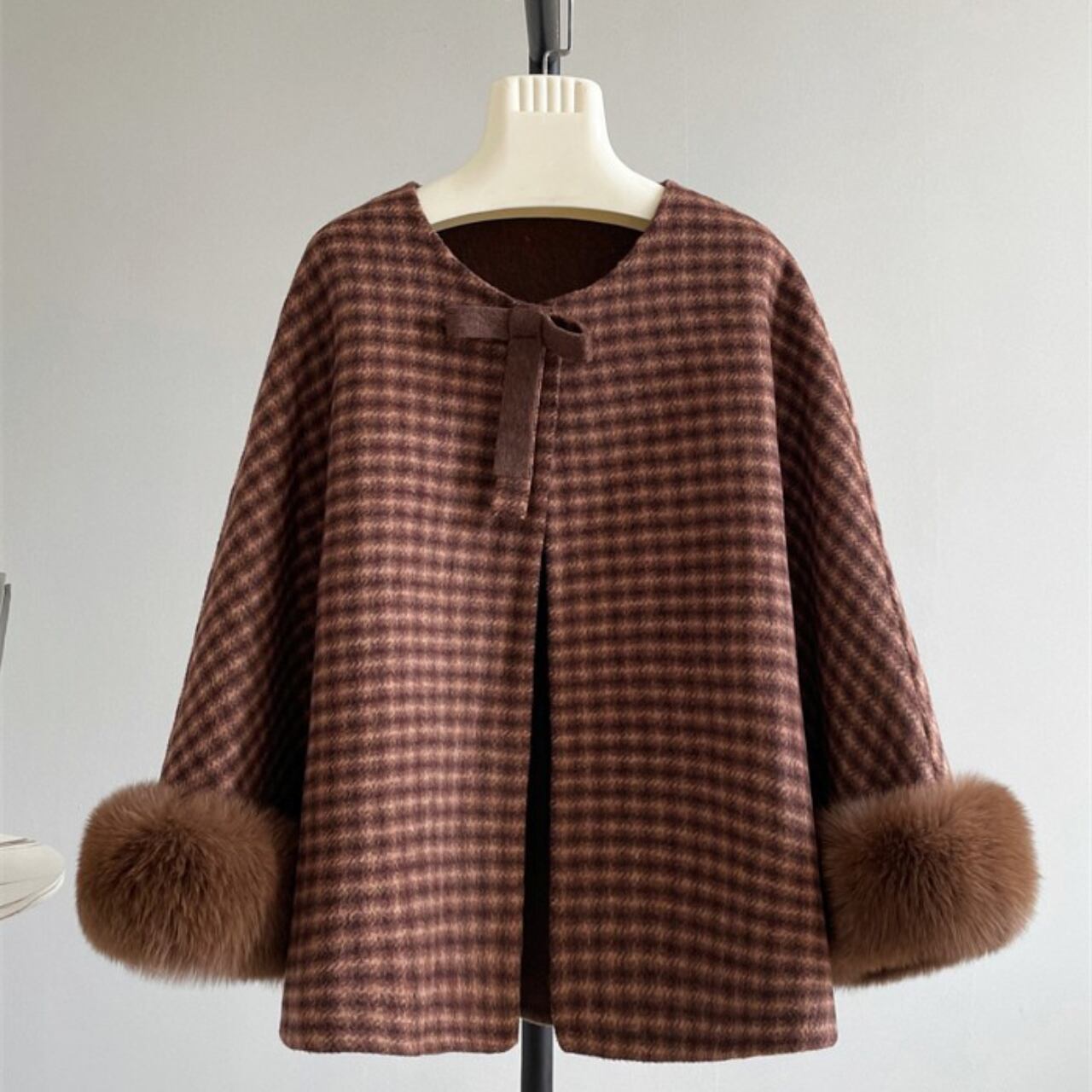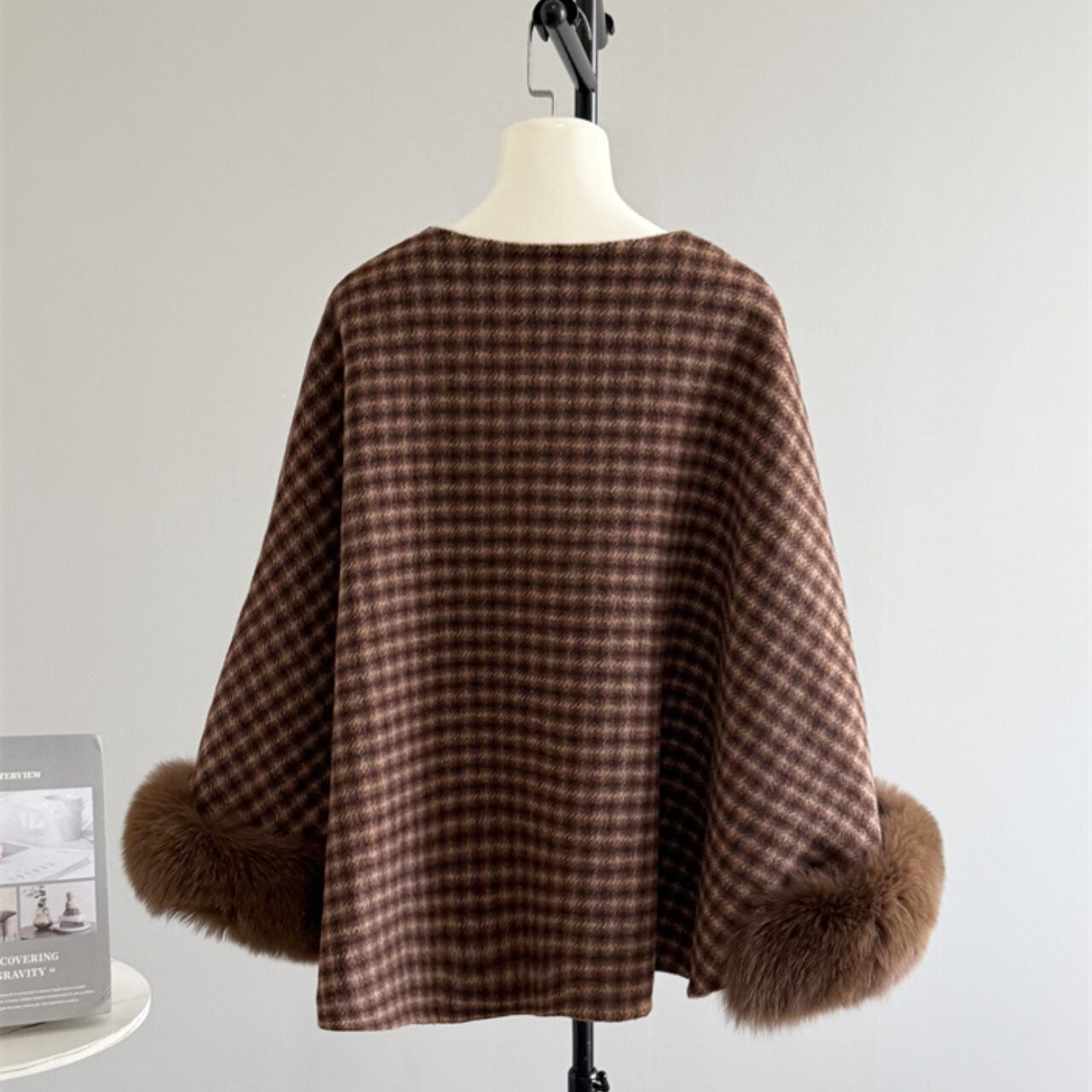 クラシカルなチェック柄が上品な印象を与える、ケープデザインのショートコートです。