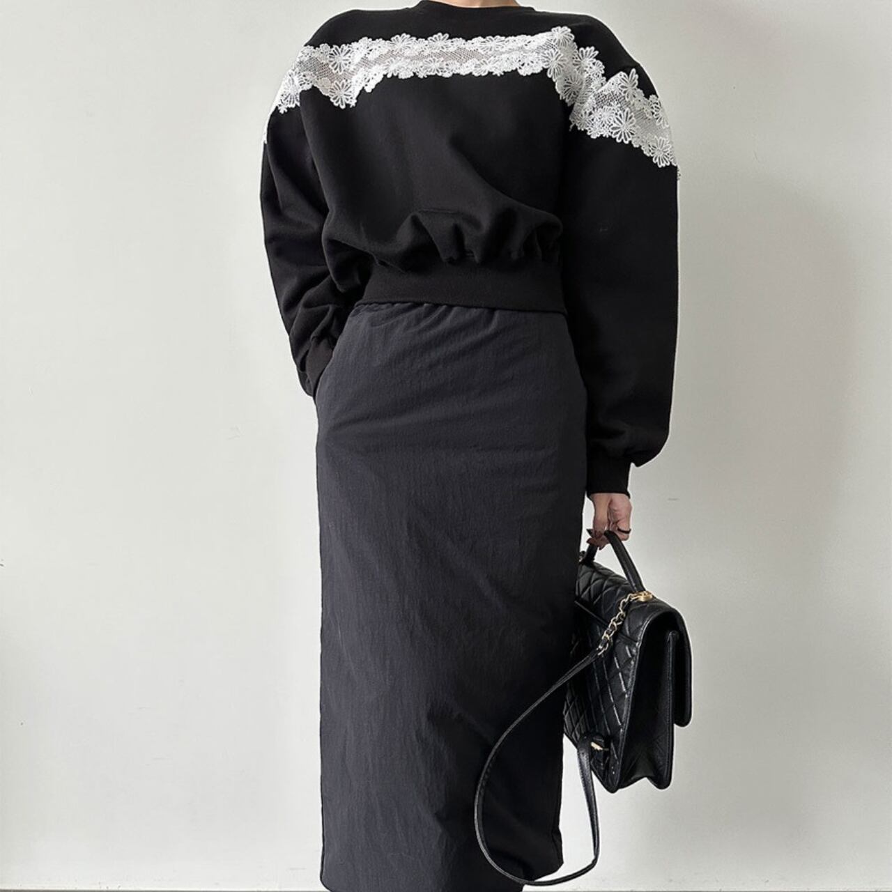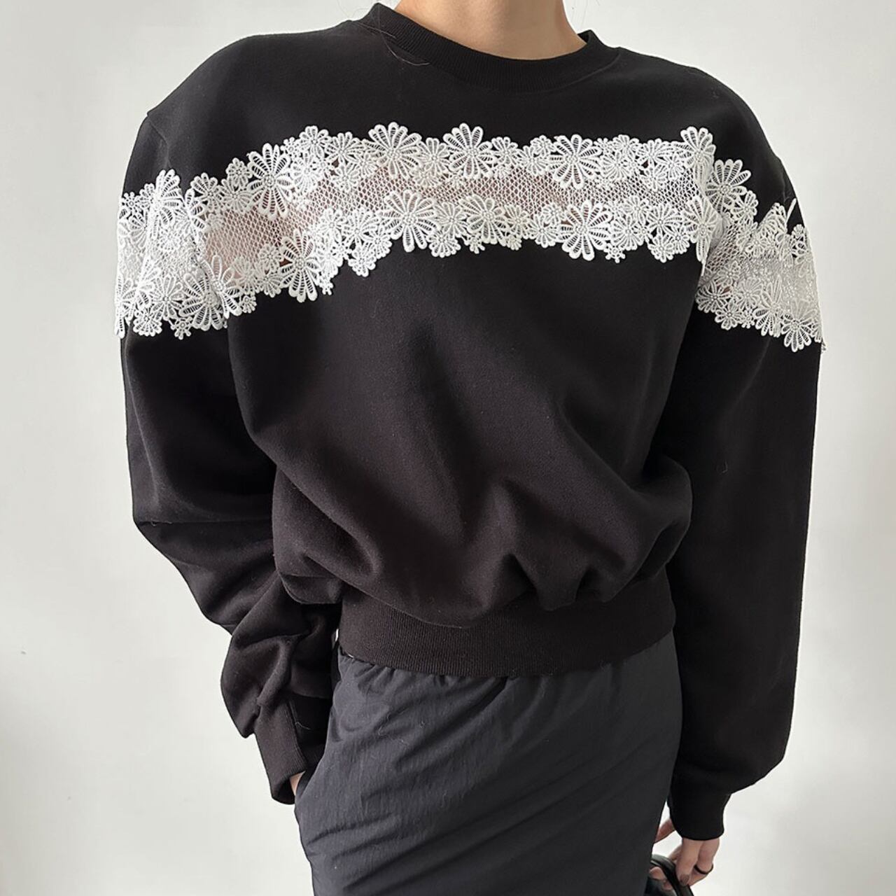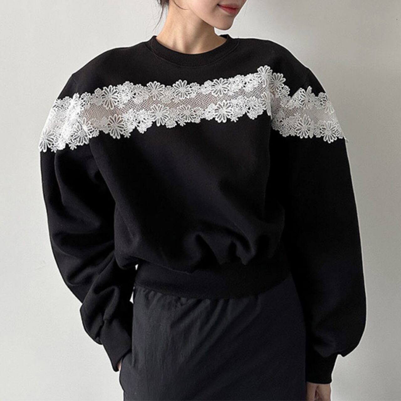 ブラックのスウェット素材に、胸元と彩る繊細なフラワーレースが目を引く、カジュアルとフェミニンが融合したスウェットトップスです。