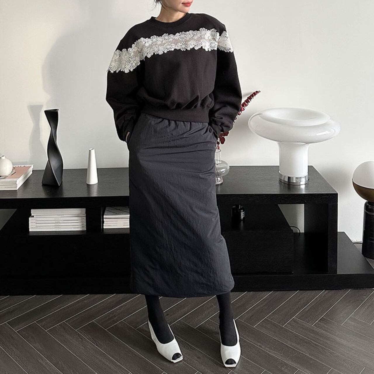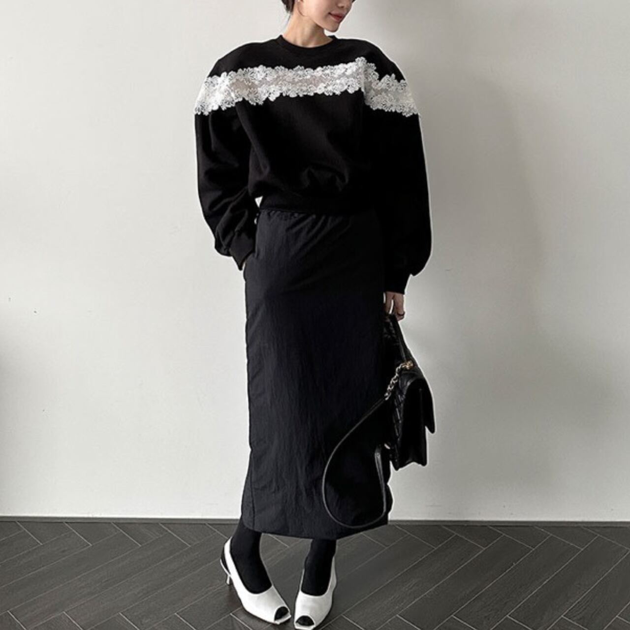 スウェット特有のリラックス感はそのままに、レースの透け感とフェミニンなディテールが特別感をプラス。「楽ちんだけど手抜き感は出したくない」そんな願いを叶えてくれる優秀なアイテムです。ゆったりとしたオーバーサイズシルエットが体型カバーにも効果的で、こなれた雰囲気を演出します。