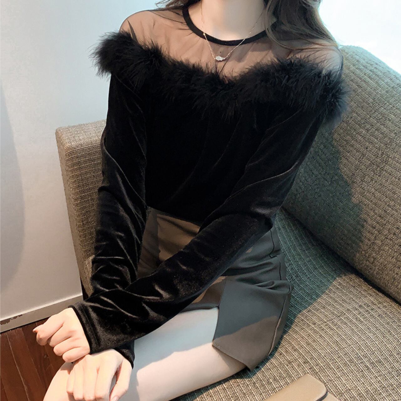 深みのあるブラックのベロア素材に、胸元のシアーチュールとファートリムを組み合わせた、ドラマティックでエレガントなトップスです。デコルテ部分の透け感が女性らしいセクシーさをプラスします。