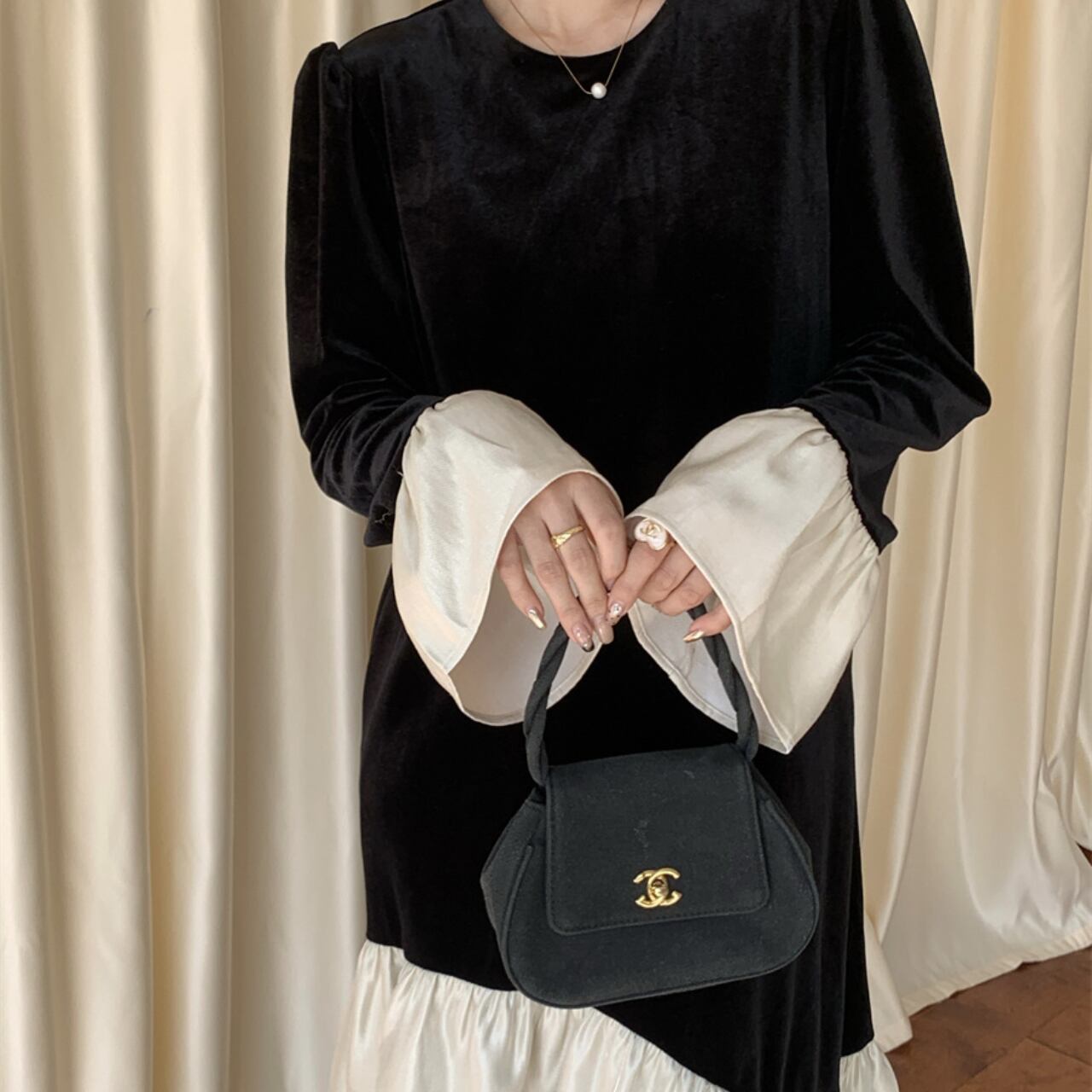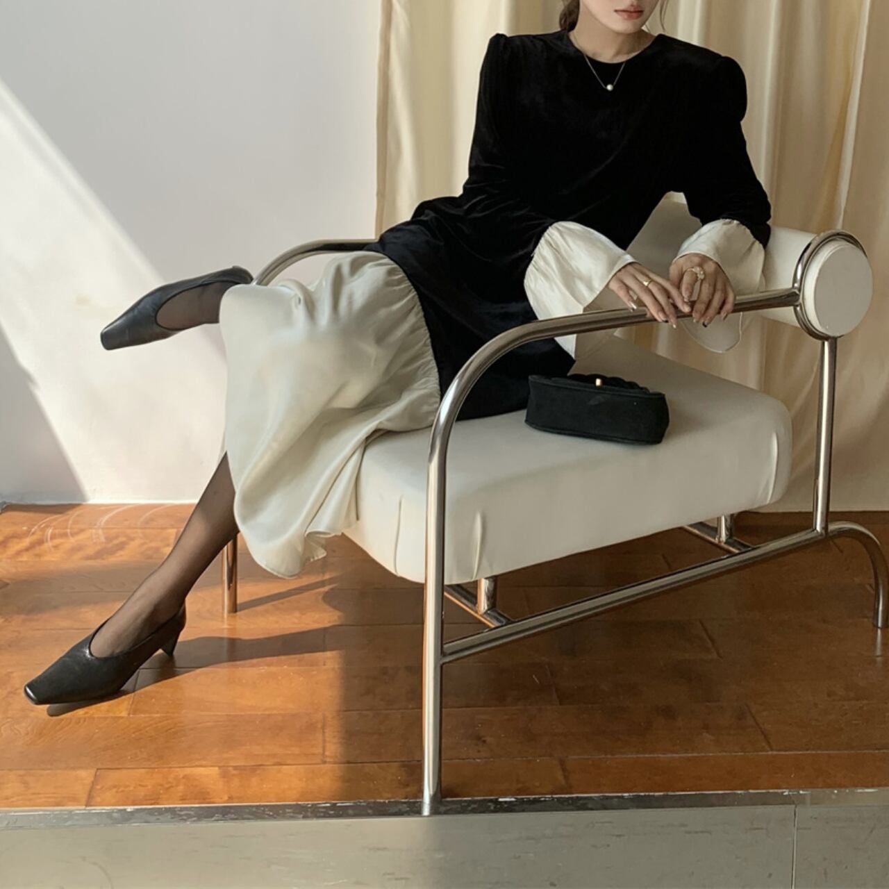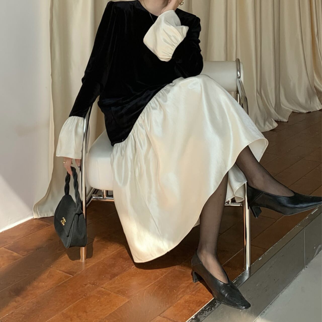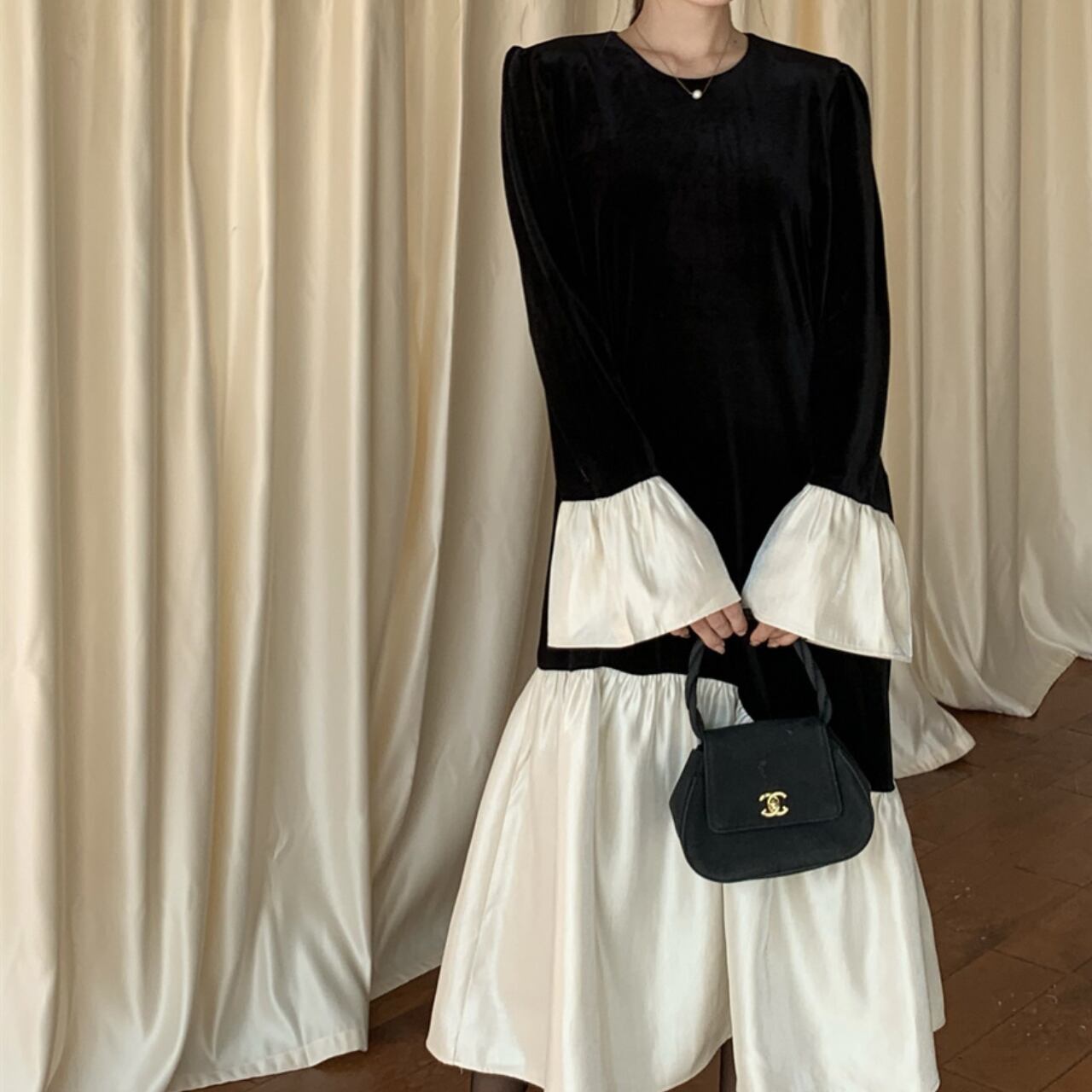 ブラックの生地に、クリーンなホワイトのフリルを組み合わせた、モノクロームのコントラストが美しいロングワンピースです。
