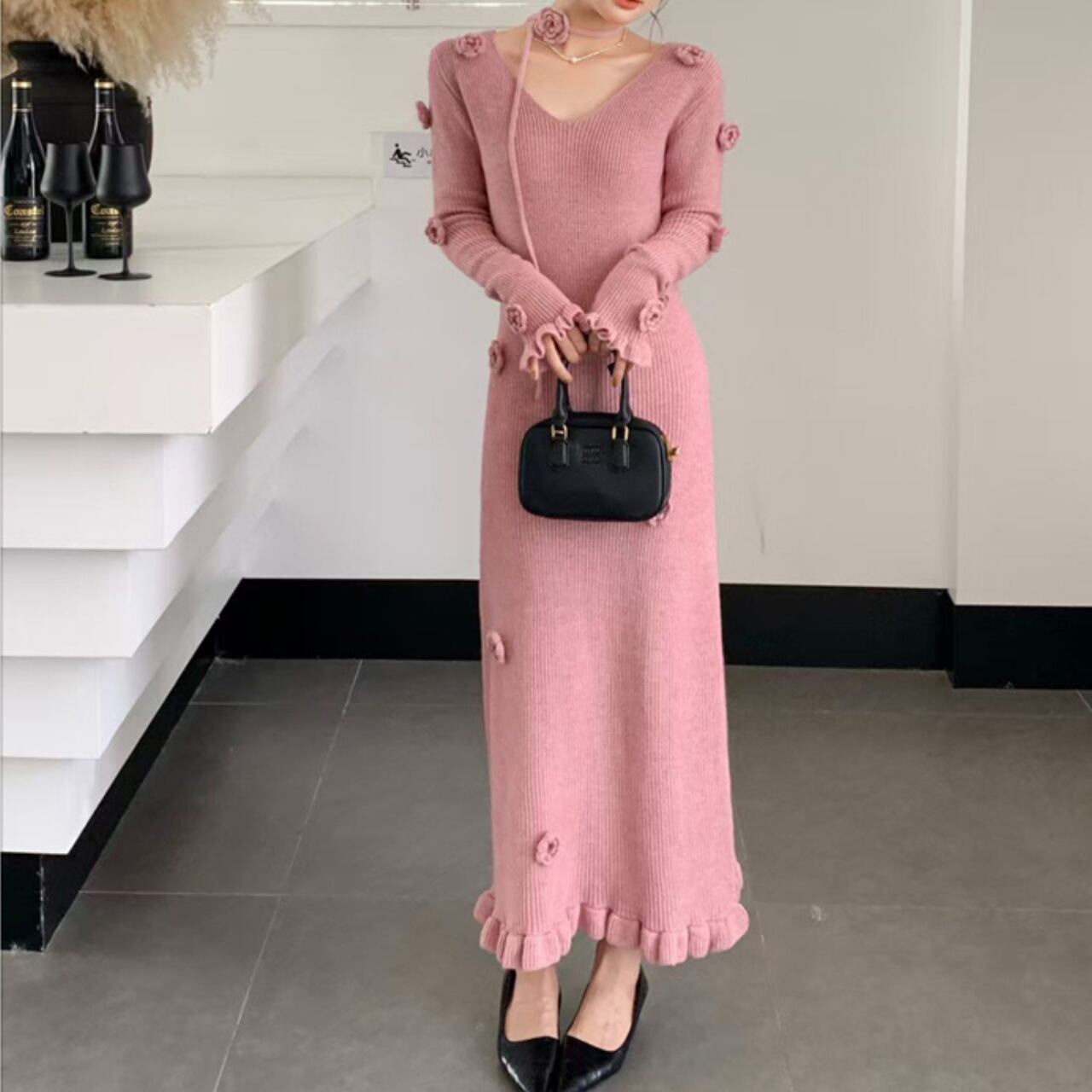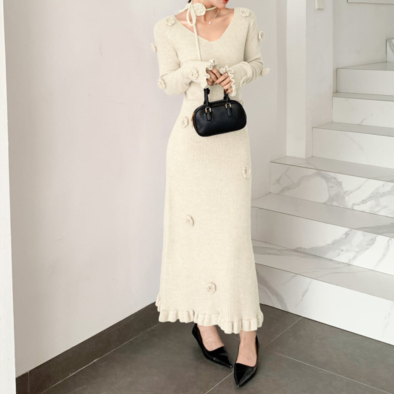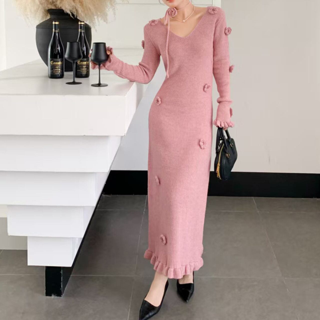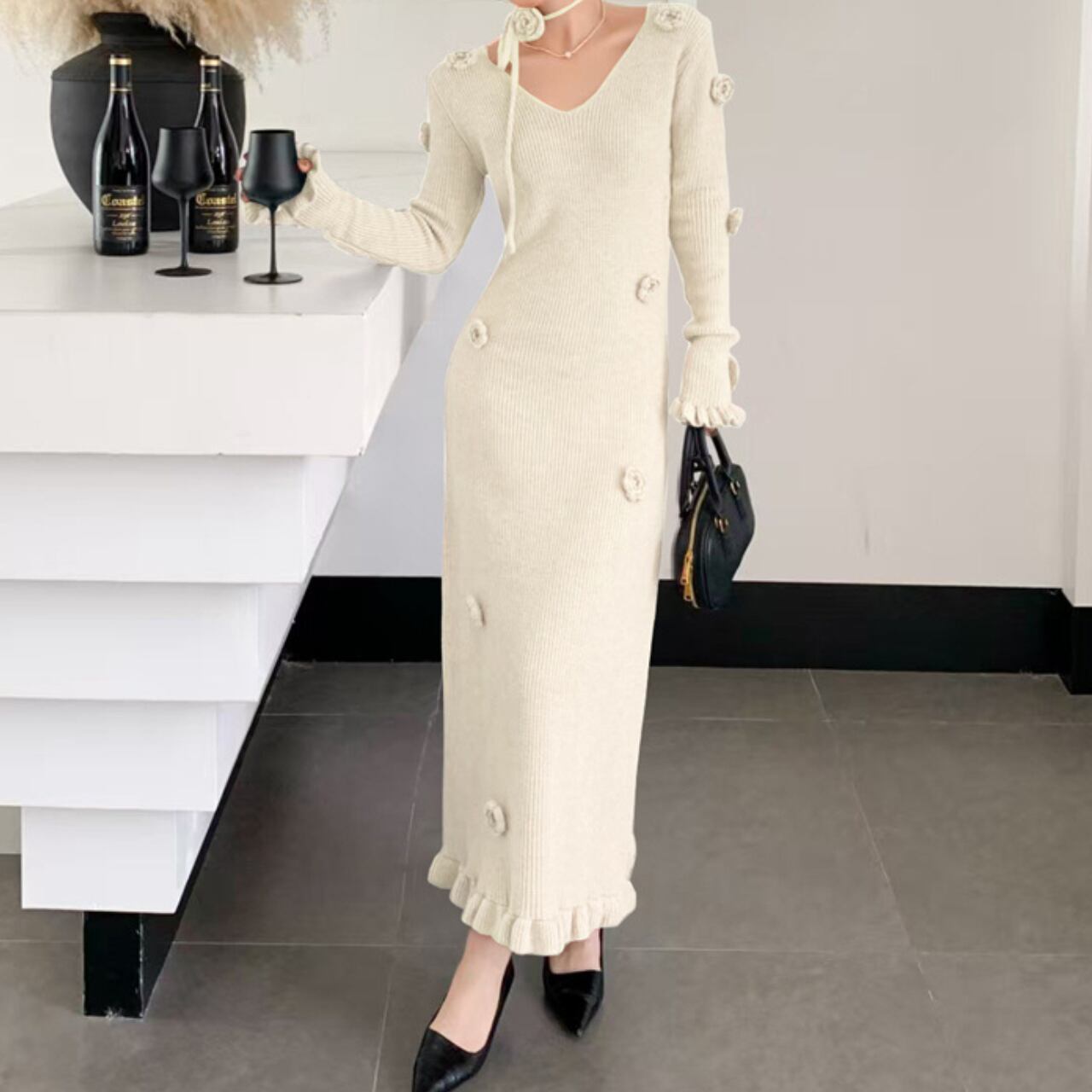 ニット素材が優しい印象を与える、ロマンティックなロングワンピースです。全体にあしらわれた立体的なフラワーモチーフとフリルディテールが、フェミニンで可愛らしい雰囲気を演出します。